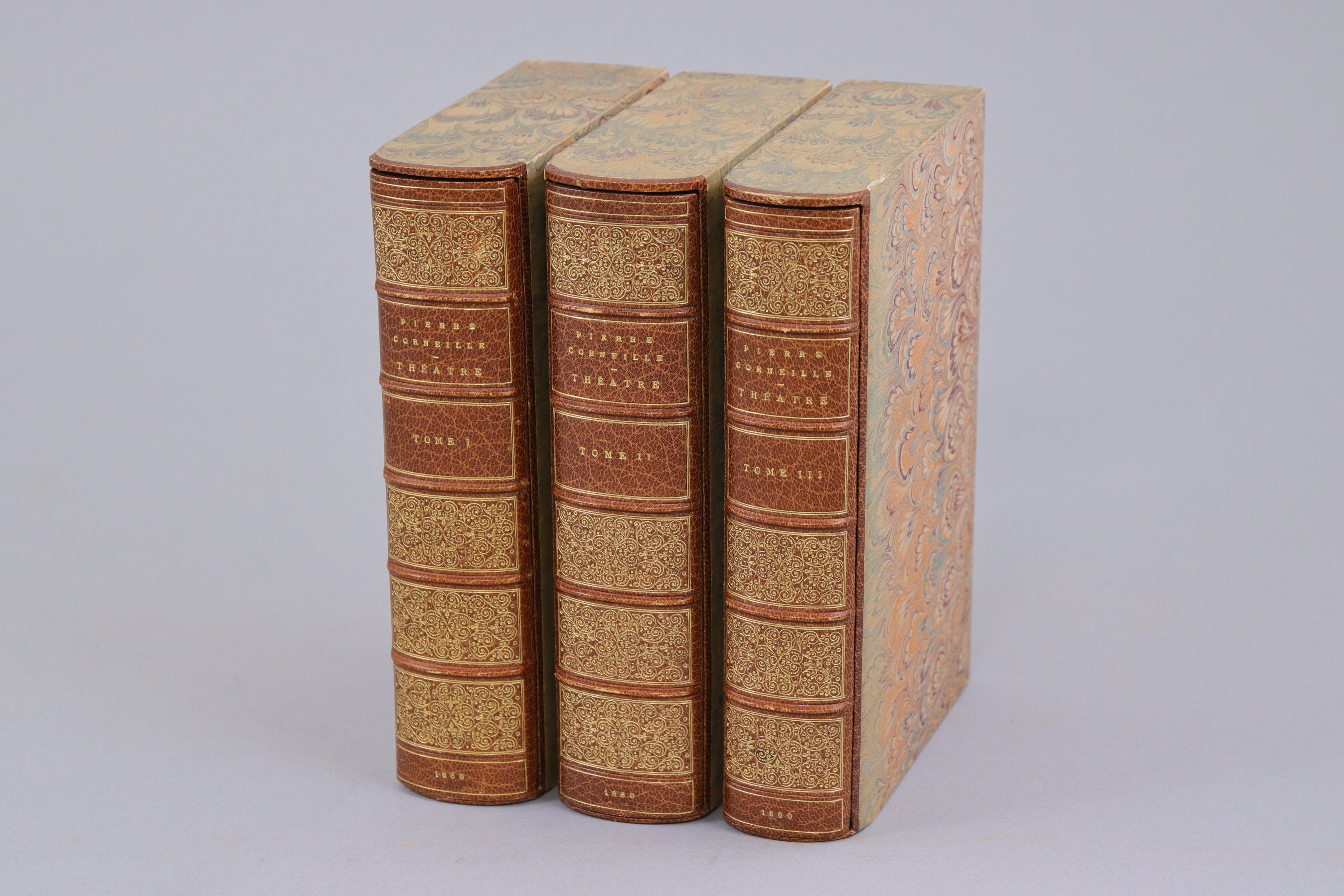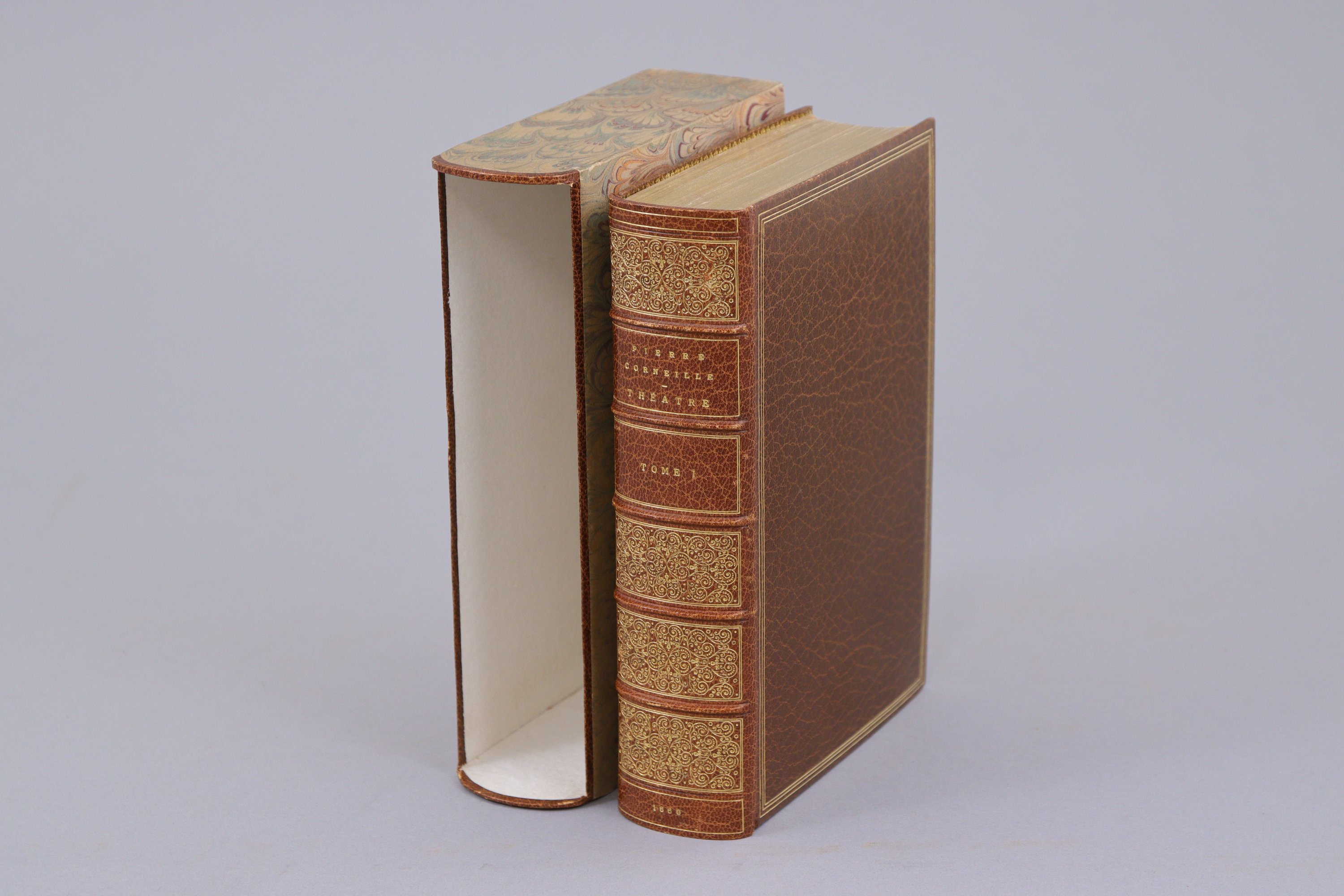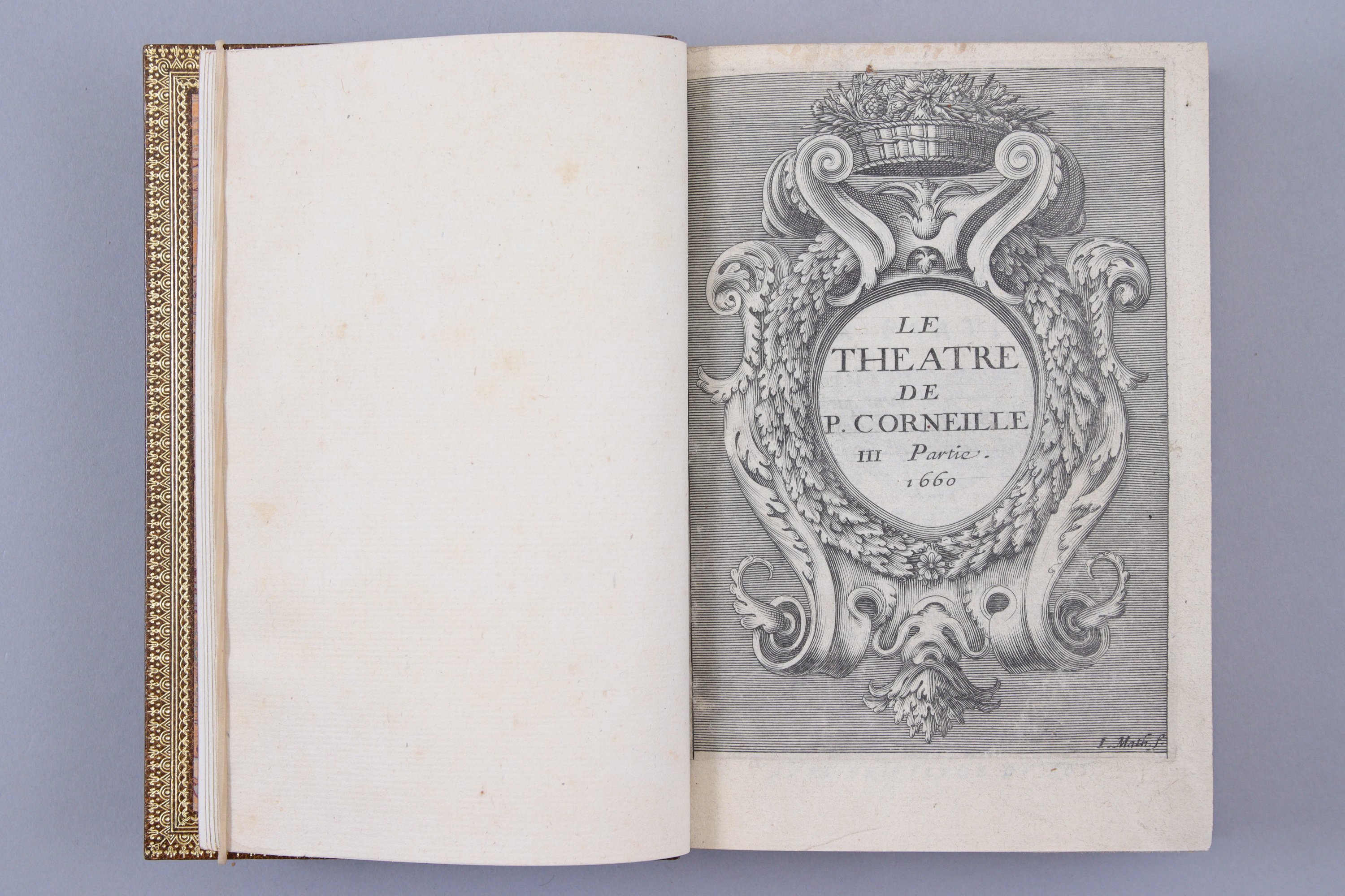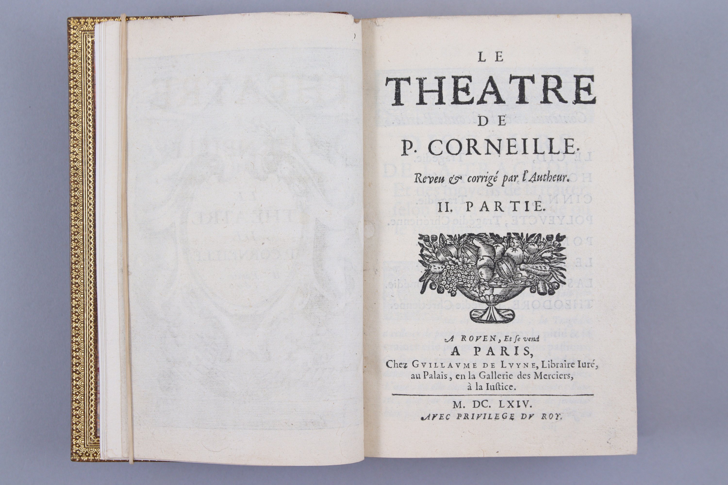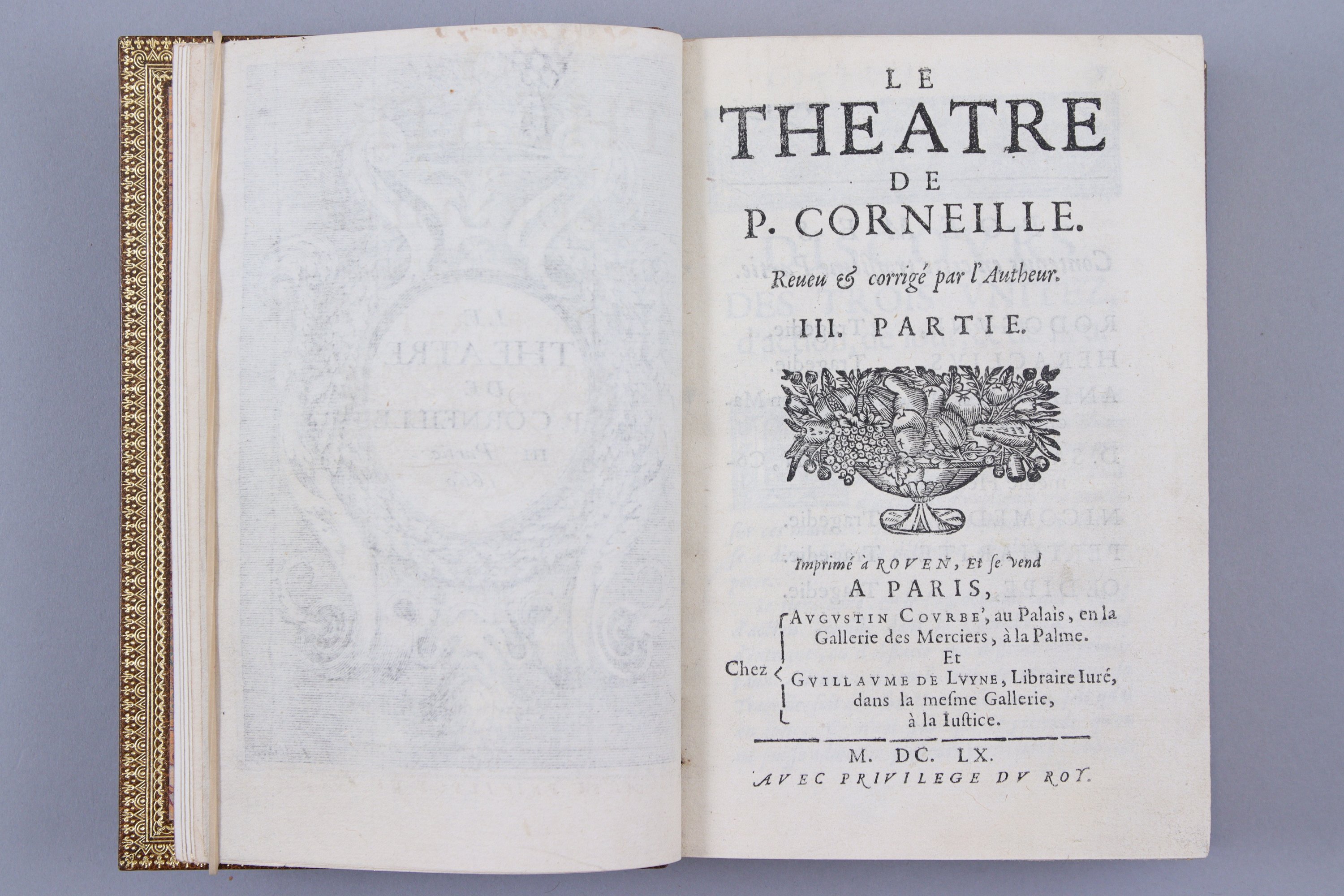 Edition considérée par Pierre Corneille comme la première Grande Edition de ses oeuvres. Trois frontispices gravés, et 23 figures sur cuivre gravées par Chauveau, David ou Matheus, illustrent les 23 pièces du théâtre complet, toutes revues et corrigées par l'auteur. Elles sont ici dans leur version définitive, et précédées d'un examen et d'un discours théorique écrits spécialement pour chacune d'entre elles, en édition originale.