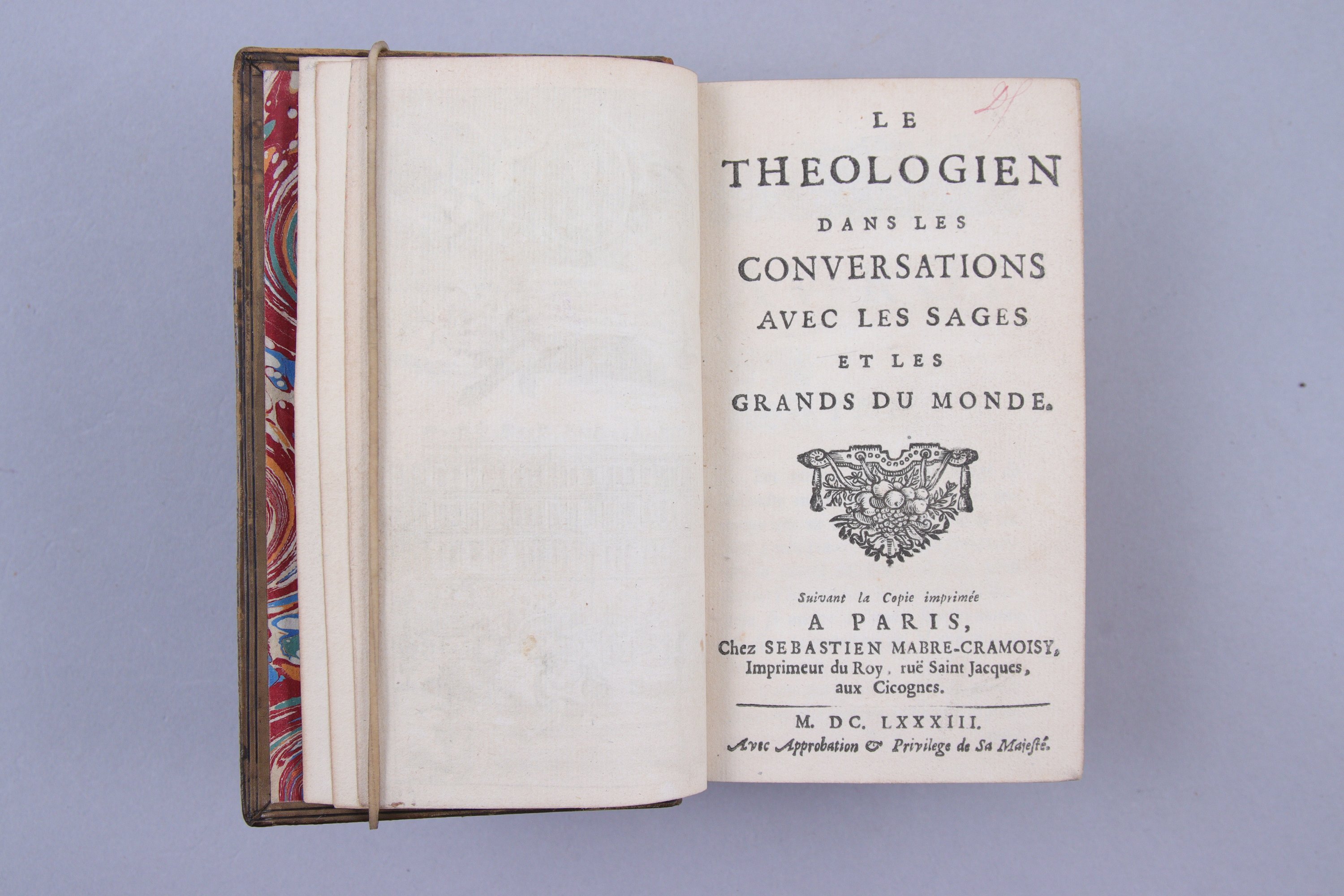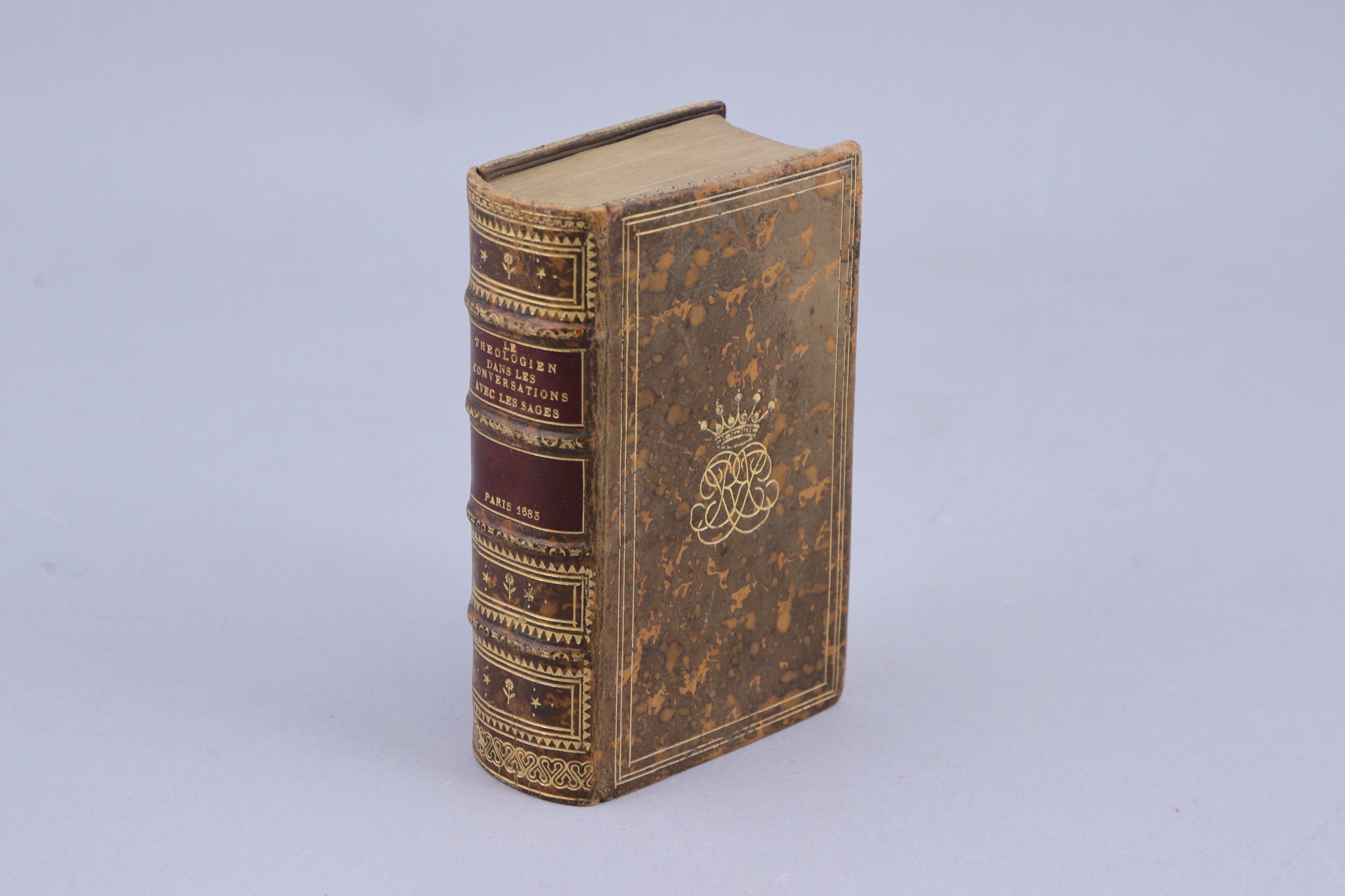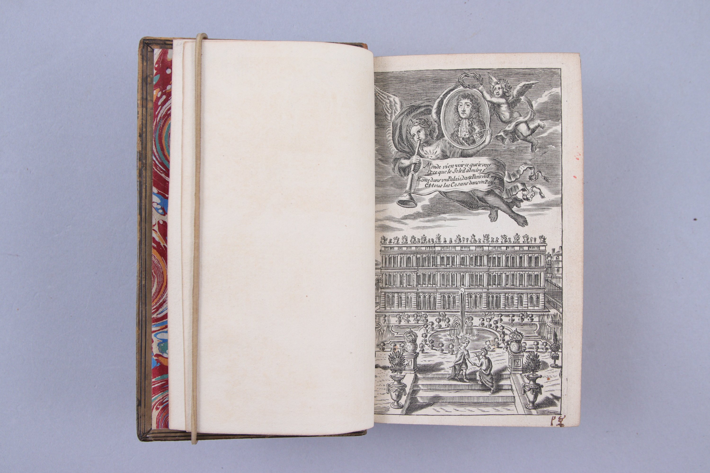 Petit in-12, (12 ff) dont un très beau titre-frontispice, 562 pages + table. Reliure pastiche en plein veau XIXème, triple filet d'encadrement, armes au centre des plats ; dos très orné. Toutes tranches dorées..