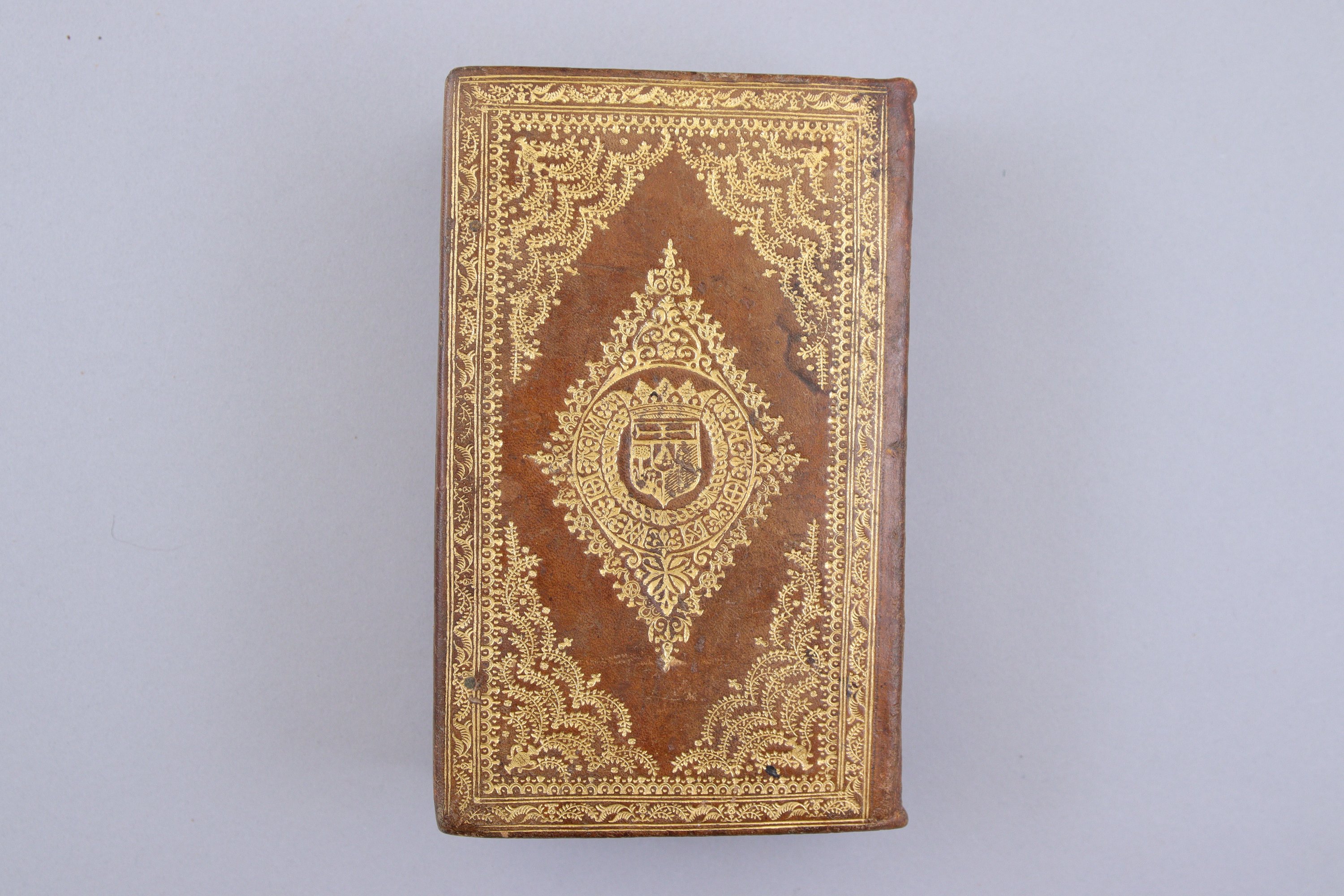 Plein maroquin fauve. Bordure de petits fers "au rameau d'olivier" inscrite entre deux encadrements de filets doubles et une finr roulette . Large décor composé dans chaque angle d'une vasque d'où sort une vingtaine de fers "au rameau d'olivier", de taille moyenne. Large décor losangé central aux petits fers, dans lequel sont inscrites les armes du Duc d'Epernon.