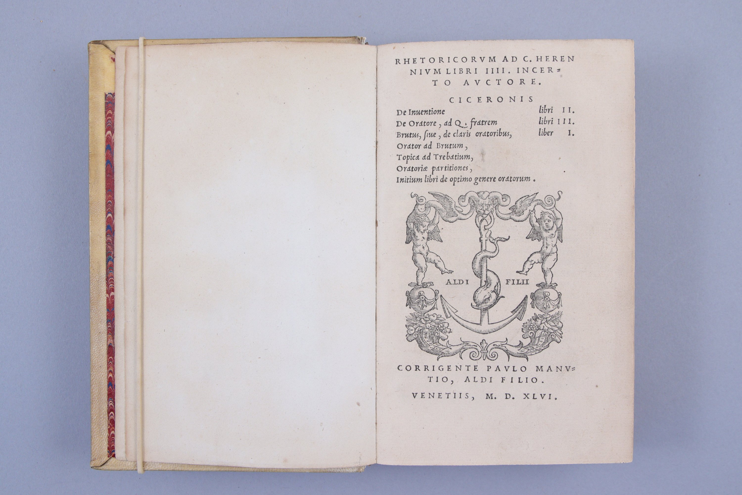 Rhetoricorum ad C. Herennium libri IIII incerto auctore. Ciceronis De Inventione libri II. De Oratore ad Q. fratrem libri III. Brutus sive de claris oratoribus liber I. Orator ad Brutum. Topica ad Trebatium. Oratoriae partitione. Initium libri de optimo genere oratorum.