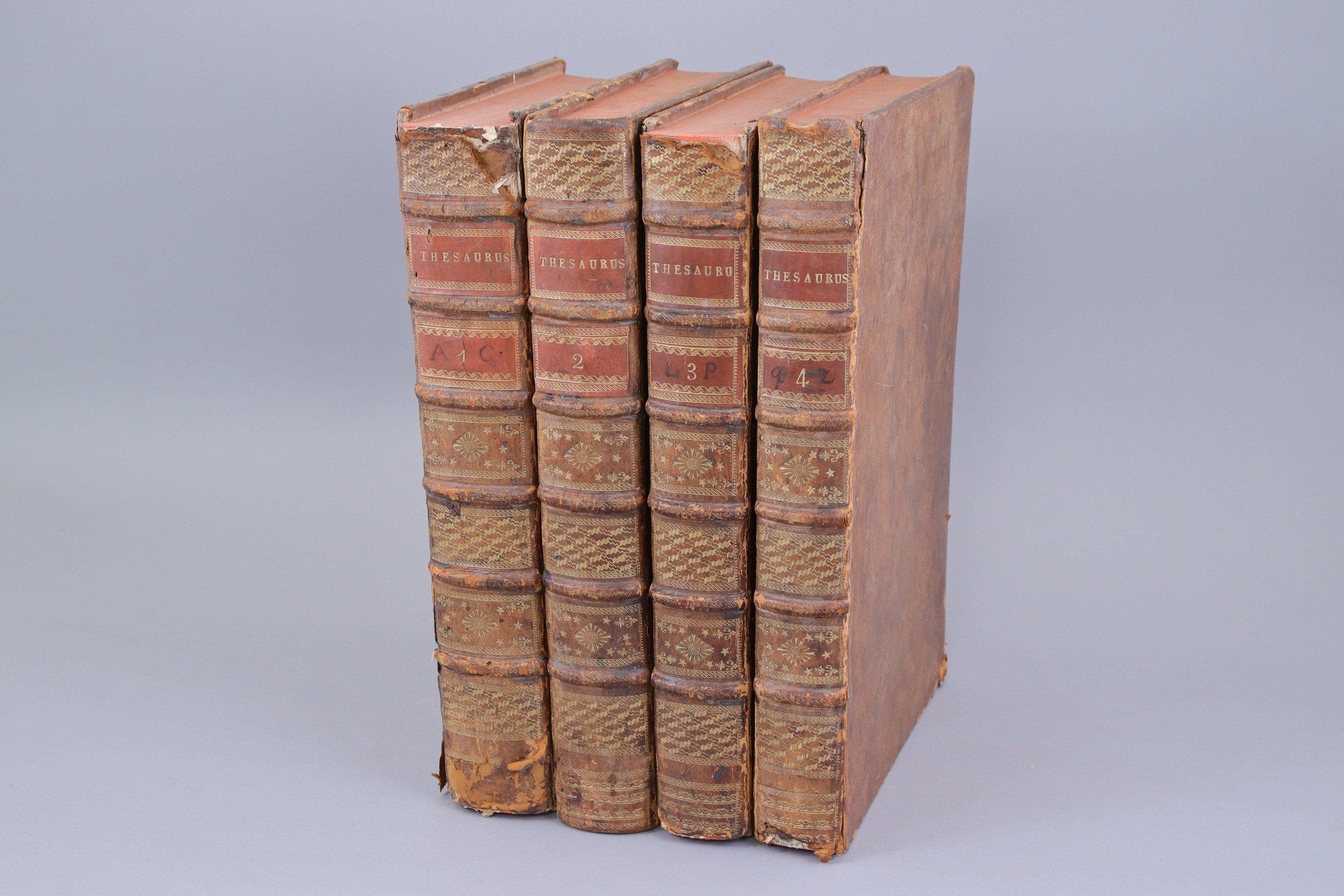 4 forts volumes grand in-folio. Basane du temps, dos ornés. Reliures solides. (Défauts aux coiffes, aux coins, aux mors).