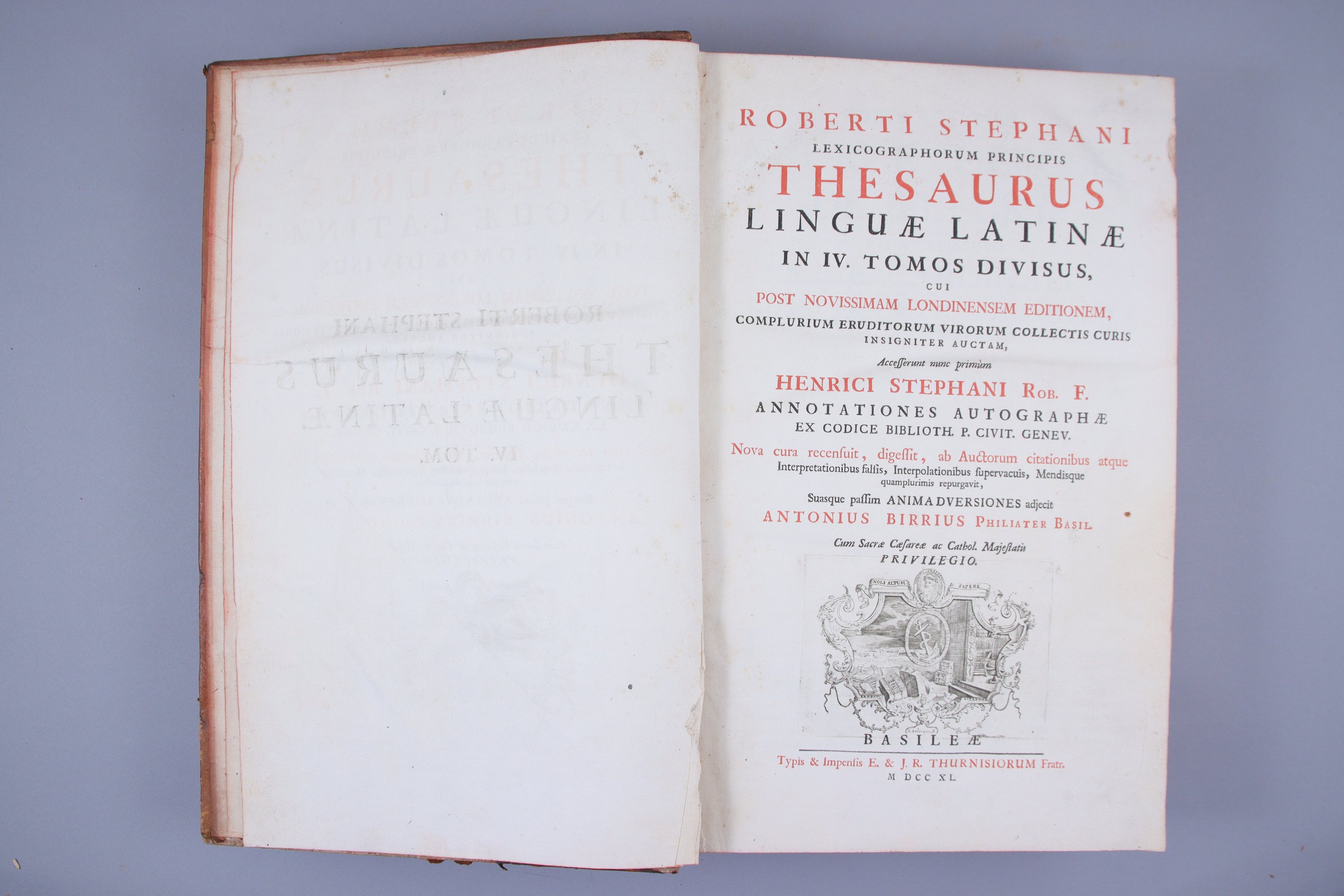 Thesaurus linguae latinae in IV tomos divisus, cui post novissimam londinensem editionem ...accesserunt nunc primum Henrici Stephani Rob. f. annotationes autographae ex codice bibliothecae P. civit Genev..