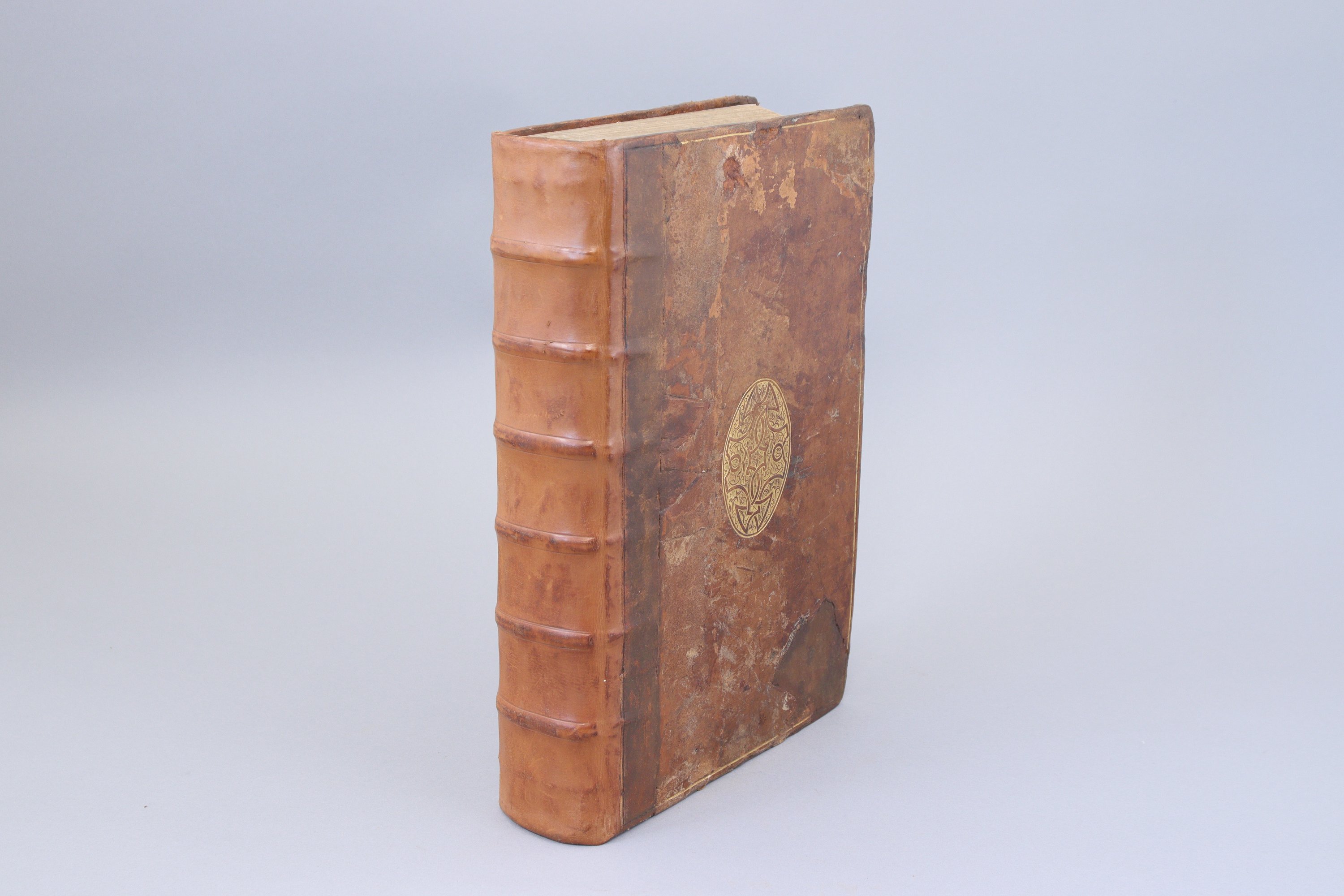 2 parties avec titre et collation séparés en 1 fort volume in-folio. (8 ff), 812 pages, (16 ff) de table: 344 pages, (5 ff) 63 pages, (1 page). Plein veau fauve avec large olive d'arabesques au centre des plats (Epidermures sur les deux plats. Le dos a été très maladroitement refait ; les gardes ont été changées. Galerie de vers dans la marge de queue, touchant un peu le texte sur les derniers feuillets)..