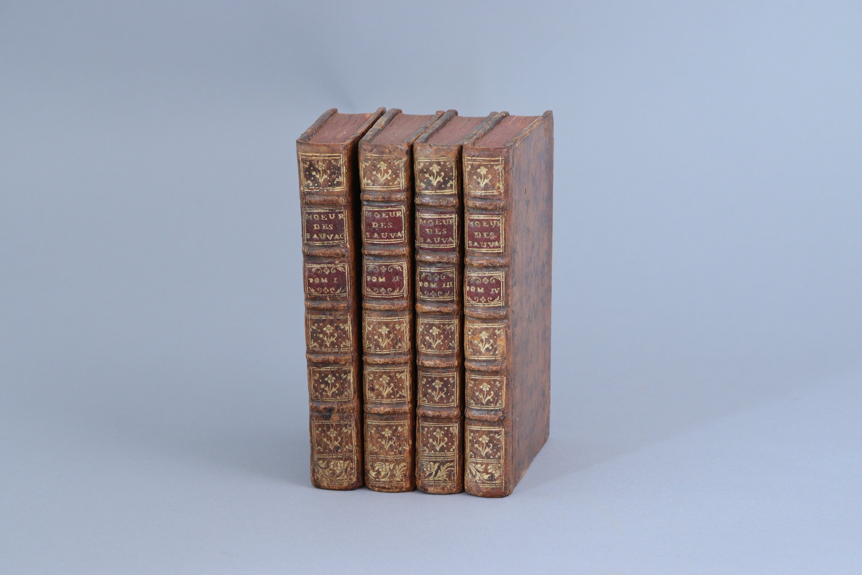 4 volumes in-12. (12 ff) et 256 pages ; (8 ff) et 296 pages ; (2 ff) et 248 pages ; (4 ff), 196 pages et (33 ff) pour la table alphabétique. Plein veau raciné du temps. (Plusieurs cahiers du tome III légèrement roussis).