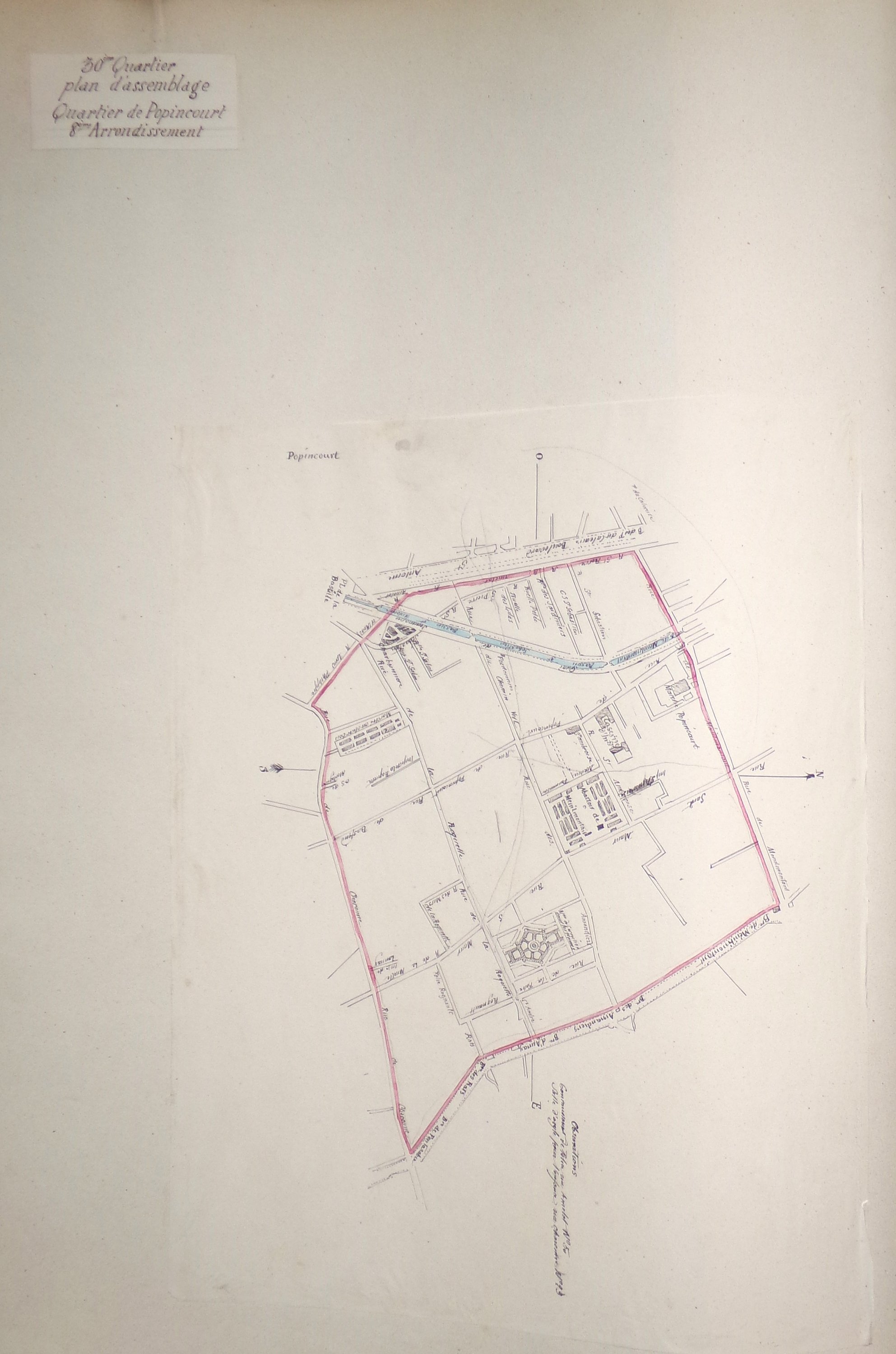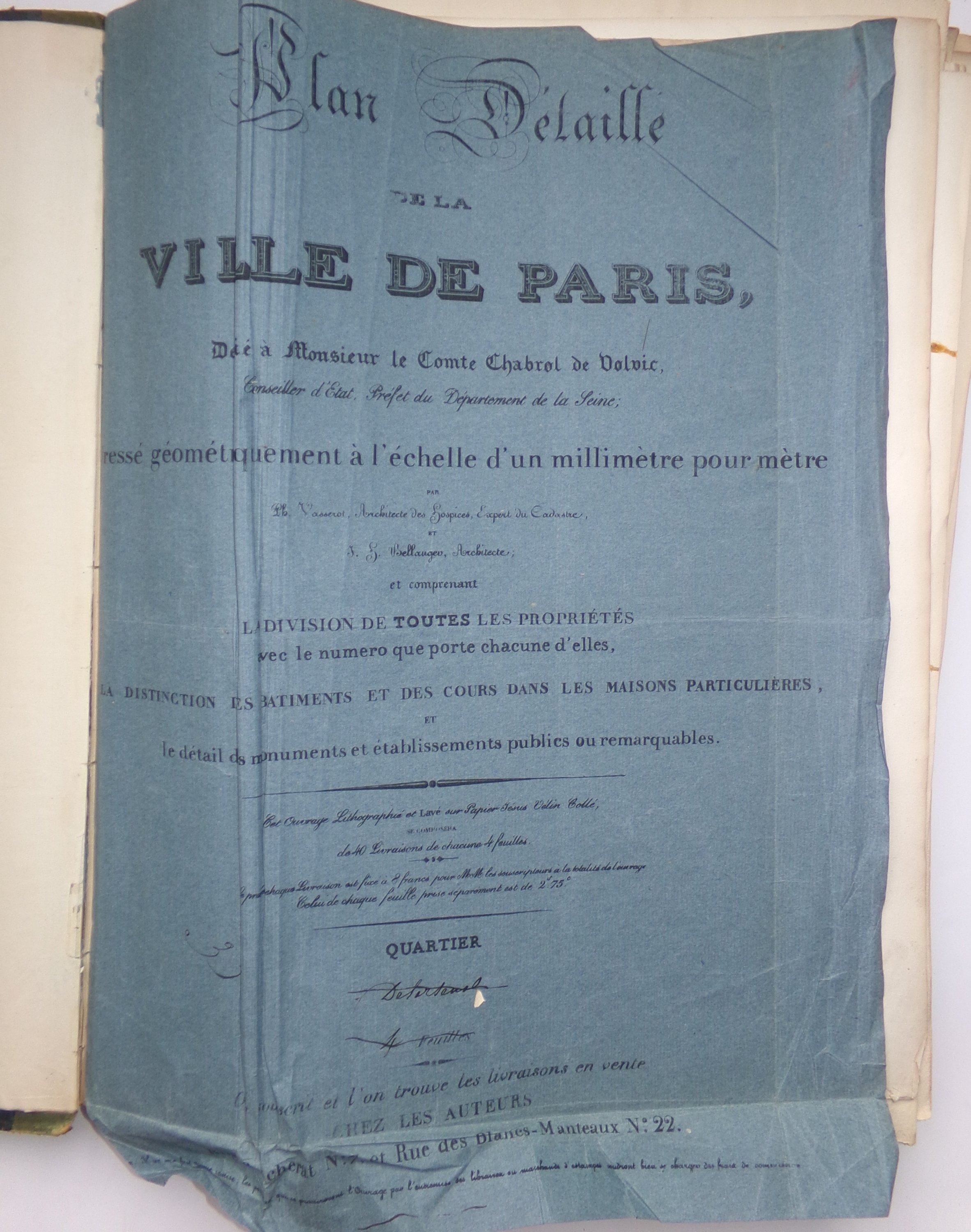 Ce premier plan parcellaire gravé de Paris avait pour ambition de reproduire les 48 quartiers de Paris. Seuls 37 quartiers ont été publiés, livrés à l’époque sous chemises bleutées imprimées de chacune 4 feuilles, formant un atlas de 3 vol. contenant au total 155 planches.
