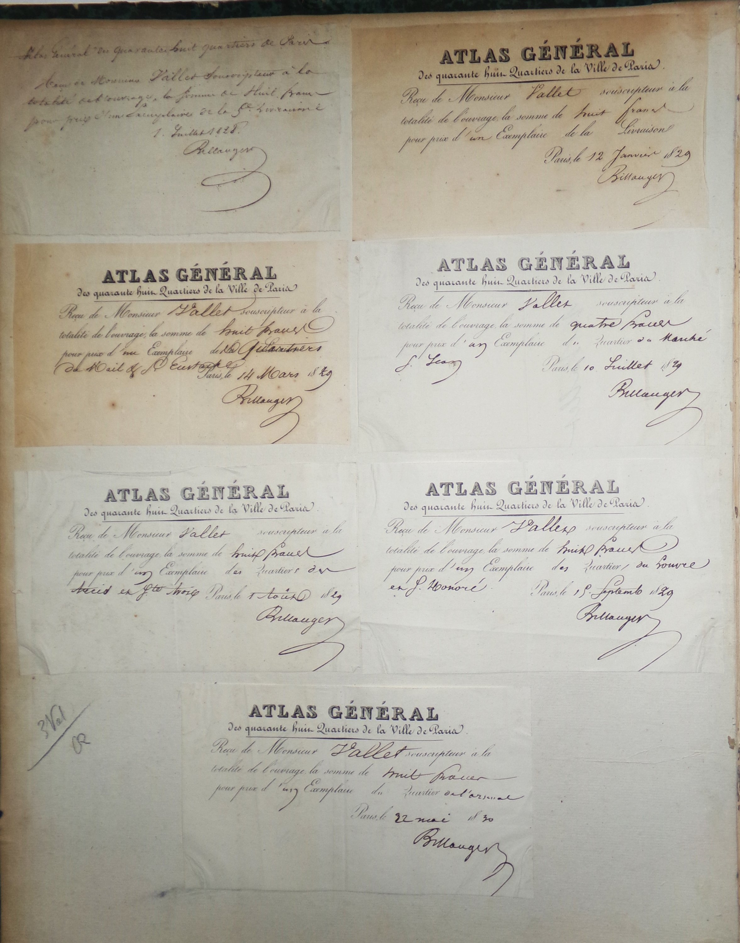 Contrecollés sur la 2e de couverture: 7 reçus de souscription signés par J.H. Bellanger et remis à M. Vallet, 1828-1830 ; et sur la 1ère page: prospectus de présentation de 1826 et tableau manuscrit détaillant la répartition numérotée par quartier et le nombre de planches pour chaque quartier.