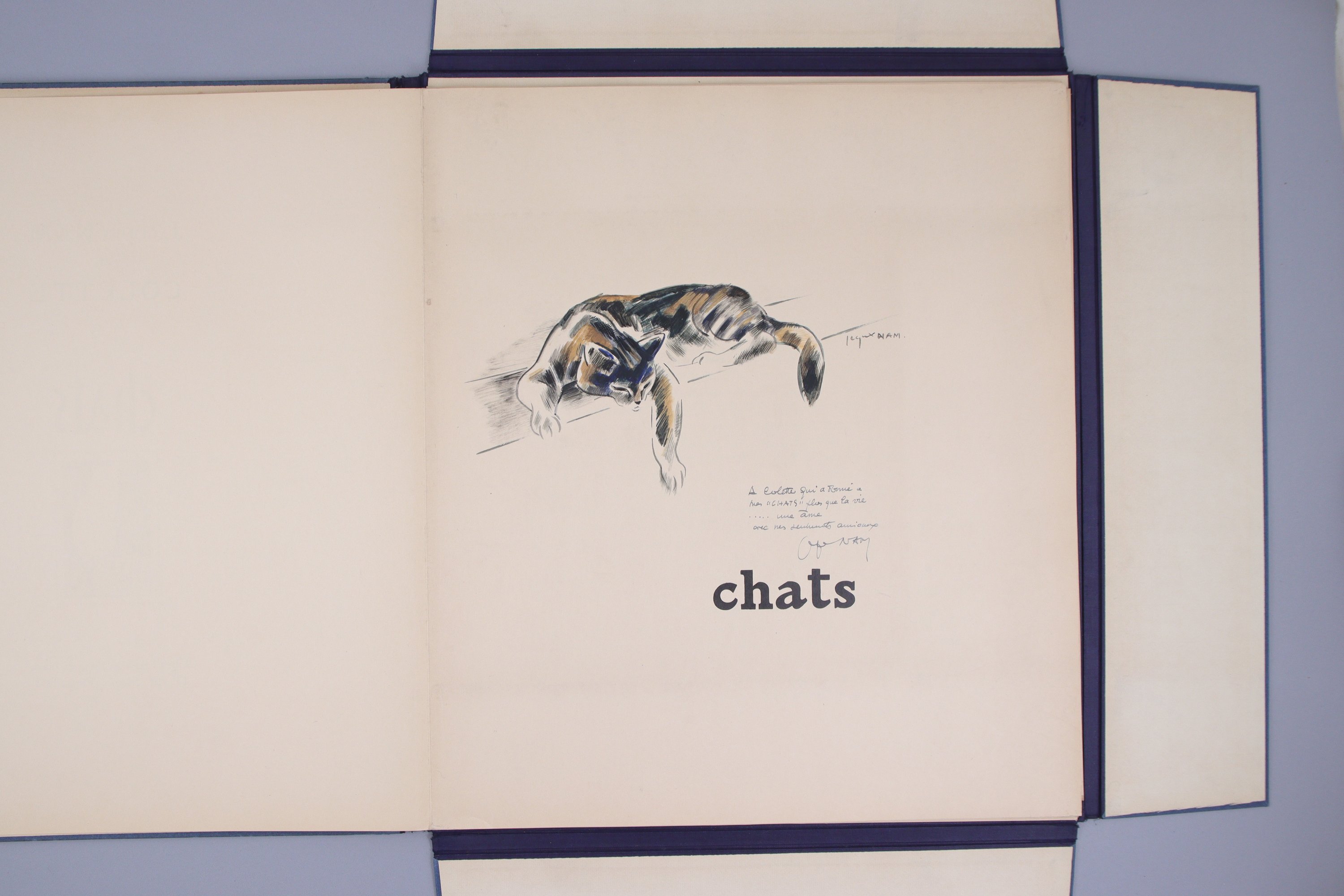 Sans doute le plus désirable des exemplaires de cet ouvrage, qui passe pour un des plus beaux livres animaliers du XXème siècle: il a été offert à Colette par Jacques Nam, deux ans après la publication d'un des plus beaux romans de l'écrivaine, "La chatte".Il porte cet envoi sur la 3ème page: