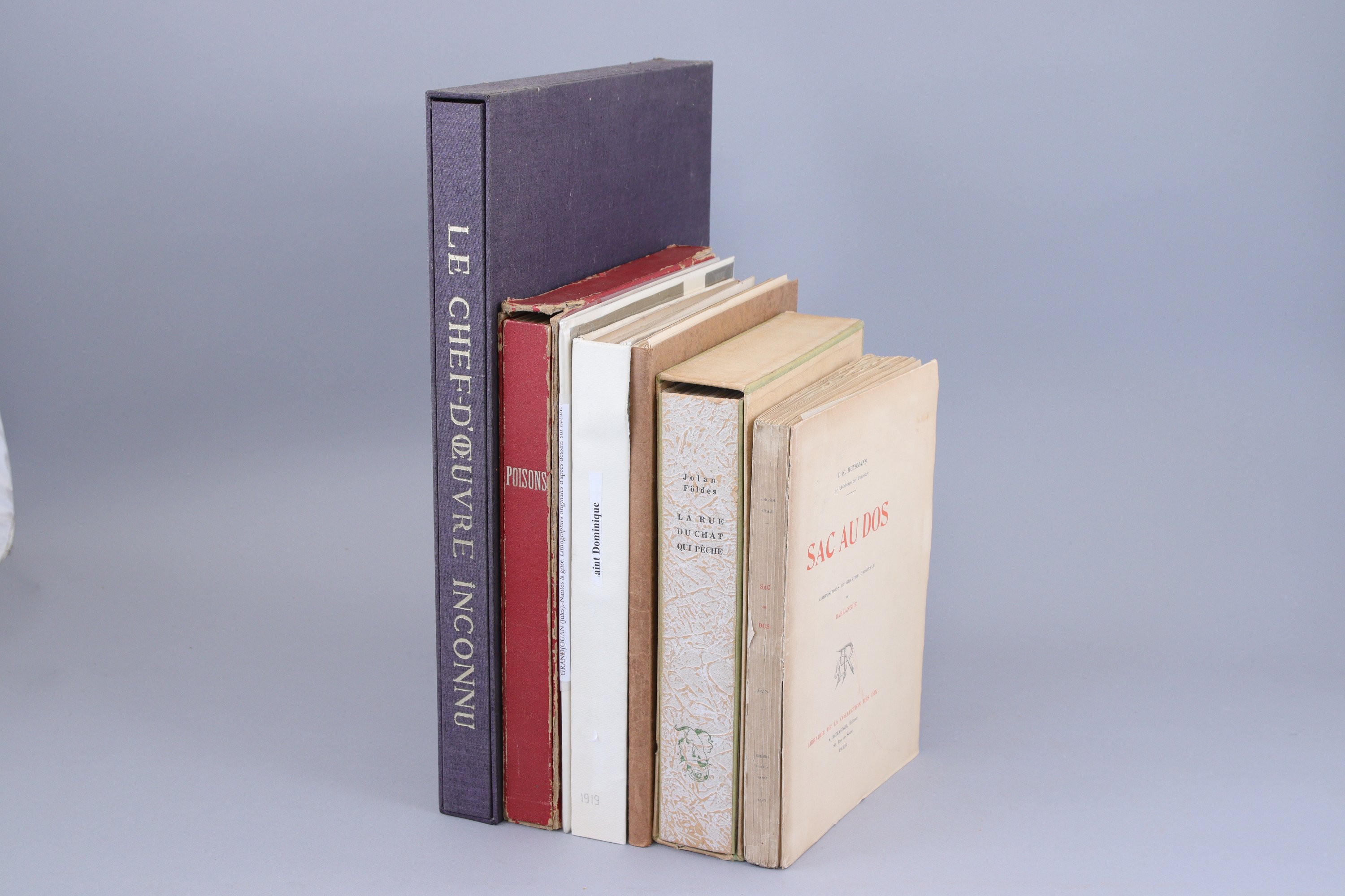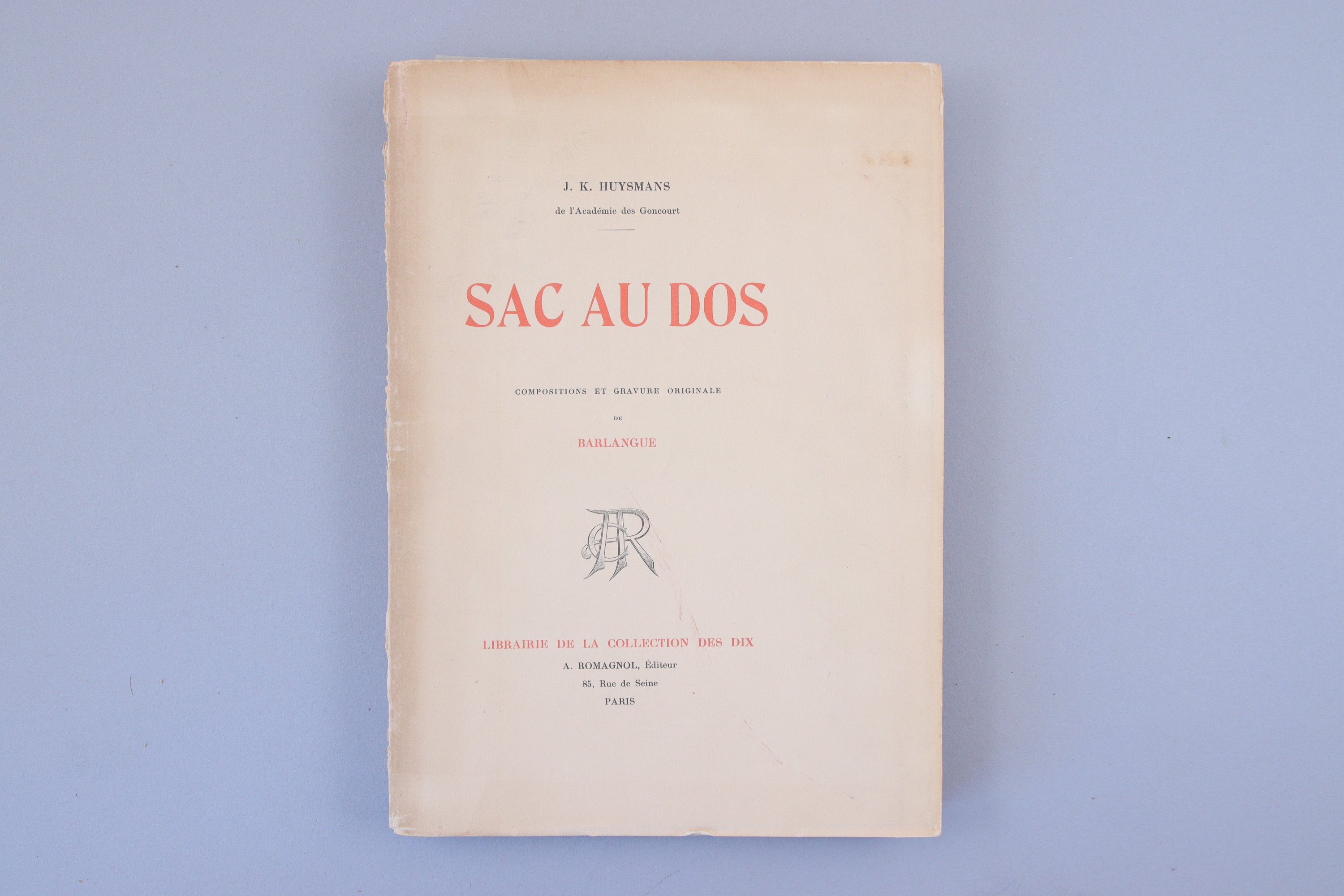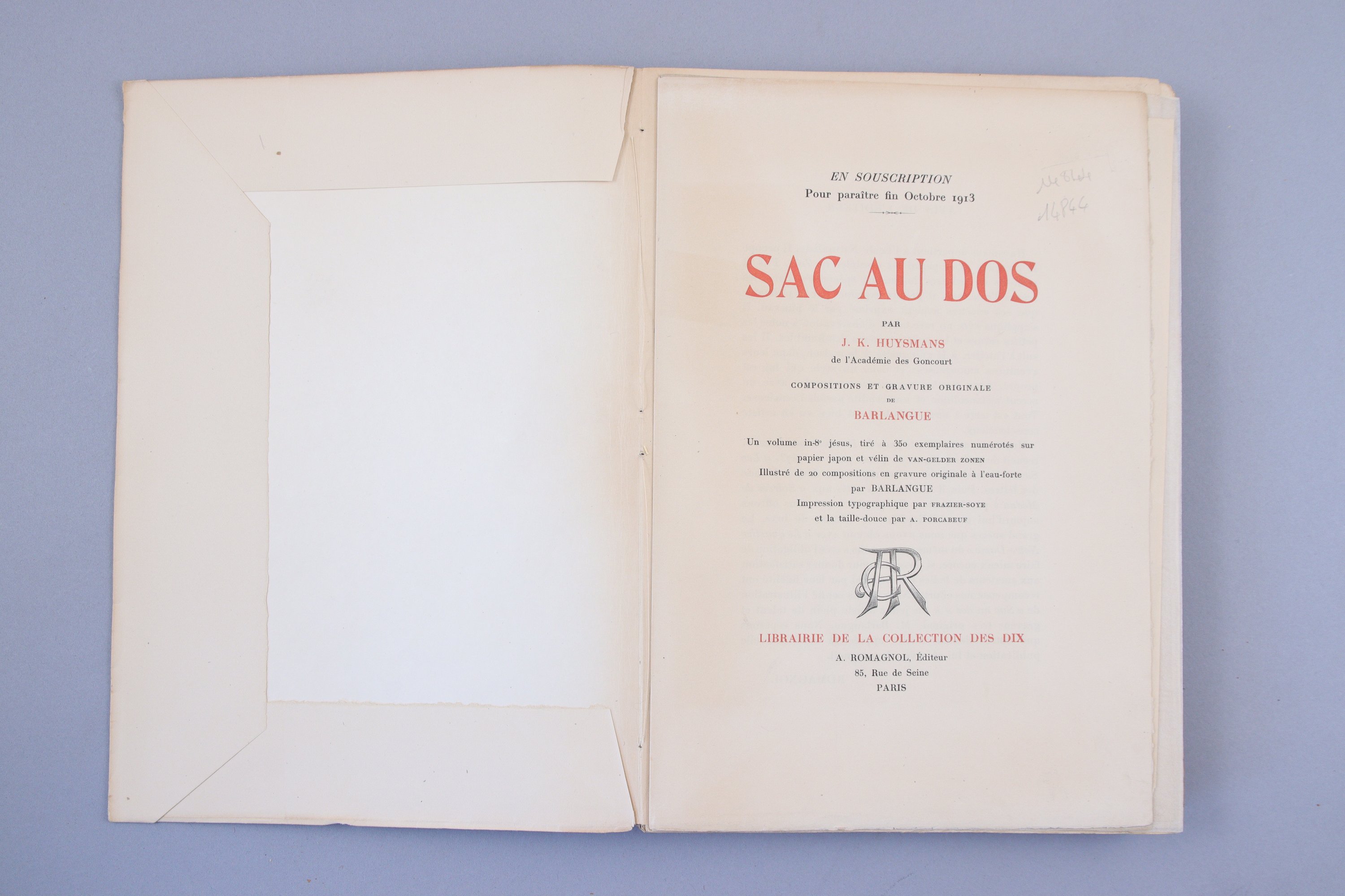 3) Huysmans: Sac au dos. Compositions et gravure originale de Barlangue. Paris, Romagnol, Librairie de la Collection des Dix. (1913). In-8 Jésus, broché. (Dos des couvertures endommagé). Tirage à 352 exemplaires, celui-ci un des 100 (n°30) sur Japon Impérial, avec deux dessins originaux dont 1 signé, et 3 états des gravures.