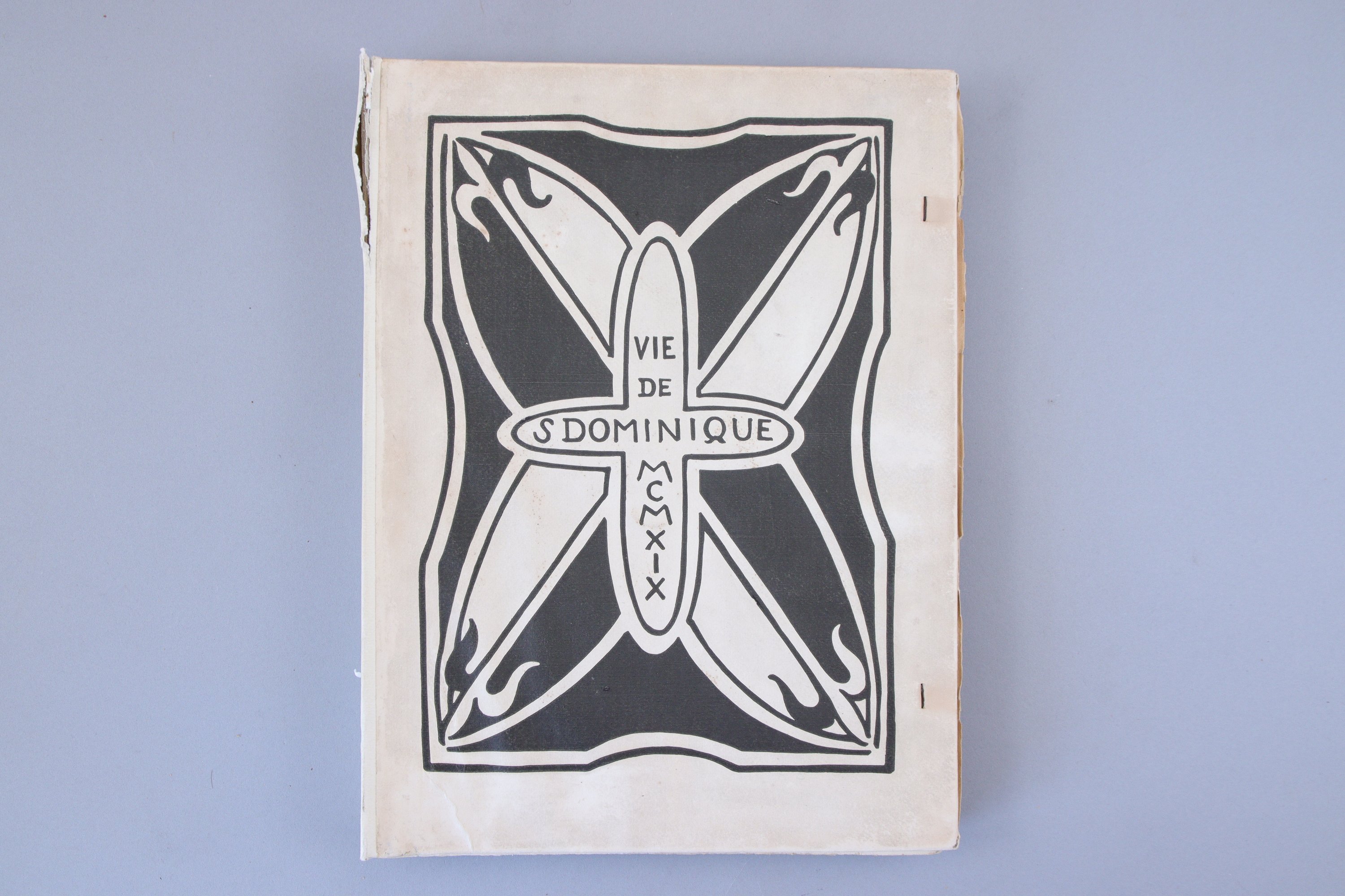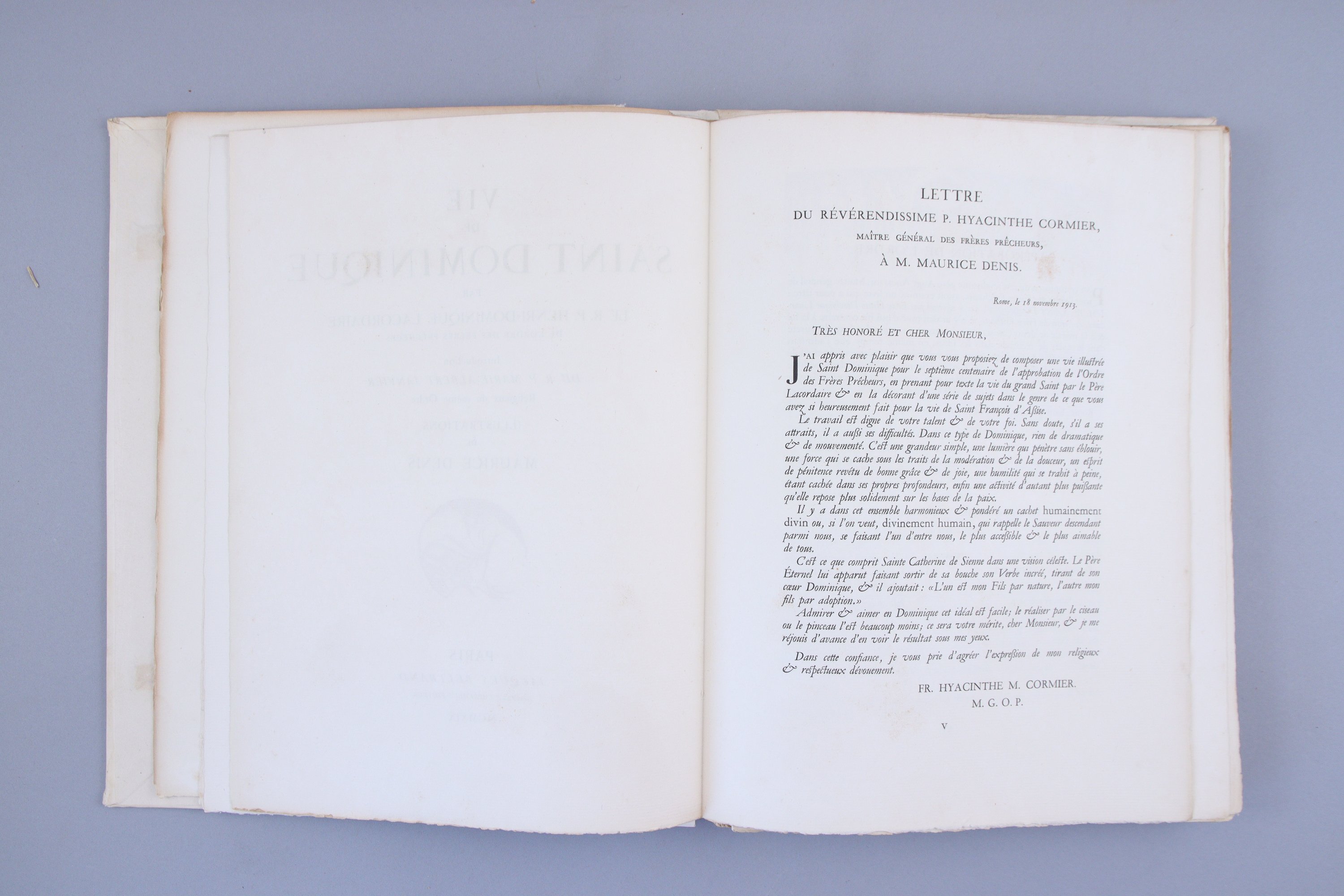 5) Lacordaire: Vie de Saint-Dominique. Illustrations de Maurice Denis. Paris, Beltrand; 1919 In-4°, en feuilles. Non coupé. Couverture illustrée en noir et blanc ; chemise avec le même décor.. (Dos de la chemise restauré endommagé). 61 compositions de Maurice Denis en noir et en couleurs. L'ouvrage est tiré à 330 exemplaires -mais le feuillet de justification manque.