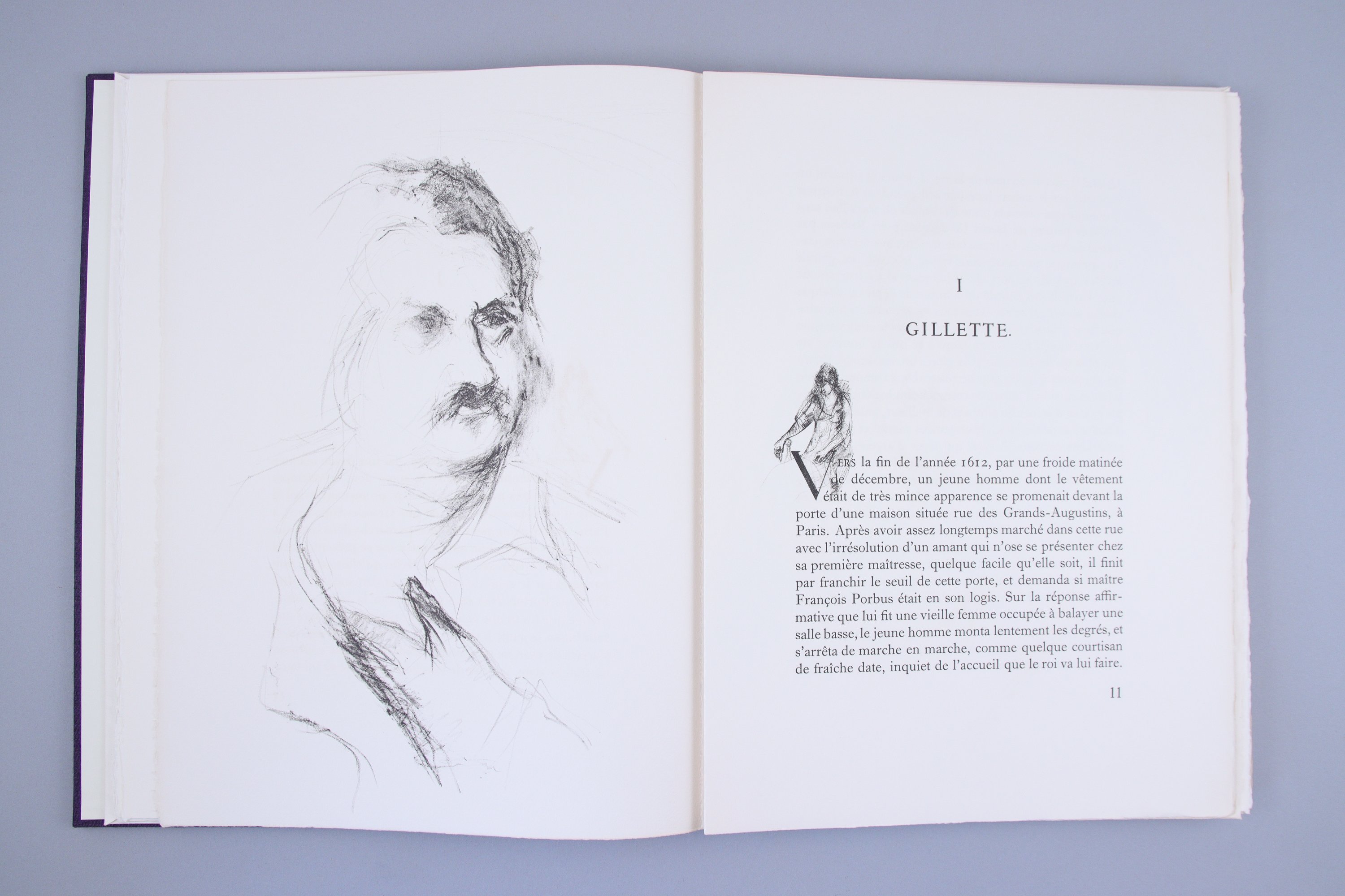 Petit in-folio. En feuilles sous cartonnage vert et doré de l'éditeur. 48 feuillets imprimés au recto seul ; 48 lithographies dont 21 hors texte, en noir ou en couleurs, parmi lesquelles 8 imprimées sur papier bleu. Tirage à 500 exemplaires "sur Vidalon imprimé d'un seul côté". Premier ouvrage illustré par Grand-Jouan.