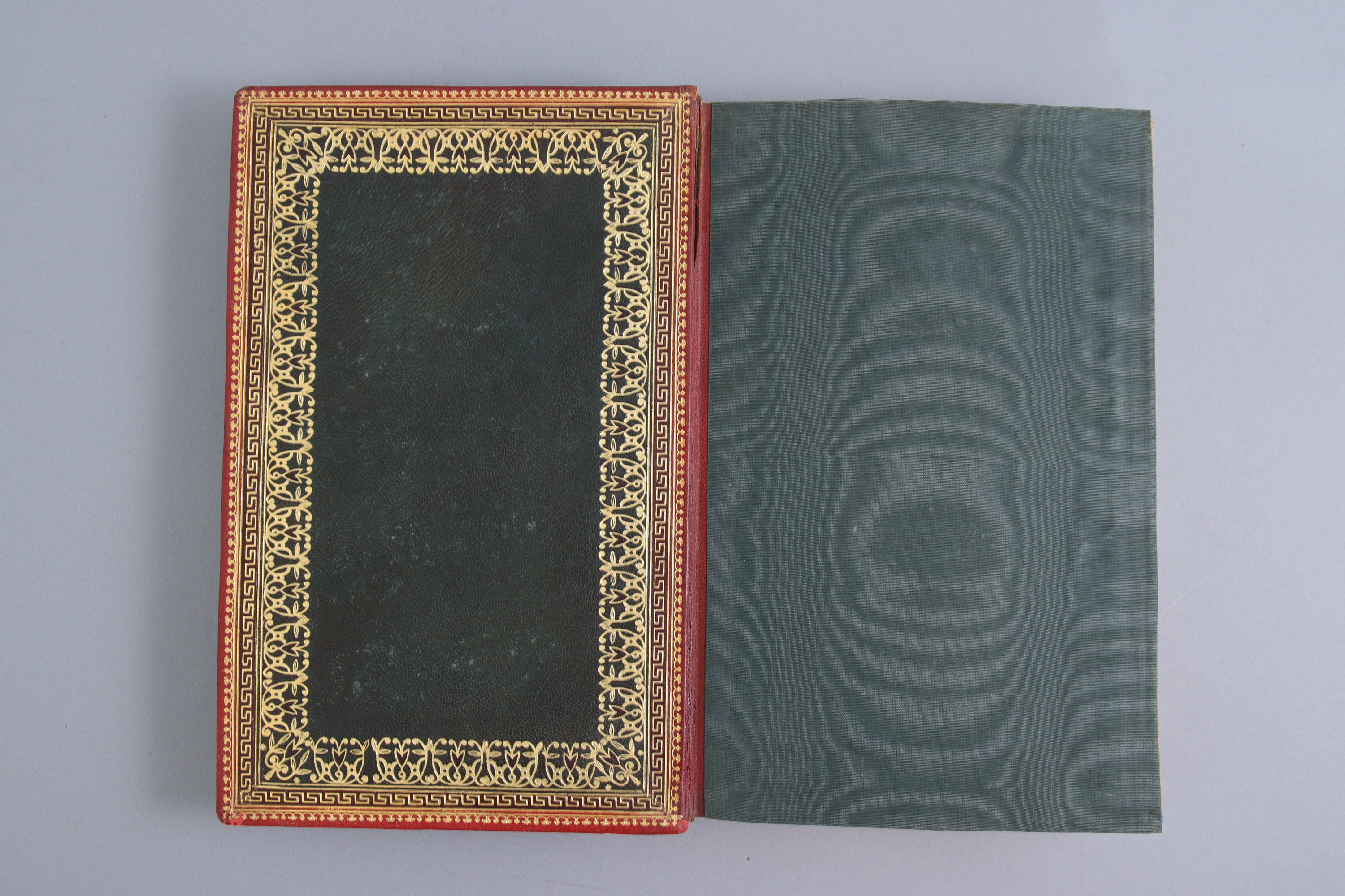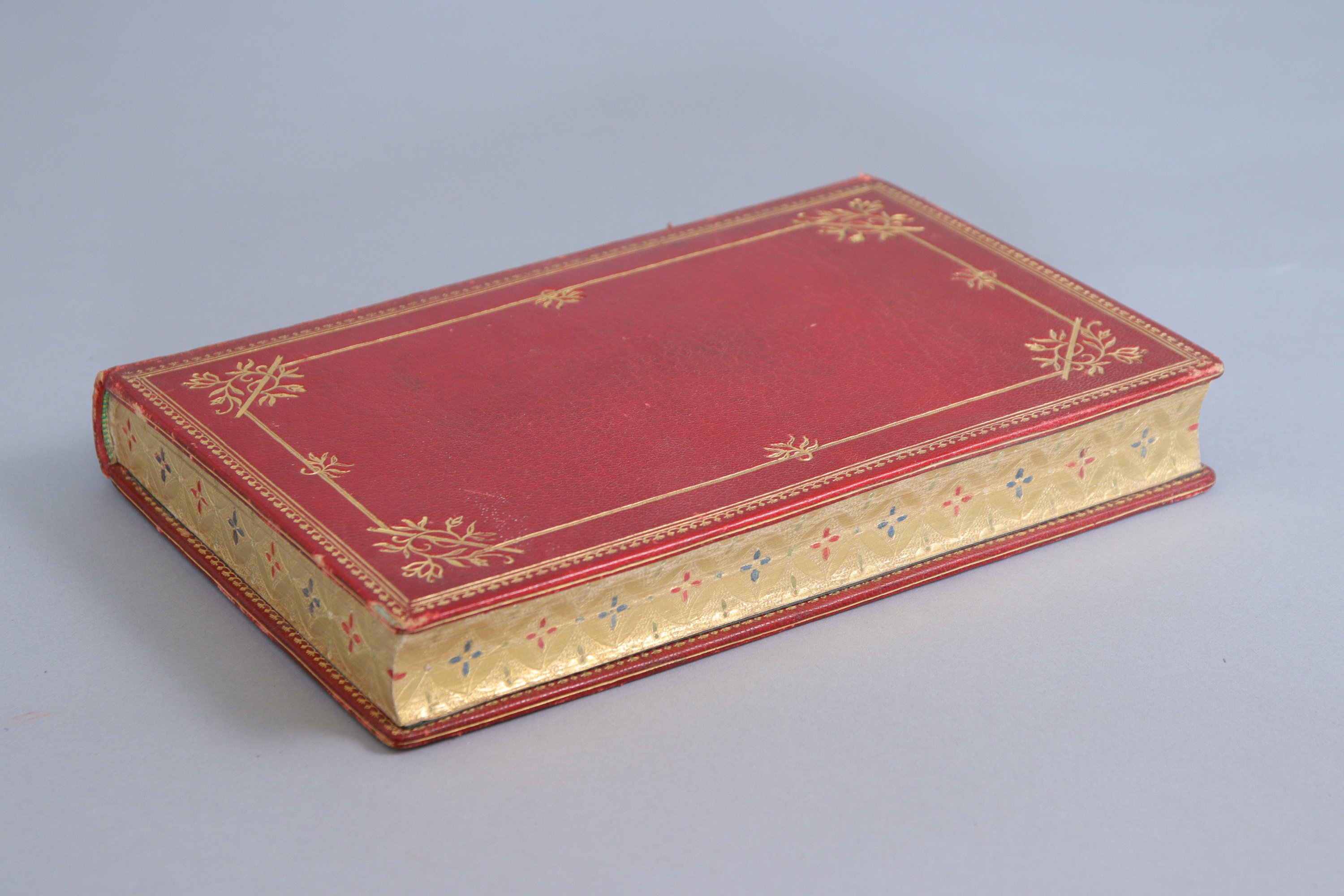 Plein maroquin rouge, roulette et filets droits d'encadrement dans lesquels s'inscrivent deux autres filets droits ornés dans les angles de grands fers à motif floral stylisé, et dans leur milieu d'un fer à motif de rameau. Dos à 5 nerfs, orné dans les entre-nerfs d'un fer à motif de rameau. Doublure de maroquin vert, dans un large encadrement composé de filets droits, de roulettes à la grecque, et d'une large roulette de fleurs de style Art Déco. Toutes tranches dorées, ciselées avec motifs peints en rouge et en vert. Reliure du temps. (2 coins très légèrement frottés).