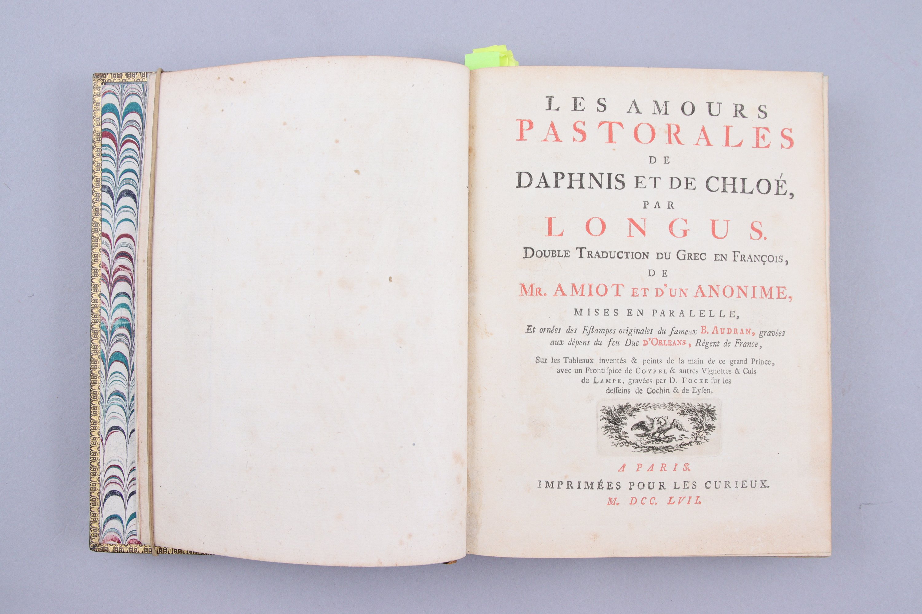 Les Amours pastorales de Daphnis et Chloé, par Longus. Double traduction de Mr. Amiot et d'un anonime, mises en parallèle. Et ornées des estampes du fameux B. Audran, gravées aux dépens du feu Duc d'Orléans, Régent de France, sur les tableaux inventés et peints de la main de ce grand Prince ....