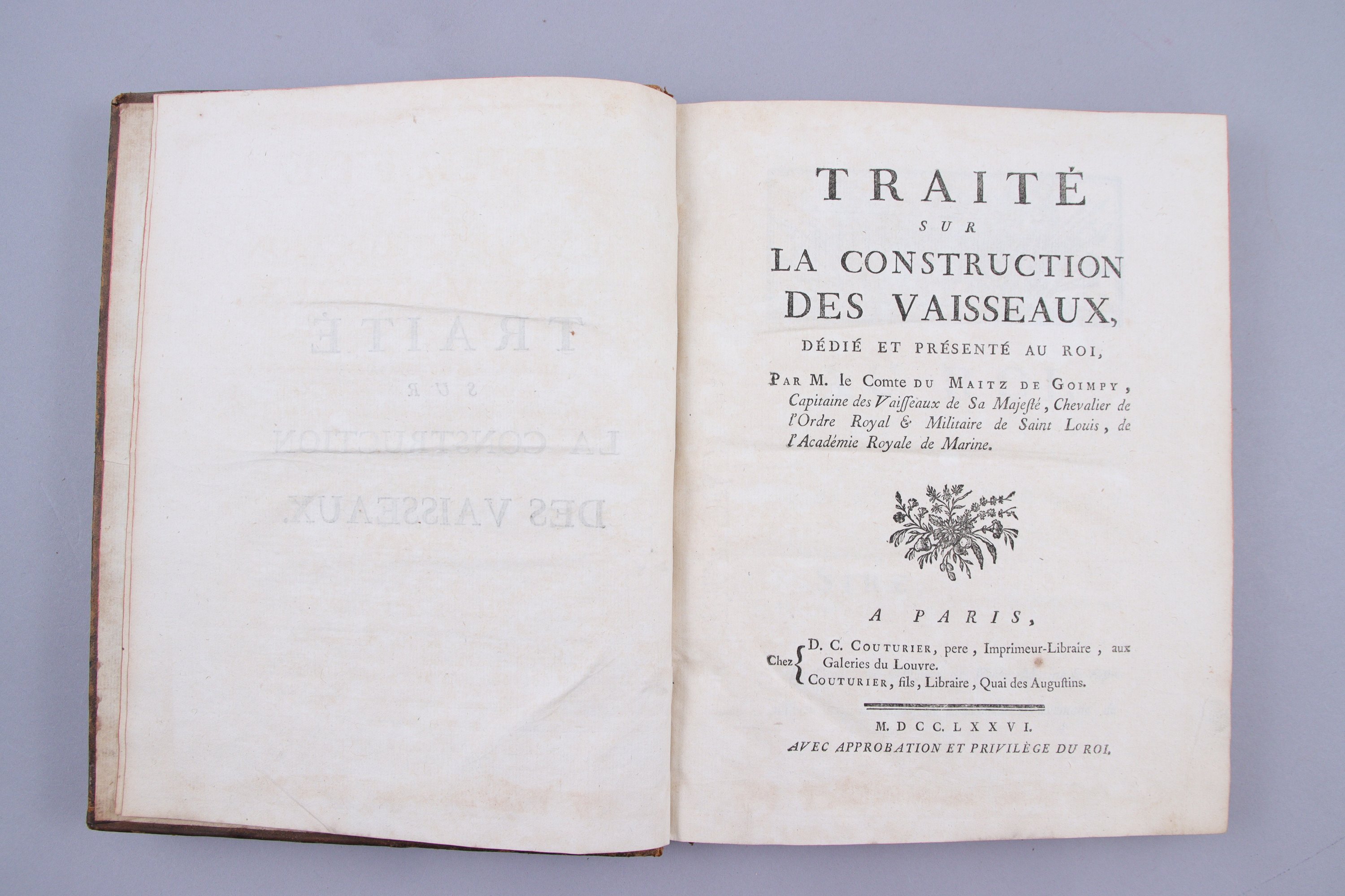 Traité sur la construction des vaisseaux dédié et présenté au Roi. Par M. le Comte du Maitz de Goimpy, capitaine des Vaisseaux de Sa Majesté, Chevalier de l'Ordre Royal et Militaire de Saint-Louis; de l'Académie Royale de Marine.. Paris, Couturier père et fils. 1776