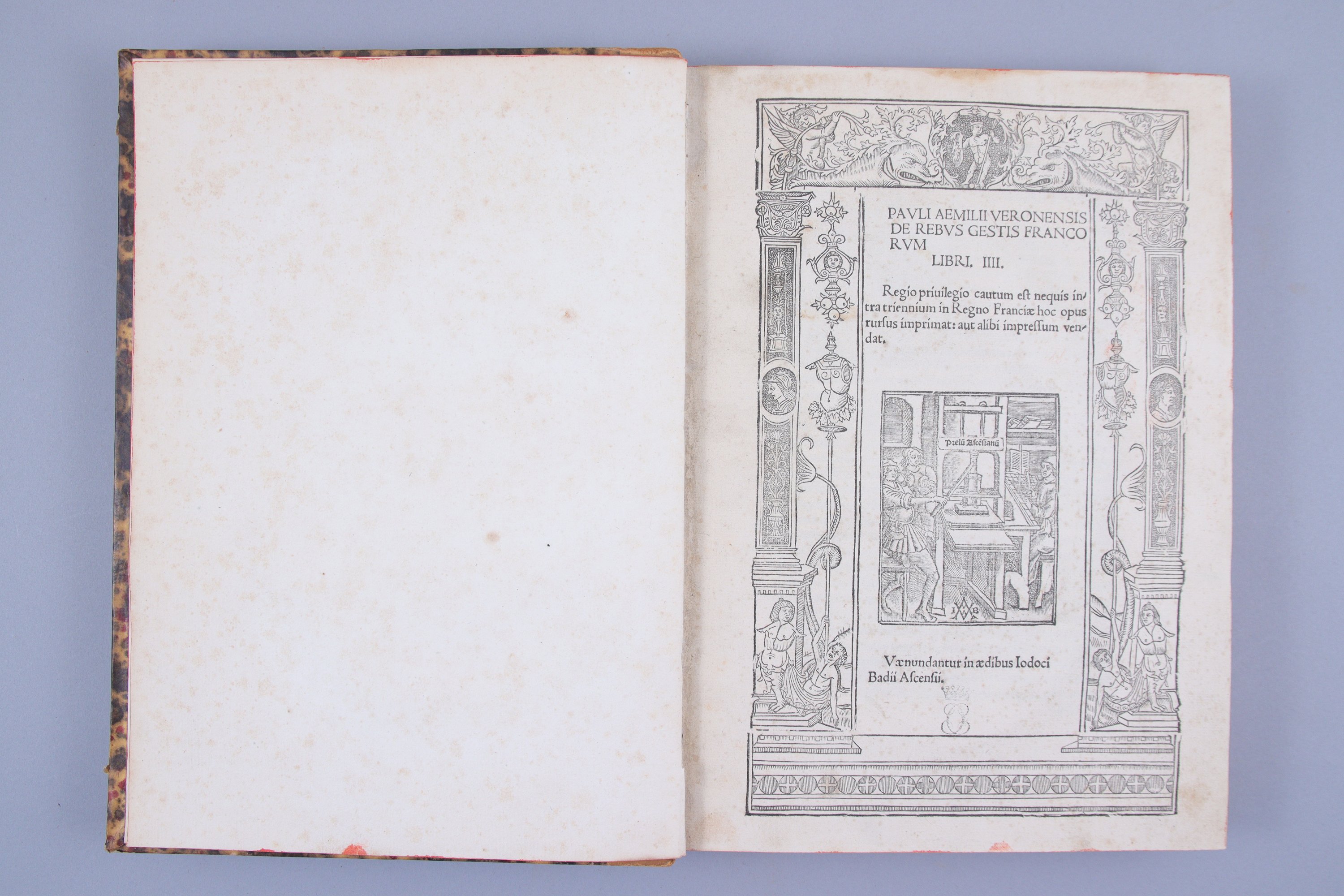 L'Histoire de France (Historia Francorum) de l'humaniste véronais Paolo Emilio, en français Paul Emile, parut en plusieurs étapes, correspondant à 5 états selon Renouard (Bibliographie des impressions et des oeuvres de Josse Badius Ascensius, tome II, pages 2 et 3). Notre exemplaire est parfaitement conforme à la description du 2ème état, en CCXVIII feuillets et (2 ff) signés x. "Dans cet état, le volume contient 7 livres, au lieu de 4 annoncés au titre ; les livres 5 à 7 occupent les feuillets CXXV à CCXVIII" (Renouard).