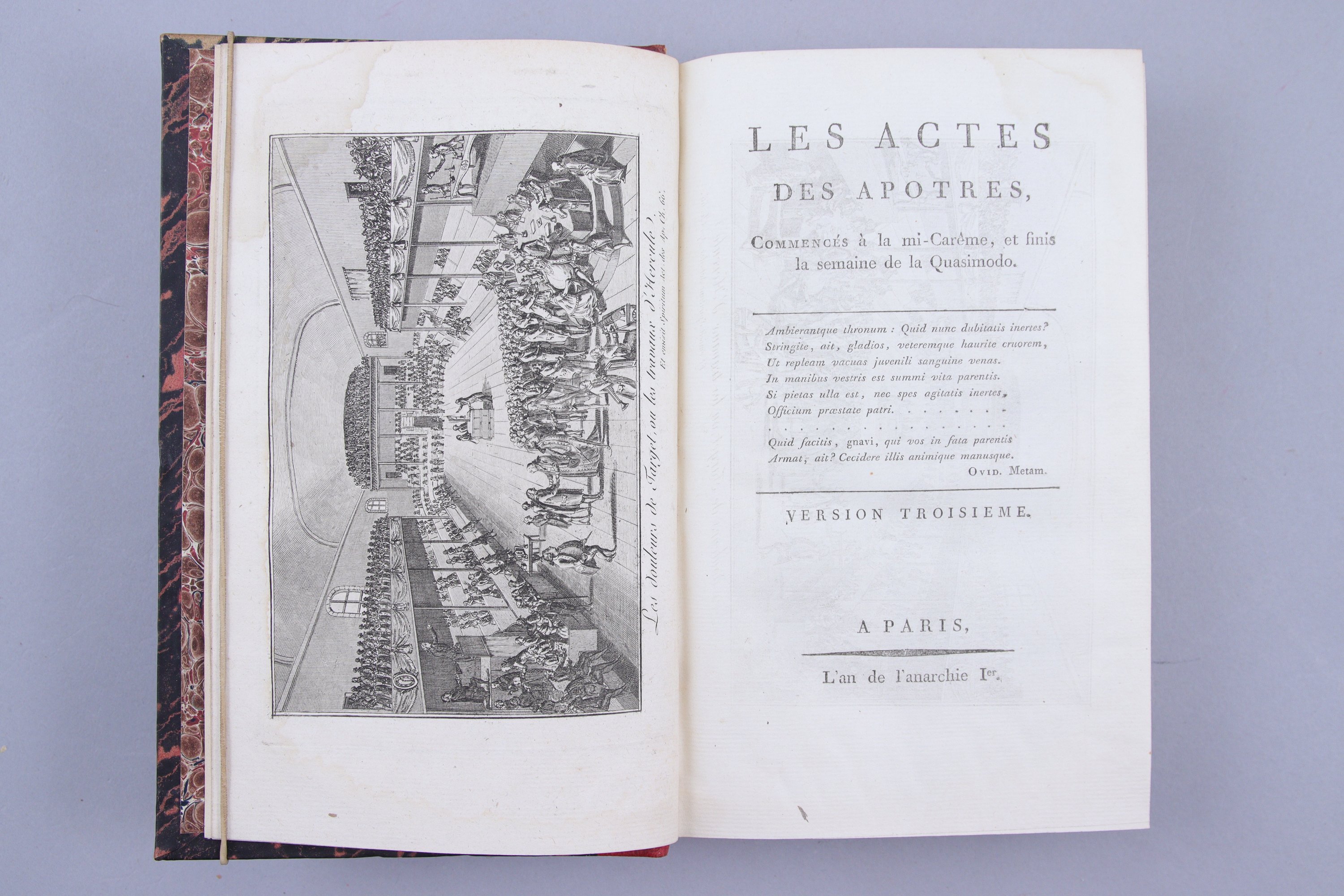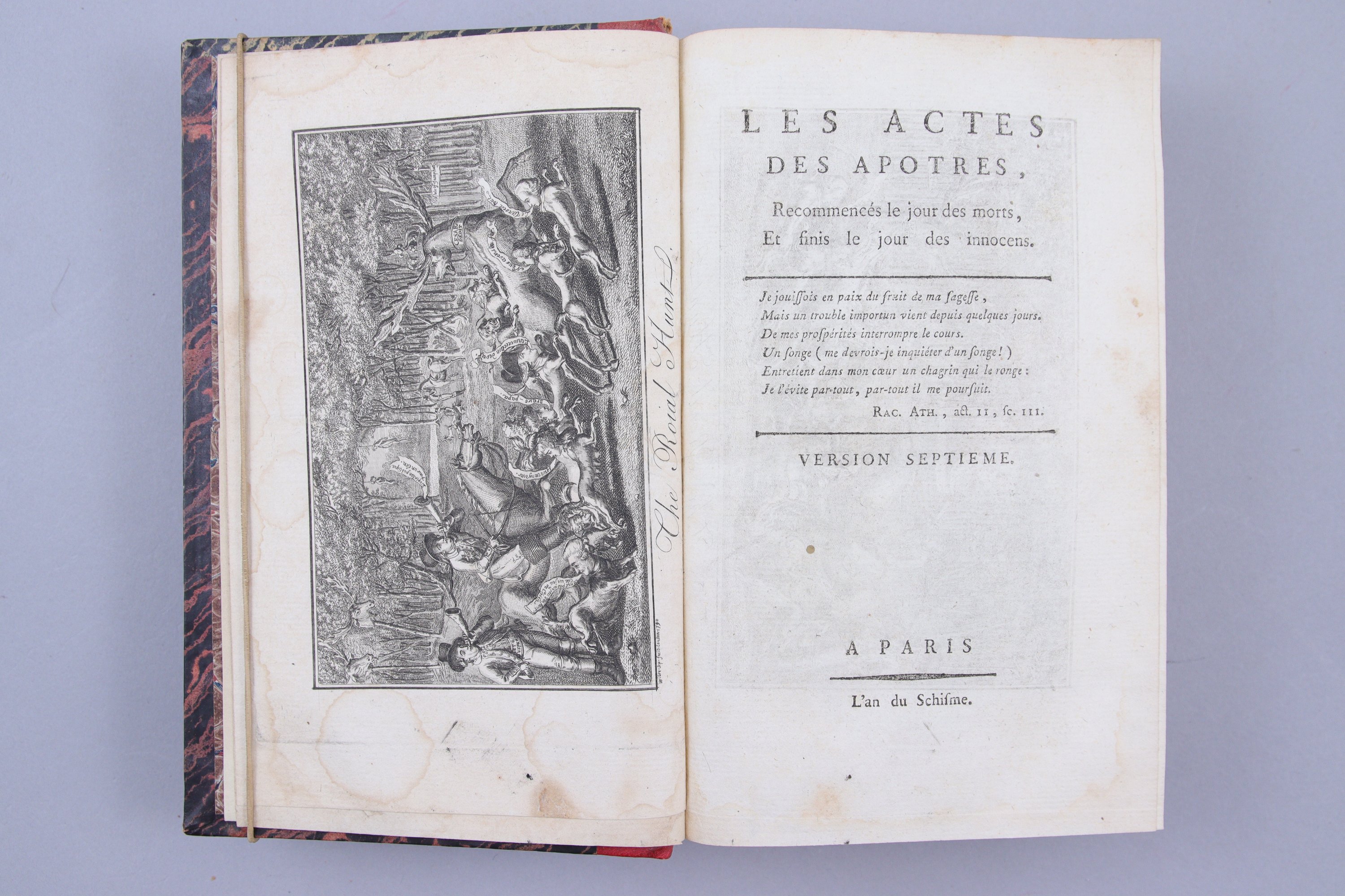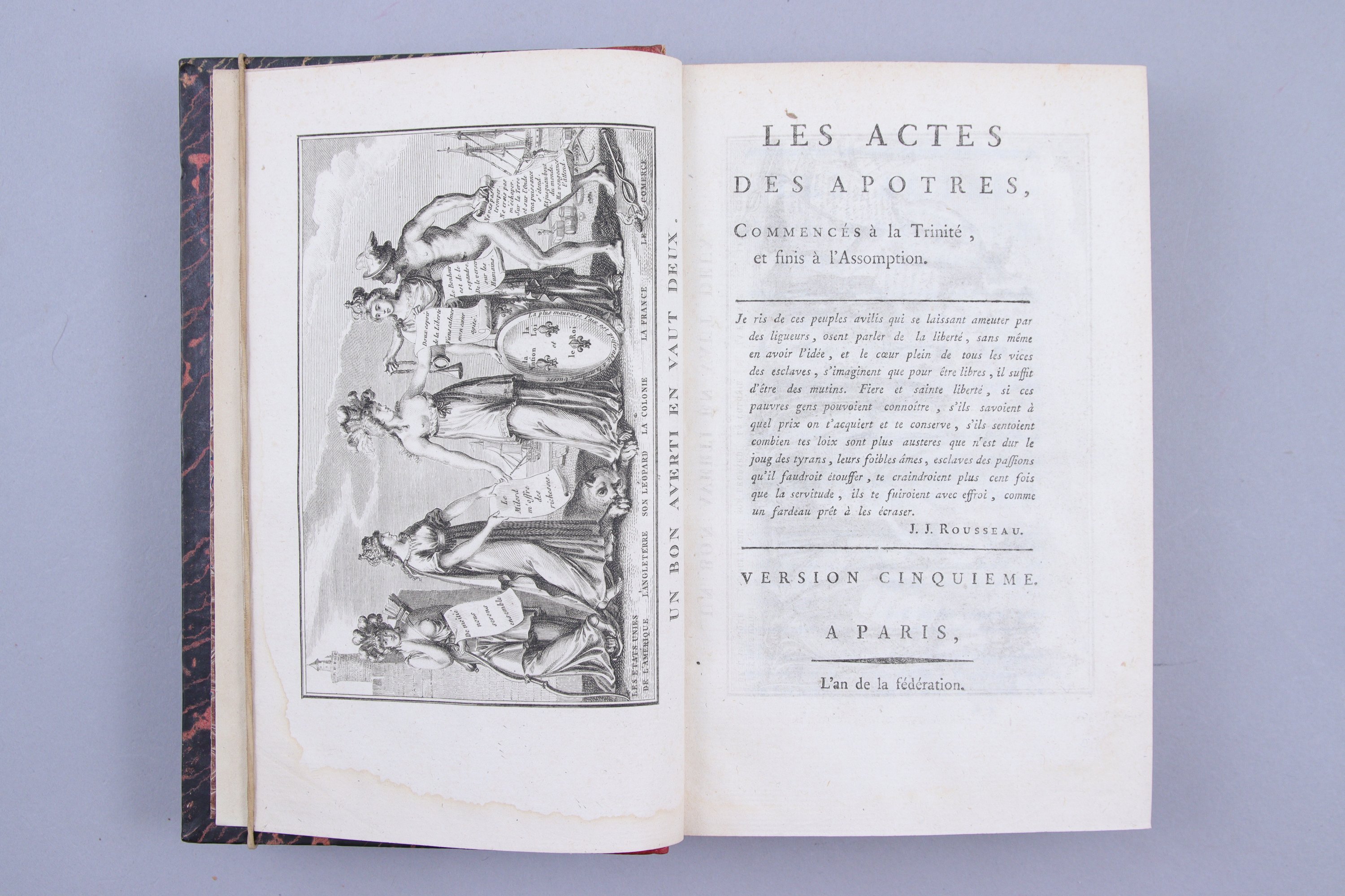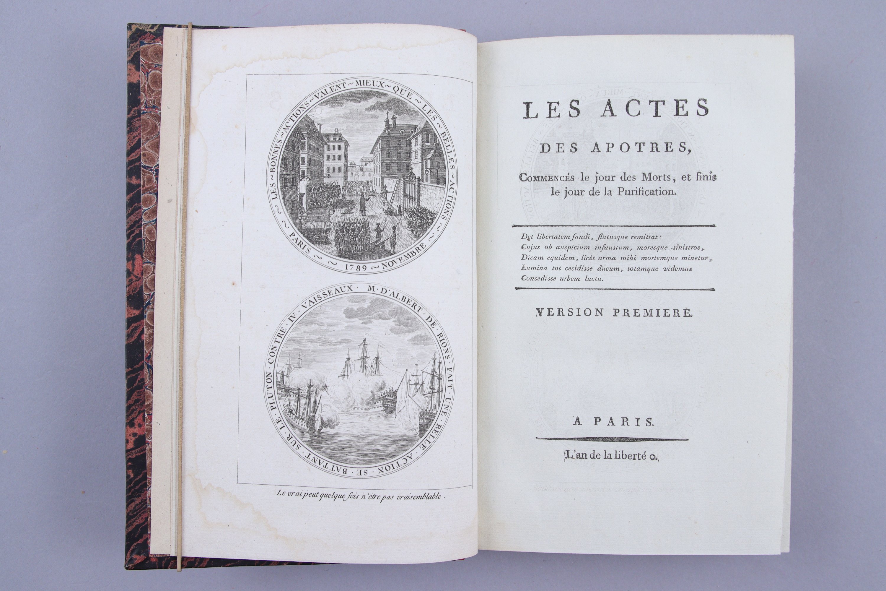 Les Actes des Apôtres commencés le Jour des Morts et finis le jour de la Purification. Version première: l'an de la Liberté 0. Version seconde: l'an de la Liberté sanctionnée. Version troisième: l'an de l'Anarchie Ier. Version quatrième: l'an des Municipalités. Version cinquième: l'an de la Fédération. Version sixième: l'an des Assignats. Version septième: l'an du Schisme. .