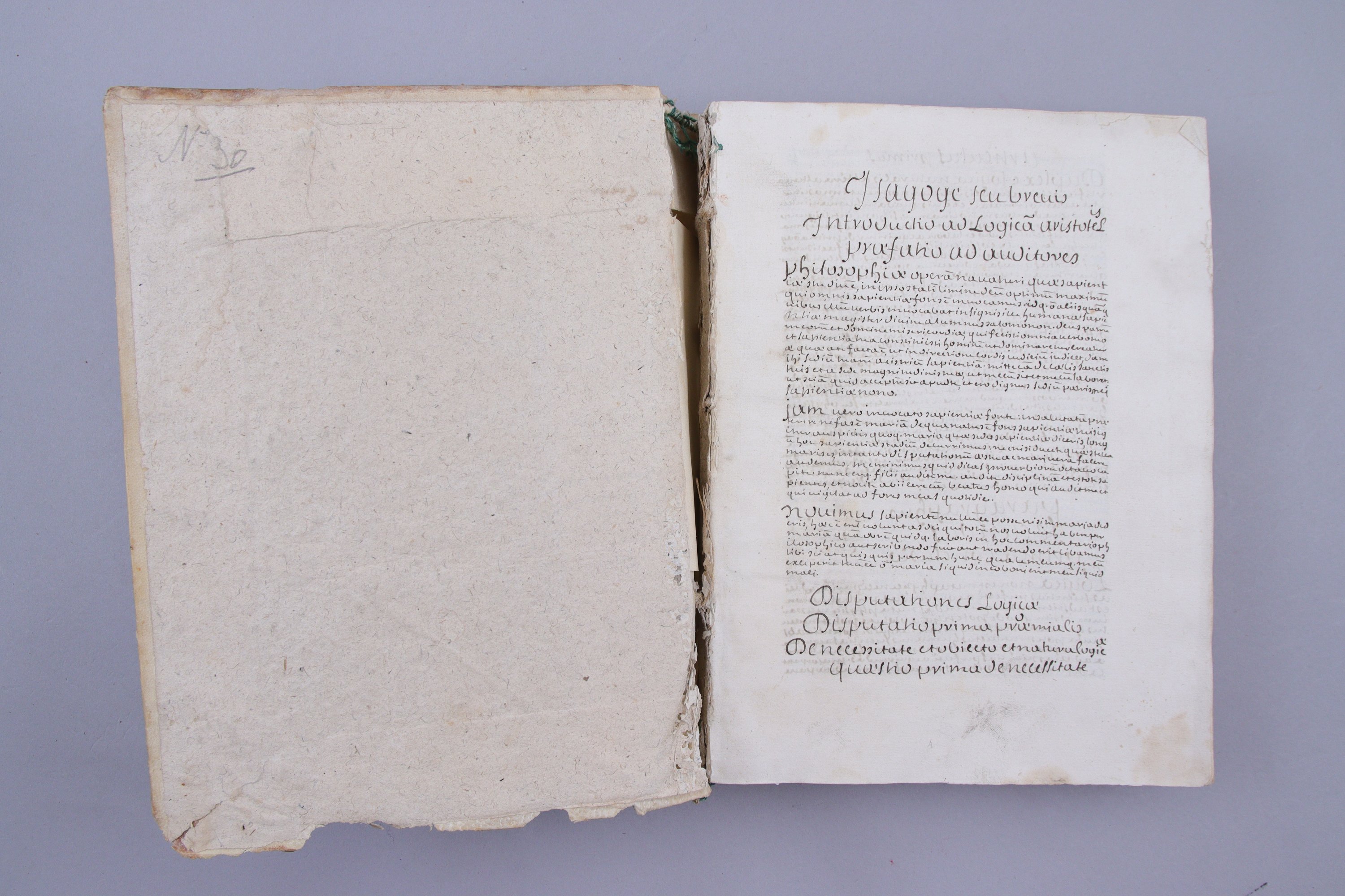 Important manuscrit latin; très soigneusement écrit. Il ne s'agit pas de notes prises rapidement pendant un cours ; mais bien du manuscrit d'un professeur préparant pour ses "auditores" son cours sur Aristote ; Saint Augustin ou Thomas d'Aquin. A chaque argument développé, correspond une réponse à la première personne: "Respondeo", "Dico", etc...confirmant l'autorité magistrale du rédacteur.