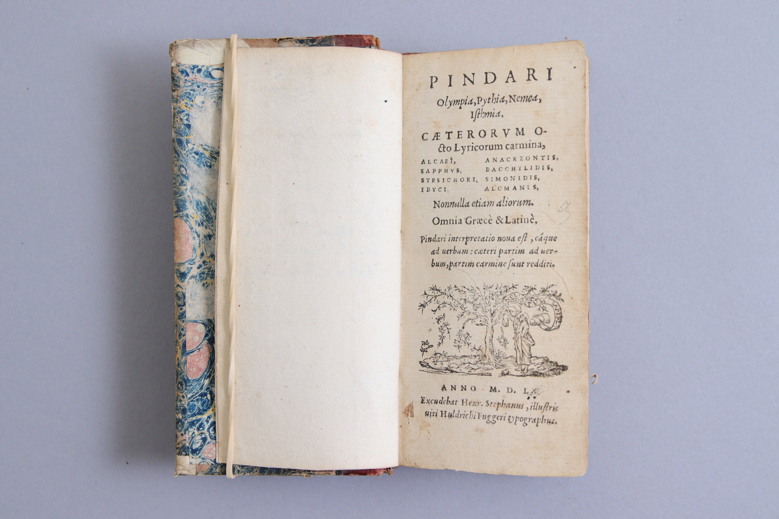 Première partie seule, comprenant les oeuvres de Pindare en grec, avec la traduction latine de Henri Estienne. La seconde partie, avec les poésies de huit poètes lyriques (Alcée, Sappho, Stesichore, Anacreon etc...) manque.