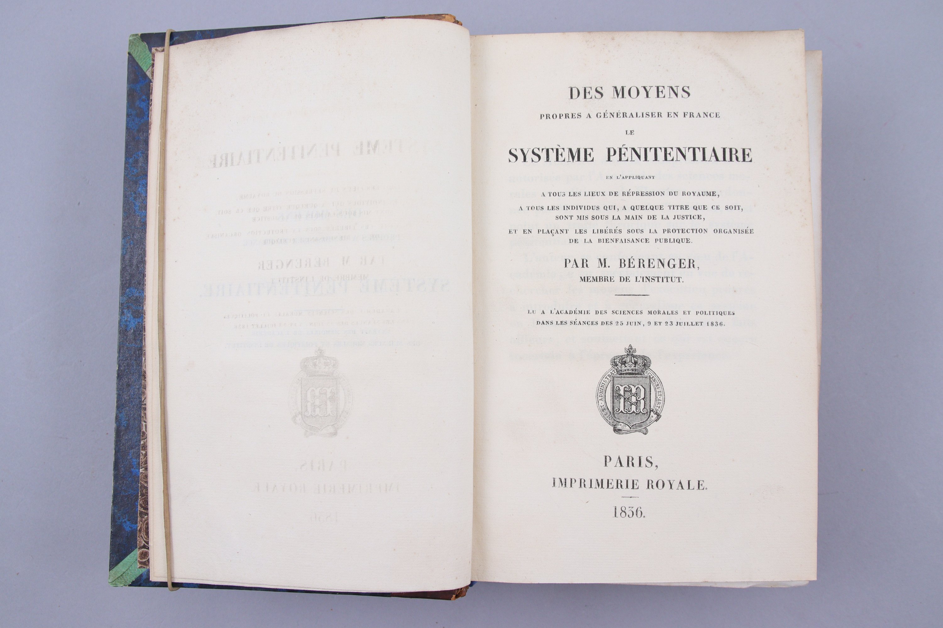1) Bérenger: Des moyens propres à généraliser en France le système pénitentiaire en l'appliquant à tous les lieux de répression du Royaume...Paris, Imprimerie Royale, 1836.