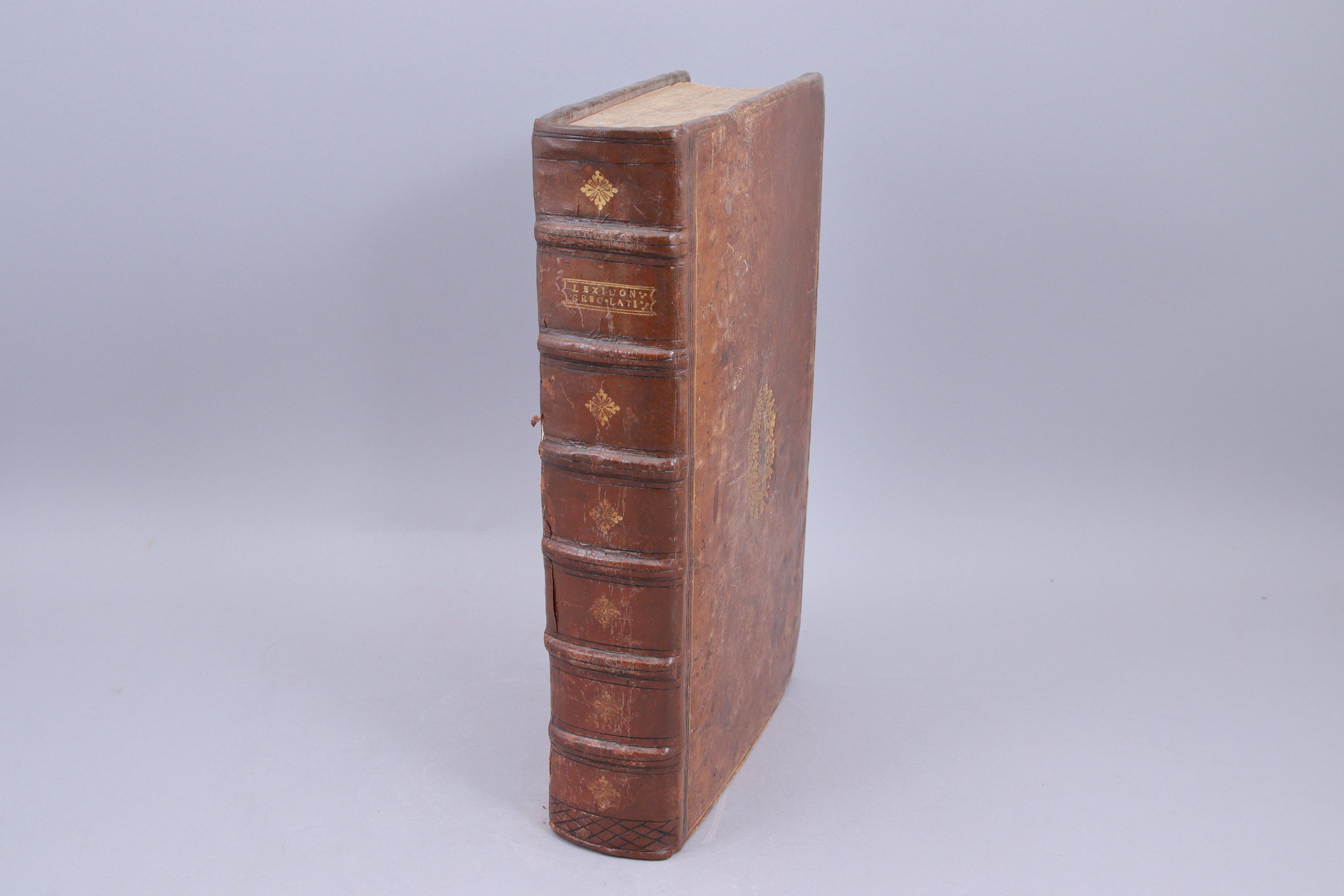 In-folio, (6 feuillets), 1856 colonnes, (80 feuillets) d'index ; 188 colonnes pour l'Appendix, (1 feuillet) pour le colophon et la marque d'imprimeur. Plein veau fauve, couronne de rameaux d'olivier au centre des plats. Reliure du temps. (Papier légèrement roussi. Galeries de vers dans l'Index, affectant quelque peu le texte sur une vingtaine de feuillets.)