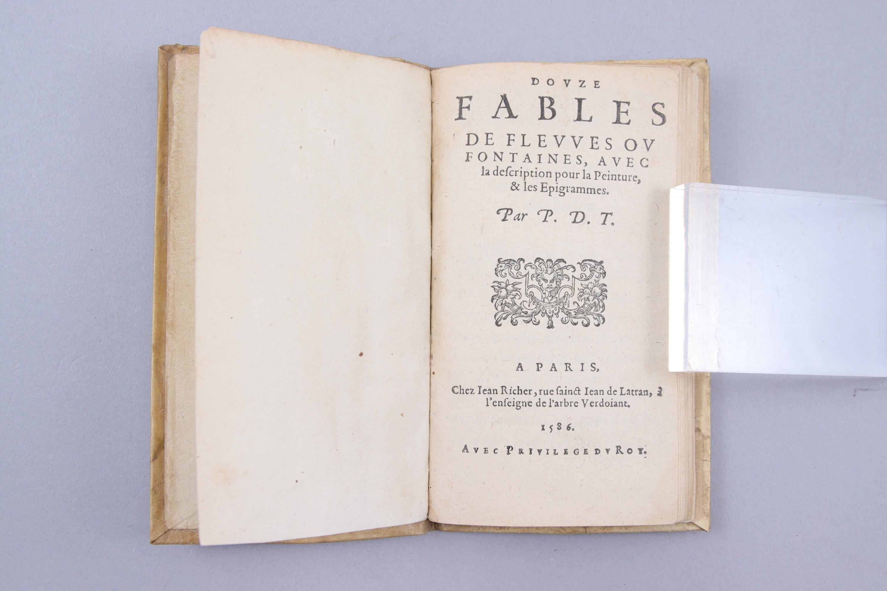 Douze fables de fleuves ou fontaines, avec la description pour la peinture, et les épigrammes. Par P.D.T.. Paris, Jean Richer. 1586