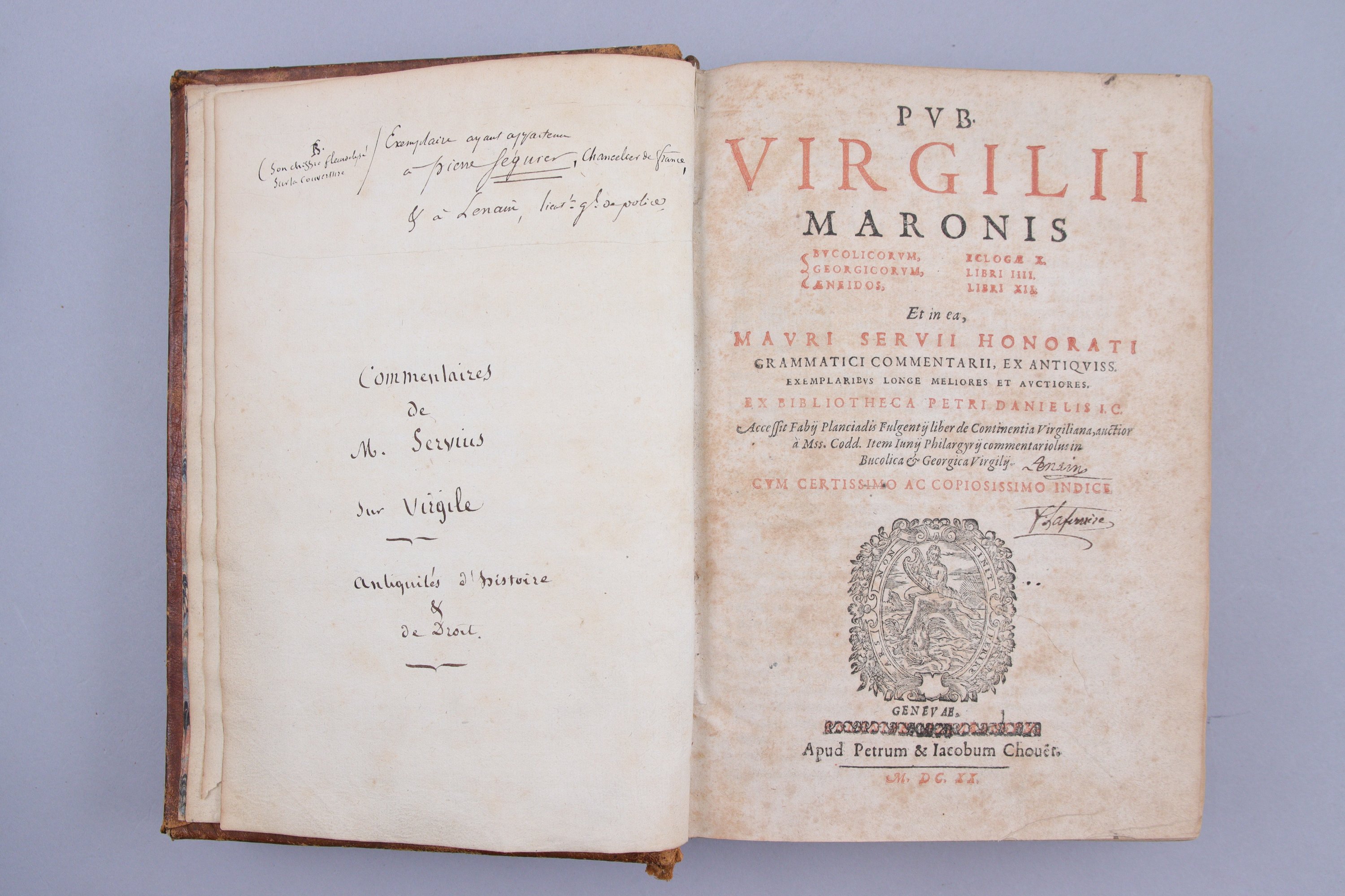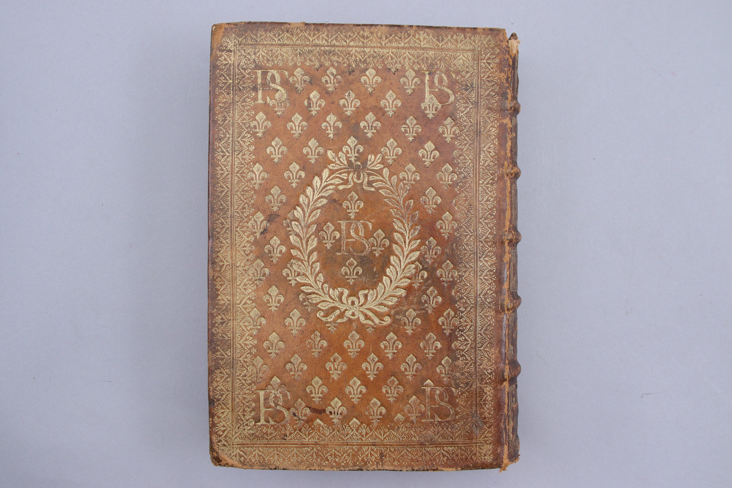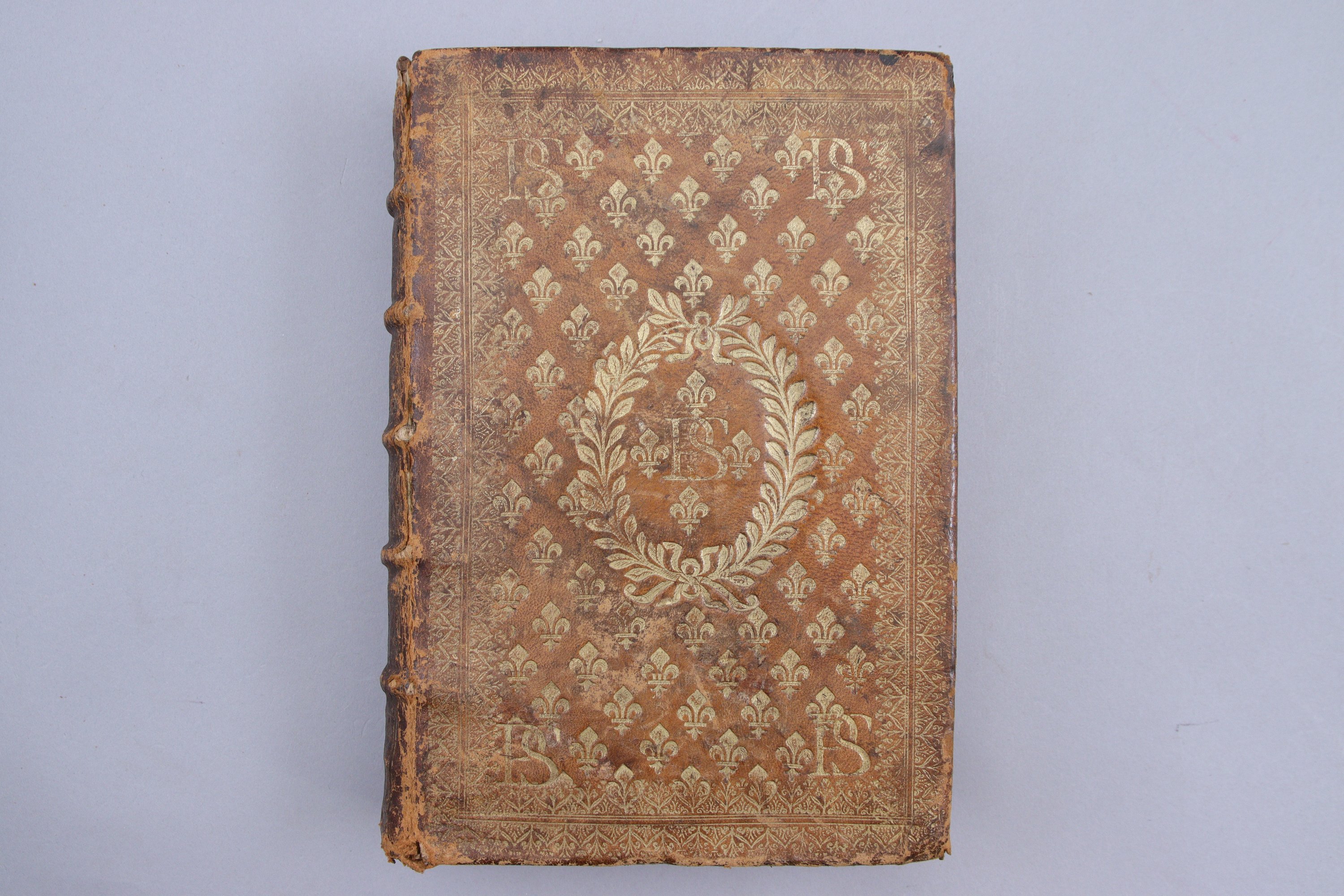 Petit in-4°, (16 ff), 732 pages, 62 pages et (30 ff) d'index. Plein veau fauve vers 1680. Deux larges roulettes d'encadrement ; chiffre PS entrelacé dans les angles ; semis de fleurs de lys au centre duquel est poussé une couronne de lauriers dans laquelle s'inscrit le chiffre PS entrelacé. Dos à 5 nerfs, avec semis de fleurs de lys et chiffre PS entrelacé dans chaque caisson. Toutes tranches dorées. (Mors, coiffes et coins frottés. Rousseurs éparses)..