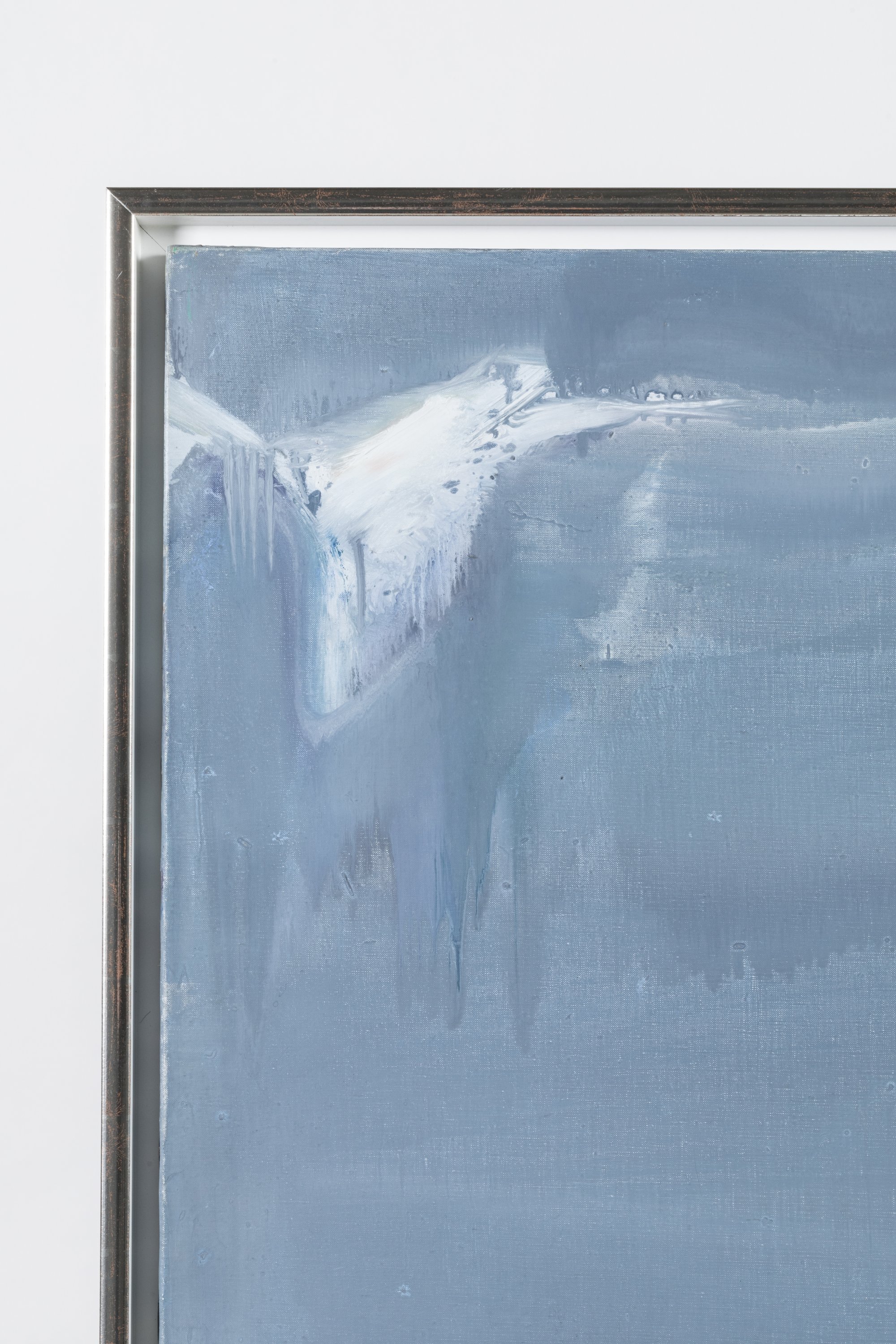 « Je pars, j’avance, et je me dis je vais peindre là » confie Olivier Debré. Le monde offre à l’artiste un immense atelier à ciel ouvert. La Norvège est l’un de ses terrains favoris, qu’il explore entre 1966 et 1998. Là-bas, il commence à peindre en 1971 dans un vocabulaire esthétique, où le signe n’a plus sa place. Notre toile est réalisée en 1979. Lors de ce voyage, Debré est accueilli à Laerdal par l’armateur H.R. Astrup, qui lui ouvre les portes de sa propriété, « Lysne ». Des jours durant, l’artiste peint sur le motif, jouant des nuances d’un bleu gris et des subtilités de la matière que lui évoque le Sognefjord. Epaisse à l’extrémité supérieure, l’huile est d’une pureté infinie dans le reste de la surface, seulement perturbée par des coulures volontairement apposées.