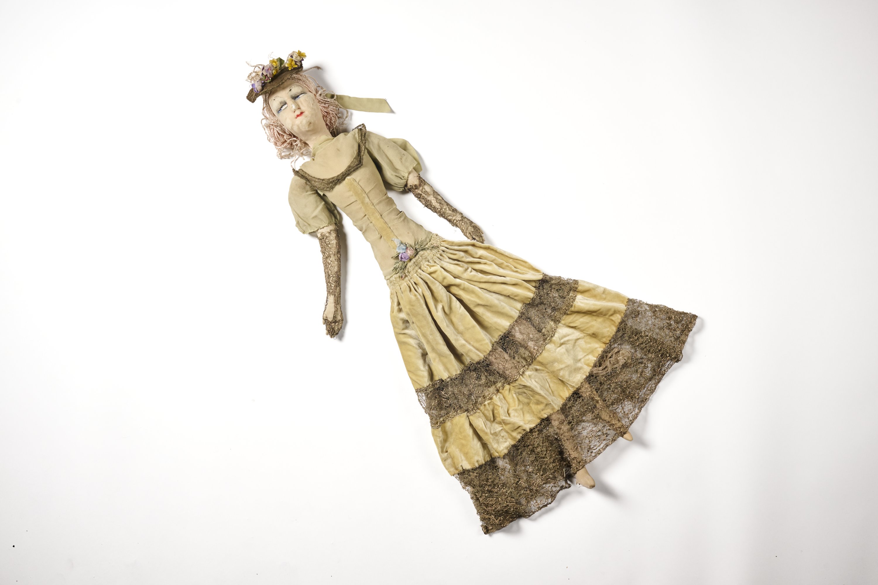 Poupée en tissu bourré et réhauts de gouache sur les yeux et la bouche. La robe en velours et dentelle.