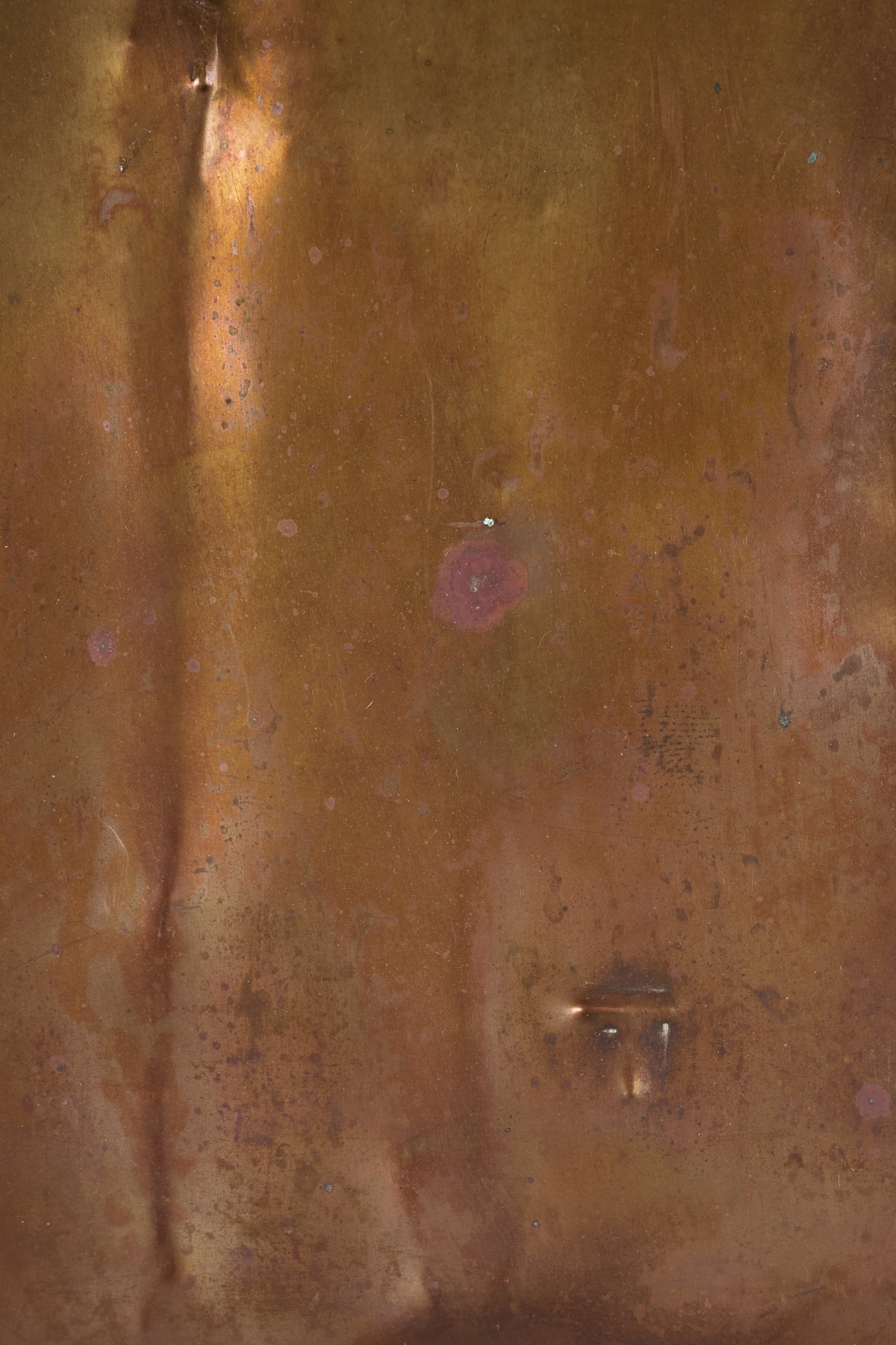 Deux panneaux de cuivre martelé, dont un monté sur une planche en chêne teinté.