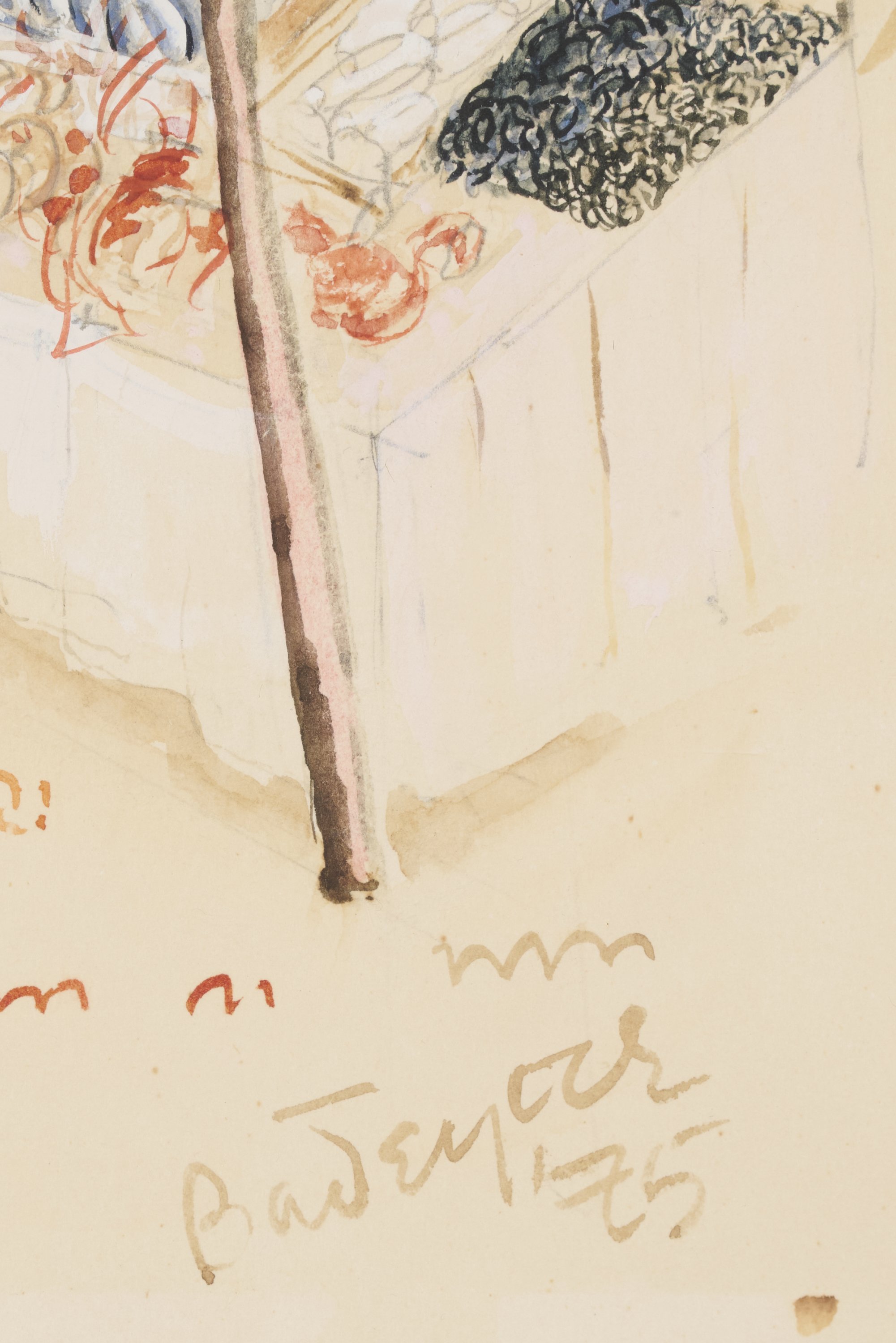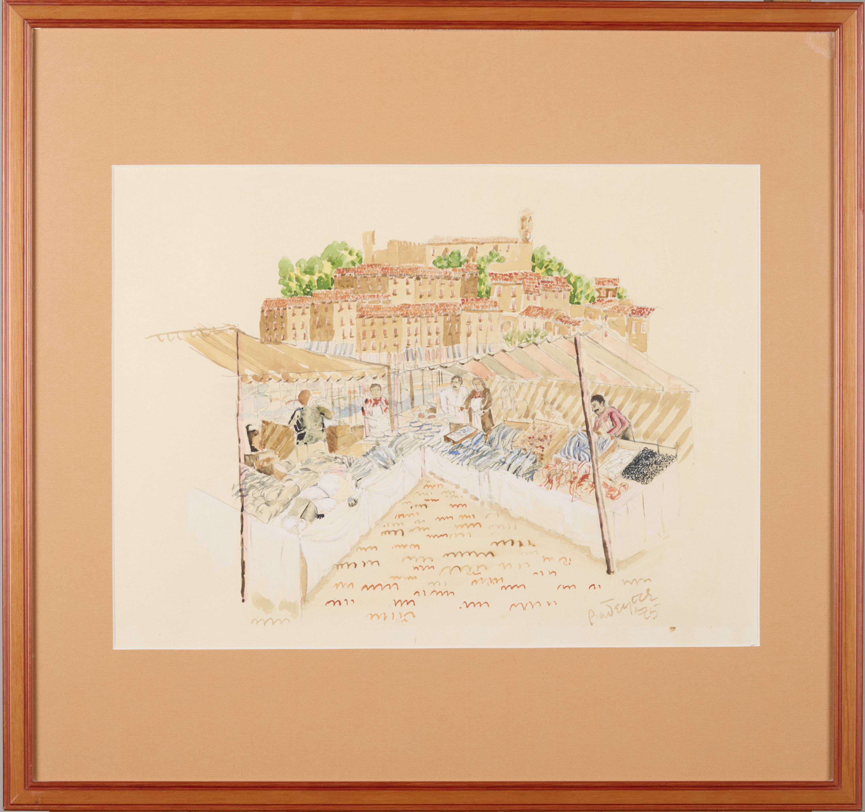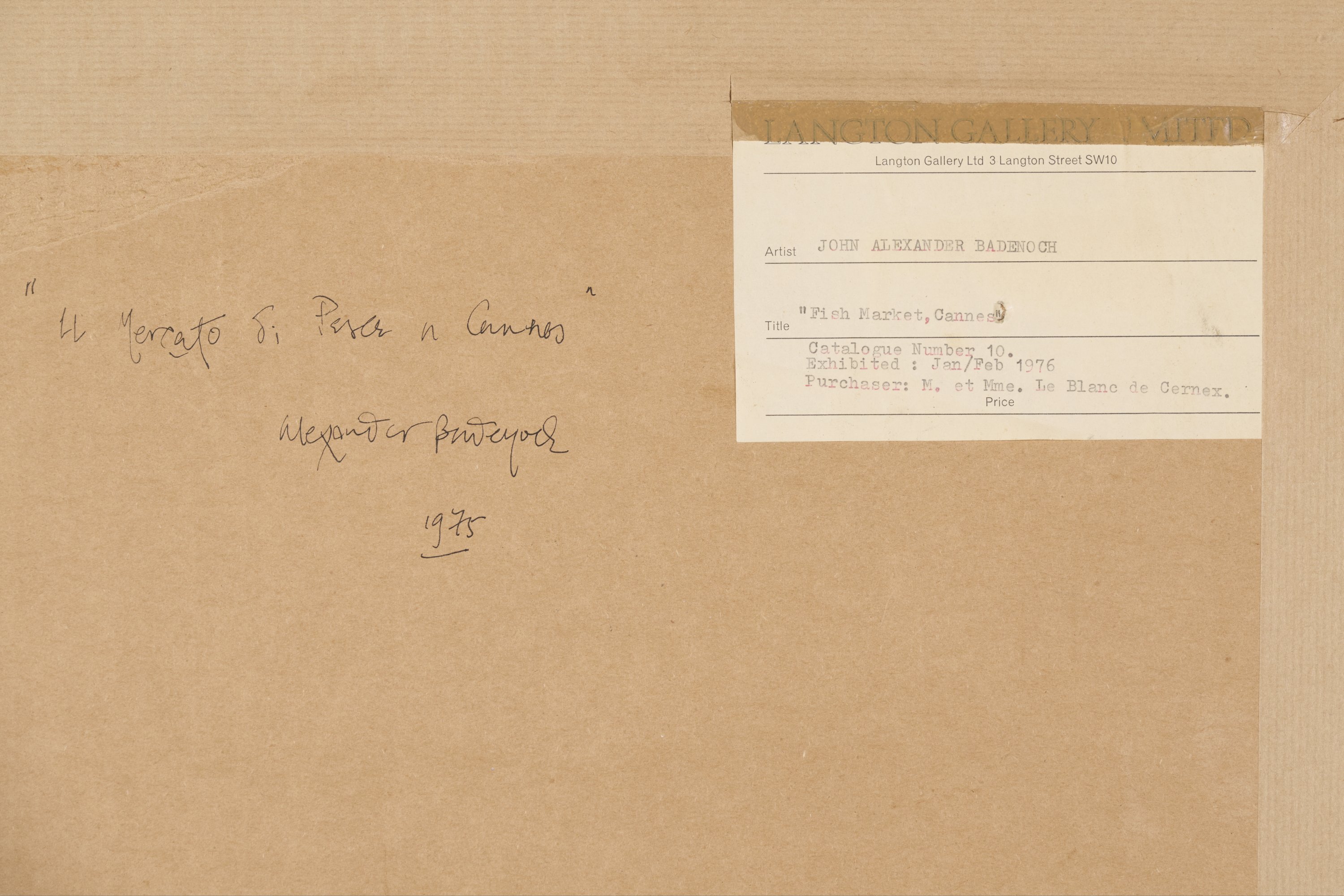 - John Alexander Badenoch (Anglais, XXe). 'Il mercato di pesce a Canes", 1975. Aquarelle. Signée et datée. Légendée au dos. Haut. 29 Larg. 39 cm. Cadre à baguettes orange. Acquis auprès de la Langton Gallery, Londres, 1976.