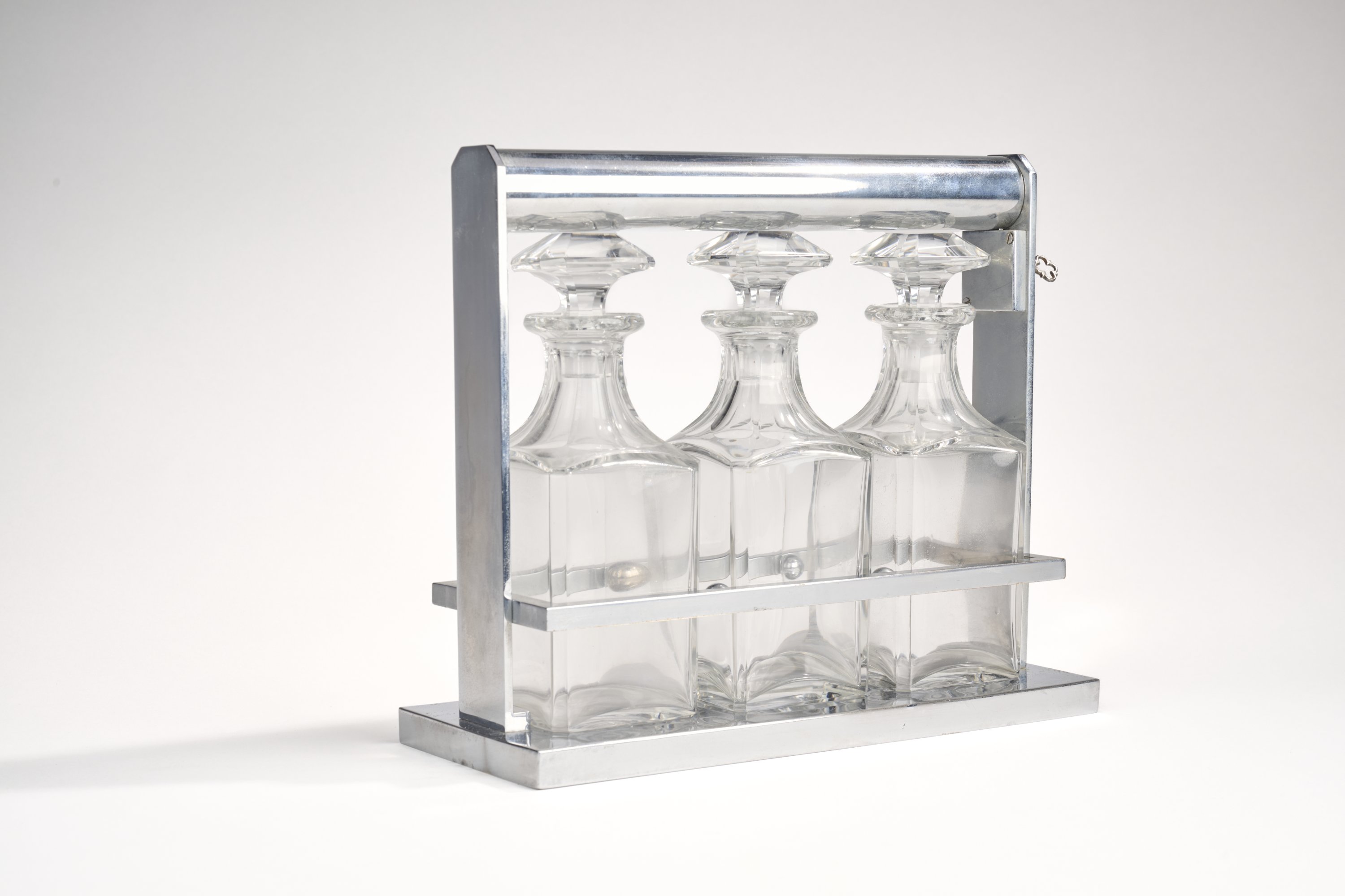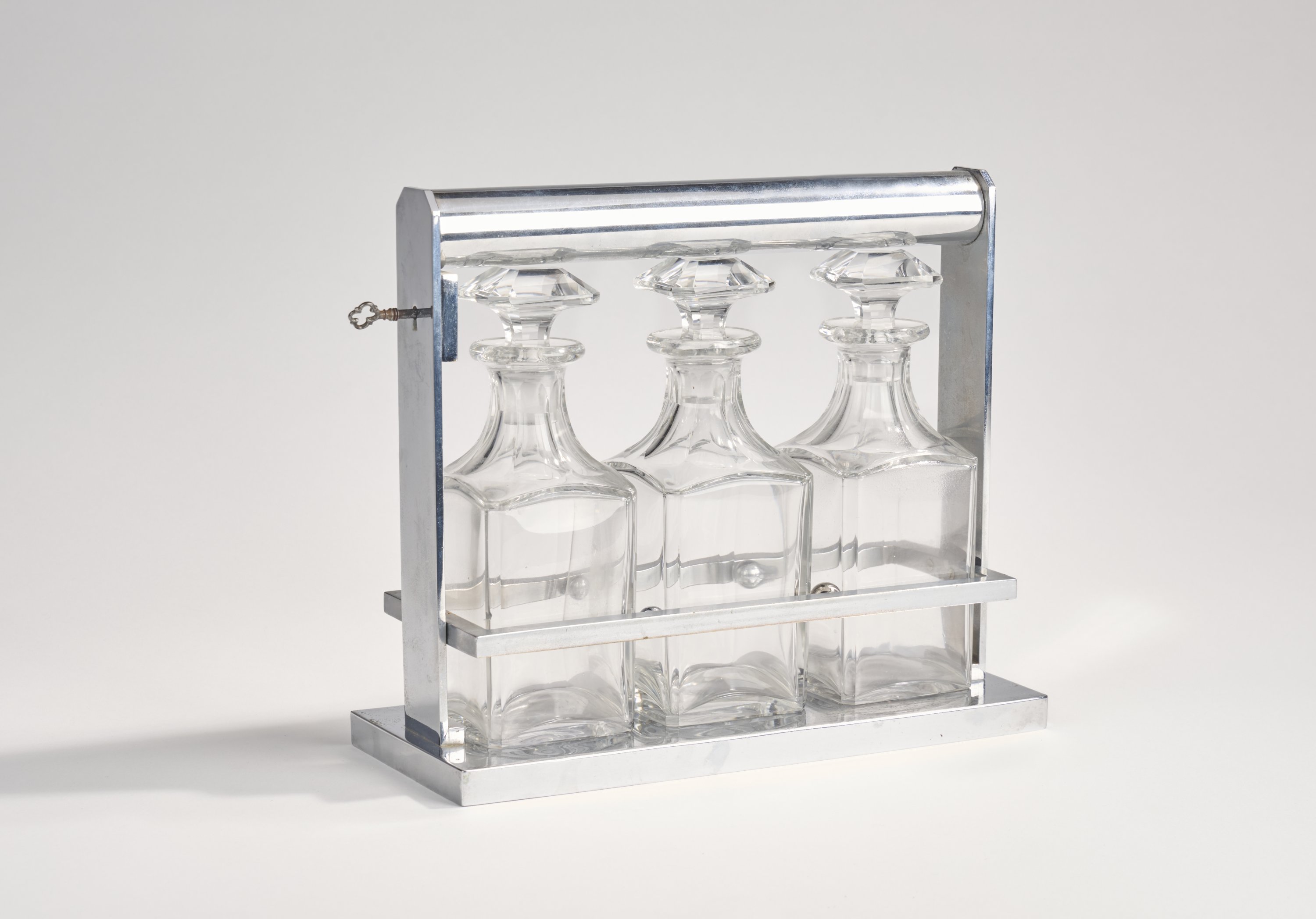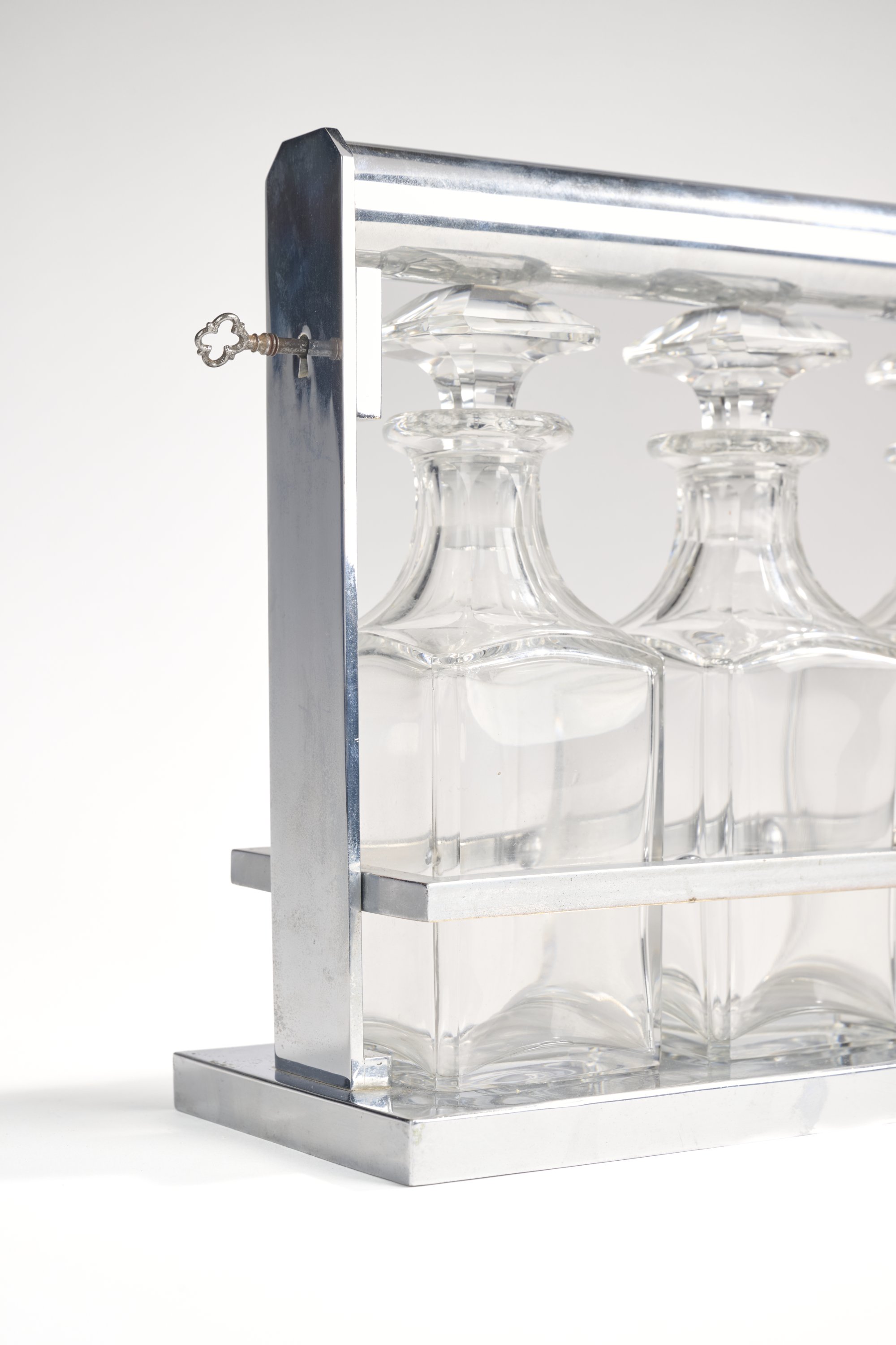 en métal chromé. La poignée cylindrique rotative se débloquant par l'action d'une une clé. Il accueille trois carafons en cristal taillé.