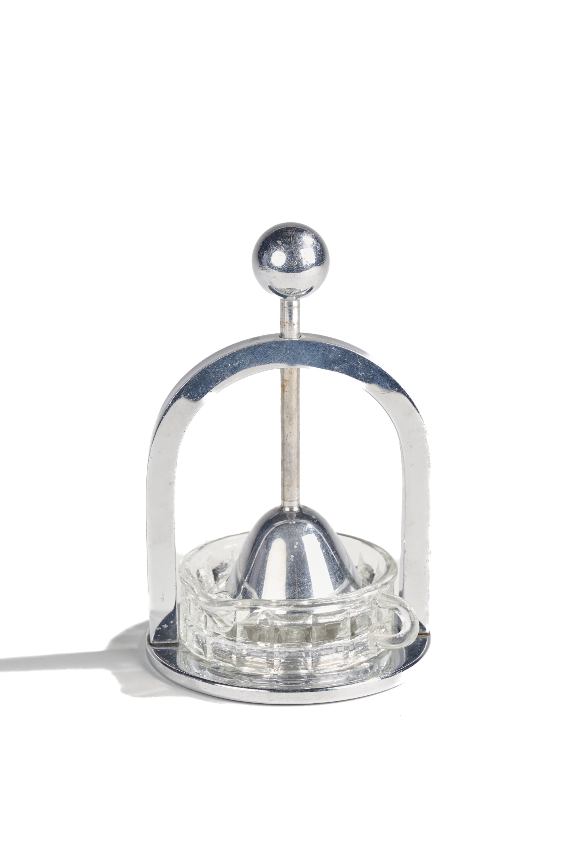 - Le presse agrume coiffé d'une prise en boule entourée d'un support en arc de cercle terminé par une base circulaire. Le réceptacle en verre. Haut. 18,5 cm.
