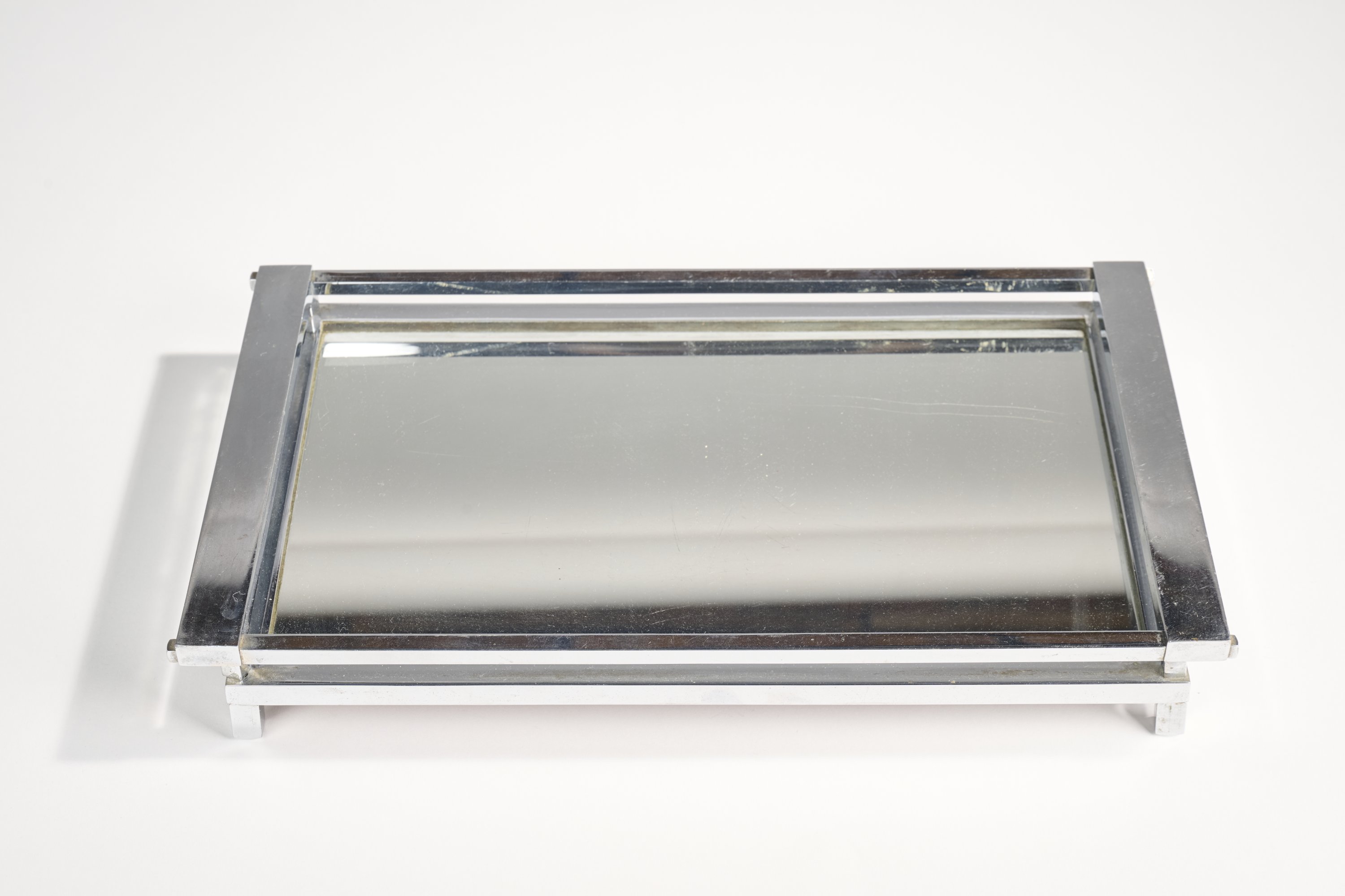 - Le plateau de service rectangulaire en métal chromé et fond ceint d'un miroir. Long. 41 cm (petites rayures).