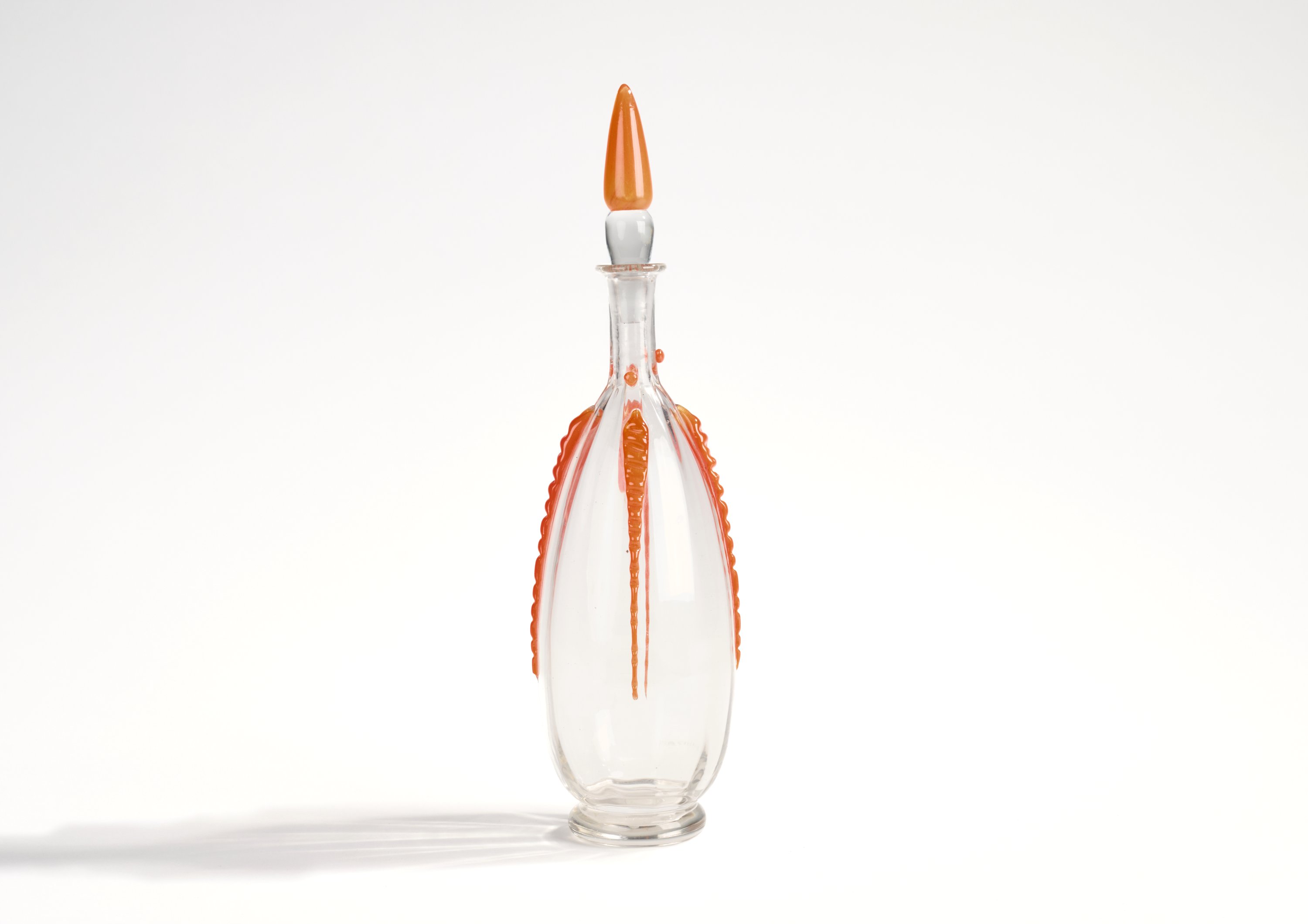 Verre blanc et verre orangé rapporté à chaud de filets et perles. Bouchon en verre orangé.