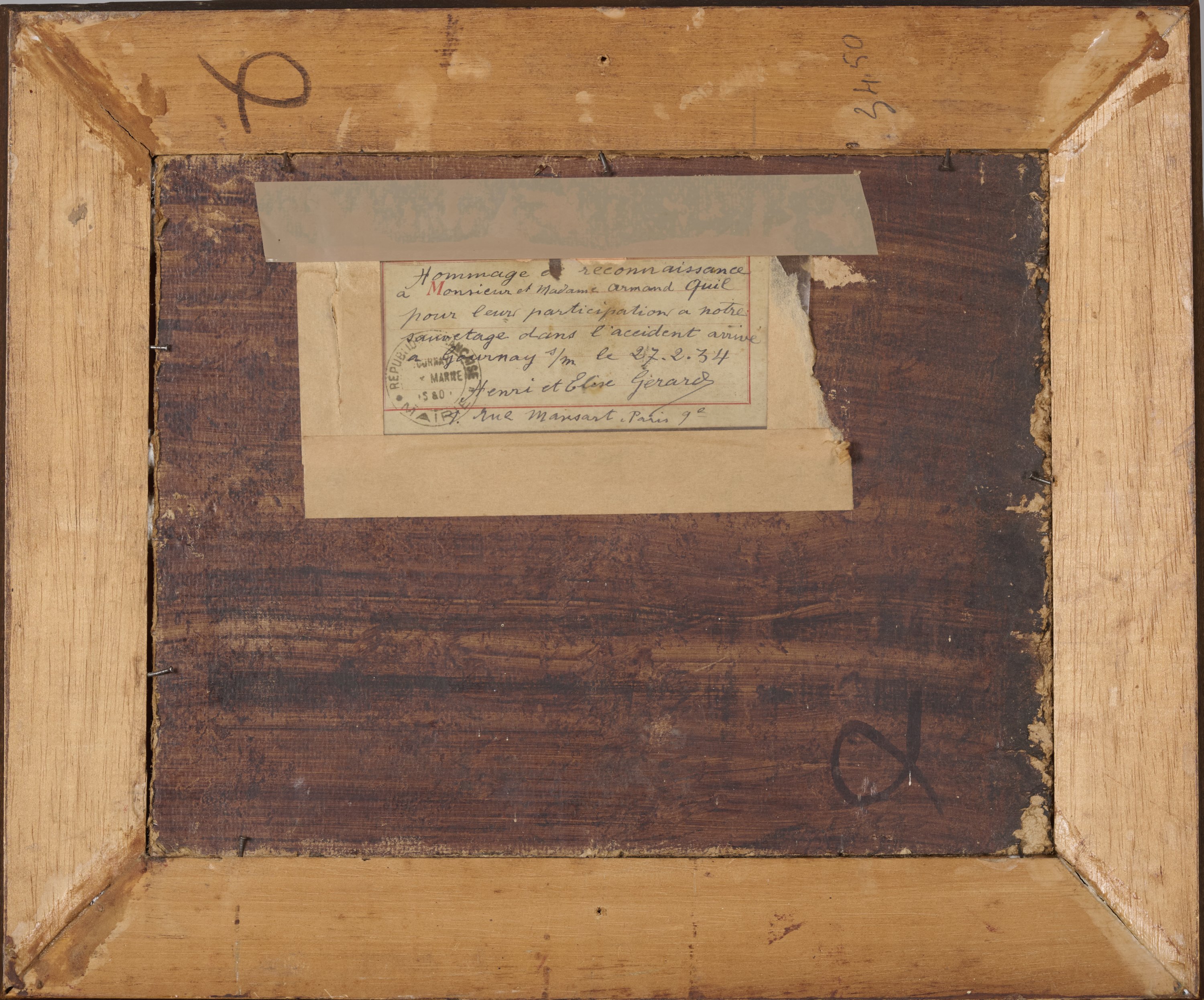 Signé en bas à gauche. Au dos, envoi sur papier "Hommage et reconnaissance / à Monsieur et Madame Armand Quil / pour leur participation a notre sauvetage dans l'accident arrivé à Gournay s/m le 27.2.34 / Henri et Elise Gerard /1. rue Mansart, Paris 9e".