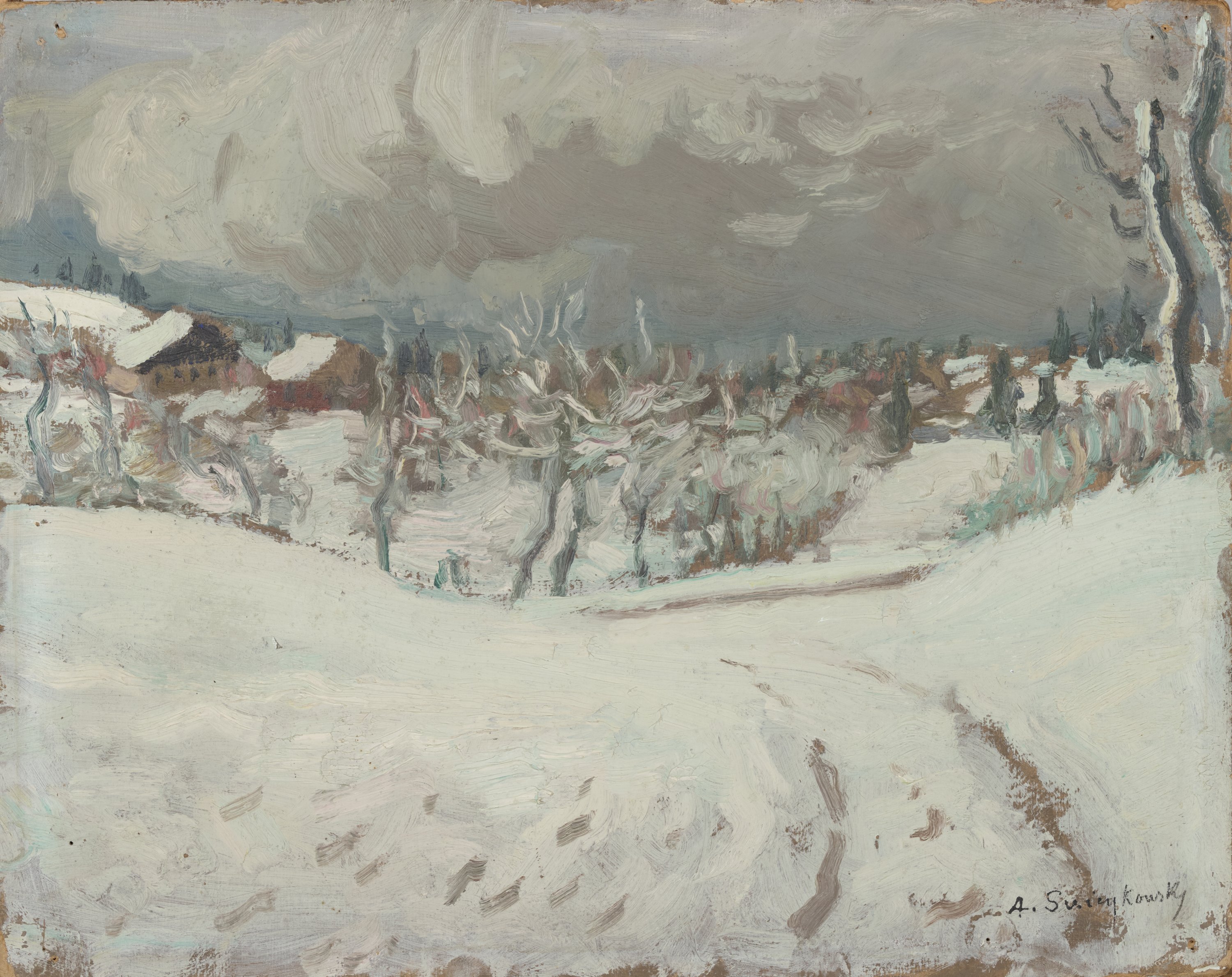 Né à Paris d'un père russo-polonais et d'une mère belge, Alfred Swieykowski étudie dans l'atelier de Fernand Cormon. Néanmoins, il se détache de l'enseignement du maître par sa touche post-impressionniste. Son attrait pour les paysages en général, et les vues enneigées en particulier, résulte notamment de séjours en Savoie qu'il effectue avec ses parents à Maraîches, dans la région d'Evian. Il ne cesse de représenter ces paysages ainsi que des vues de Ferrière-sur-Risle sous la neige (voir "Alfred Swieykowki. Naissance d'une collection", cat.exp., Chatou, Musée Fournaise, 2011).