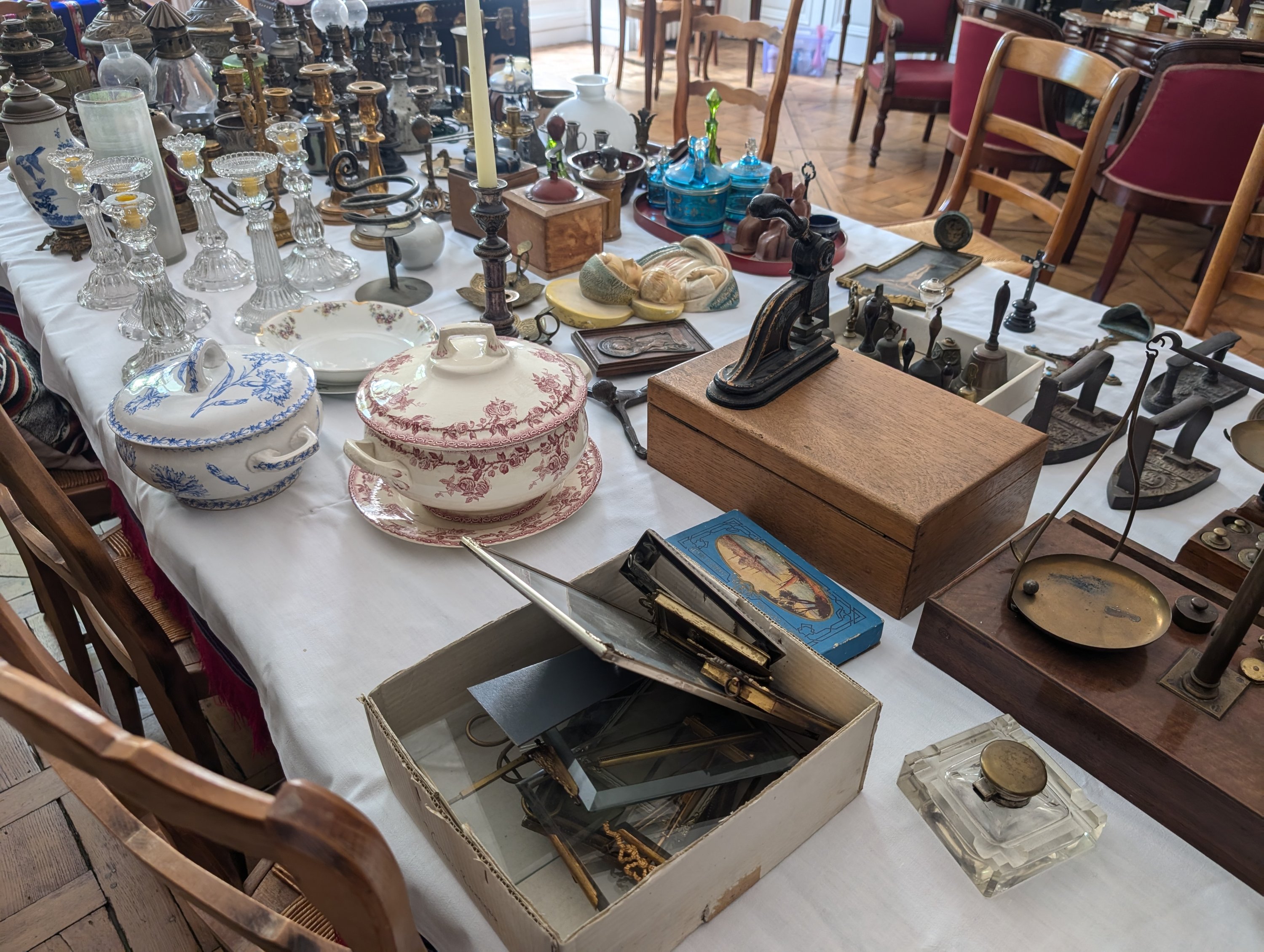 Contenu des greniers de la maison mère de la congrégation des soeurs du Bon Secours: vases d'autel, crucifix, lampes à pétrole, cadres, machine à tuyauter les coiffes, etc.