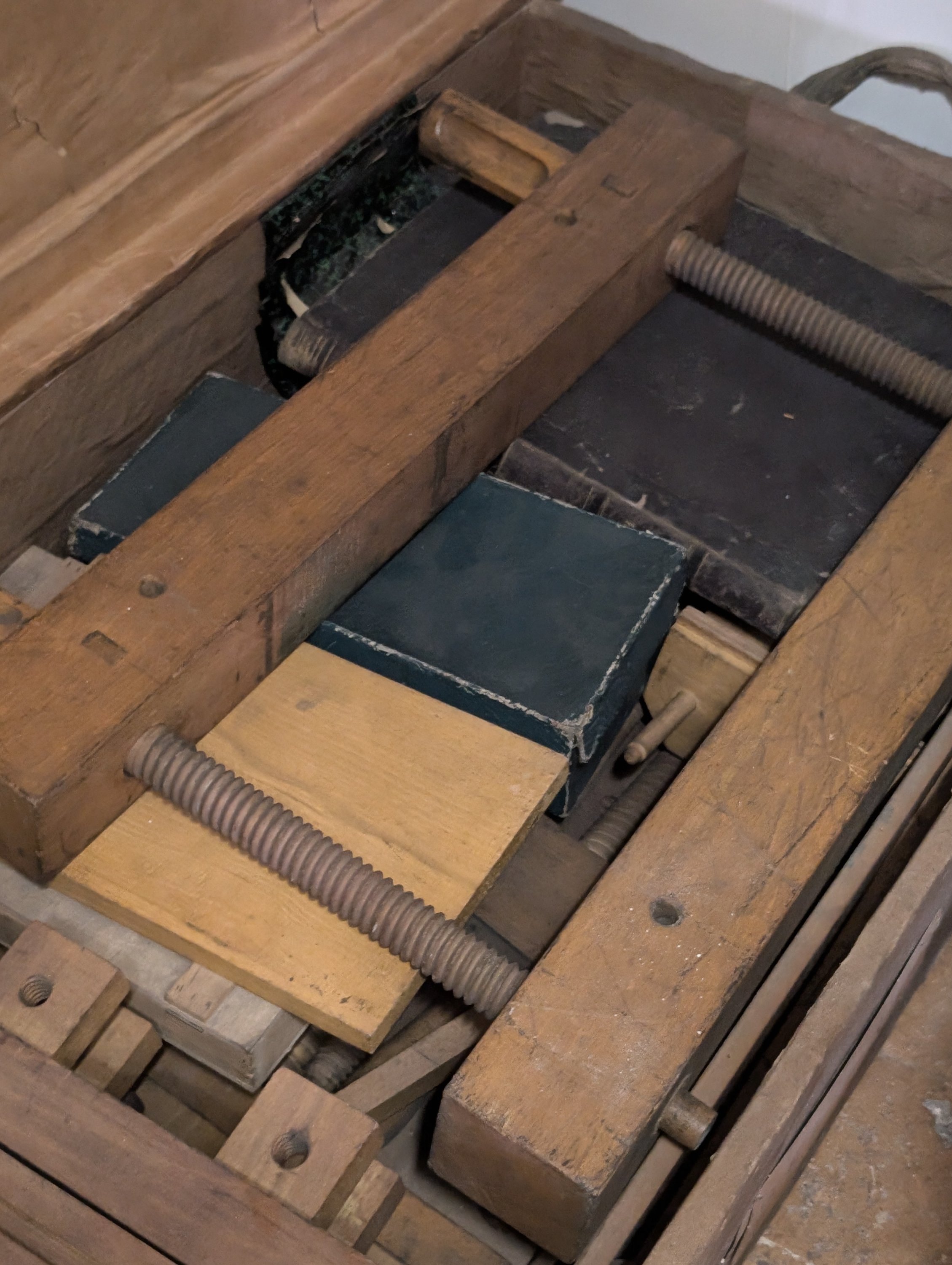 Contenu des greniers de la maison mère de la congrégation des soeurs du Bon Secours: vases d'autel, crucifix, lampes à pétrole, cadres, machine à tuyauter les coiffes, etc.