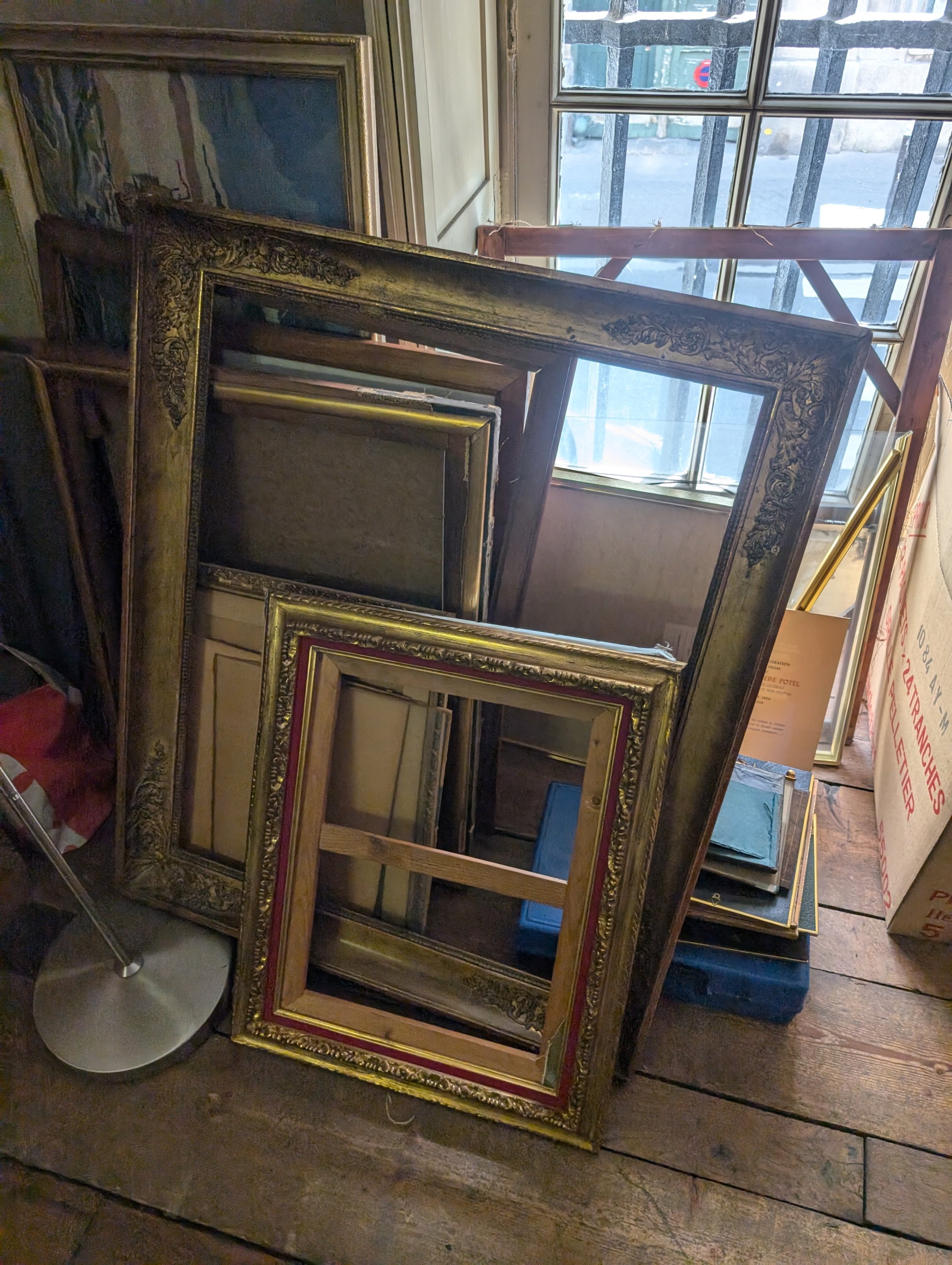 Contenu des greniers de la maison mère de la congrégation des soeurs du Bon Secours: vases d'autel, crucifix, lampes à pétrole, cadres, machine à tuyauter les coiffes, etc.