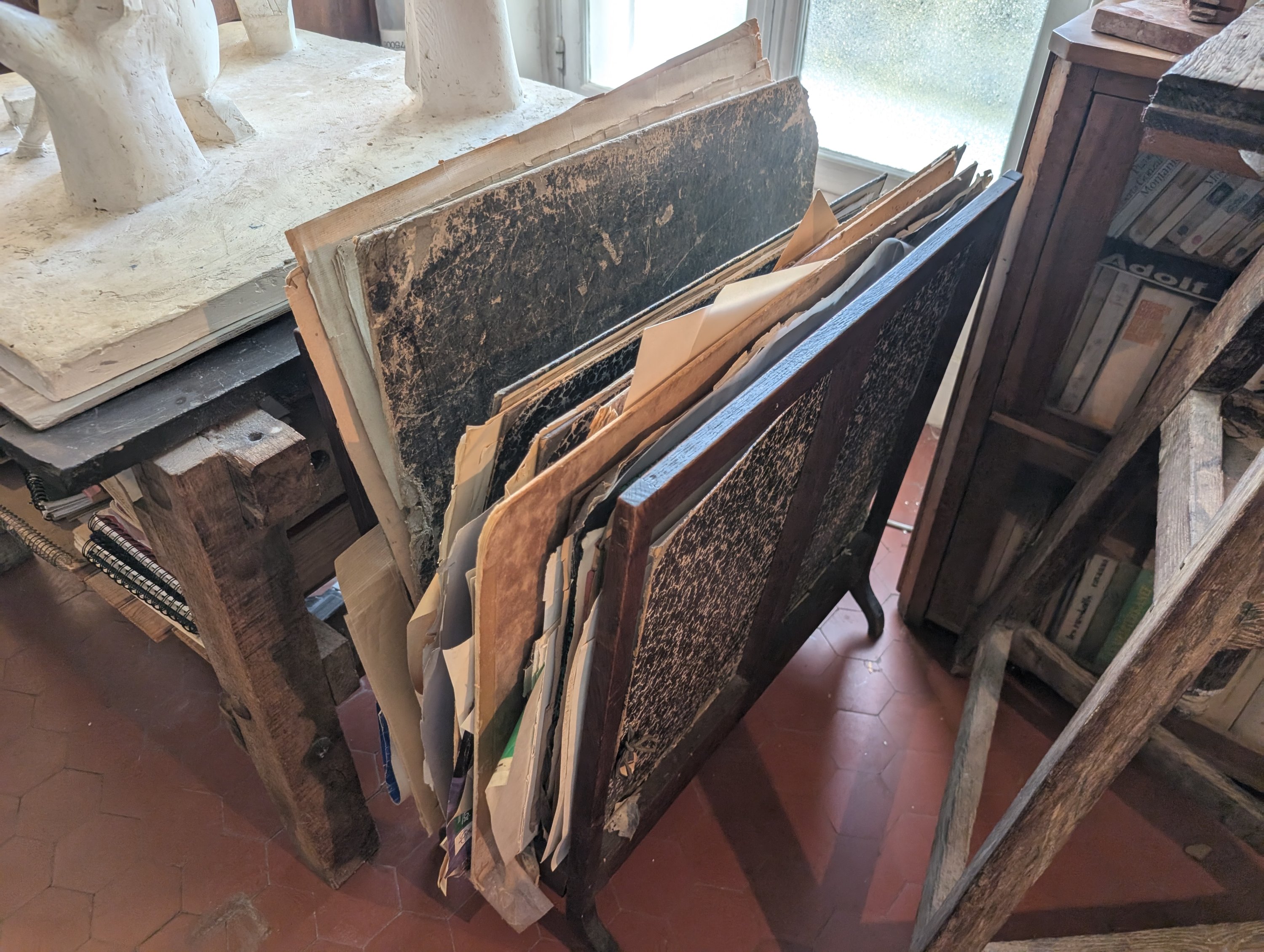 Affiches, dessins, réunion d'œuvres sur papier dans des pochettes en carton.