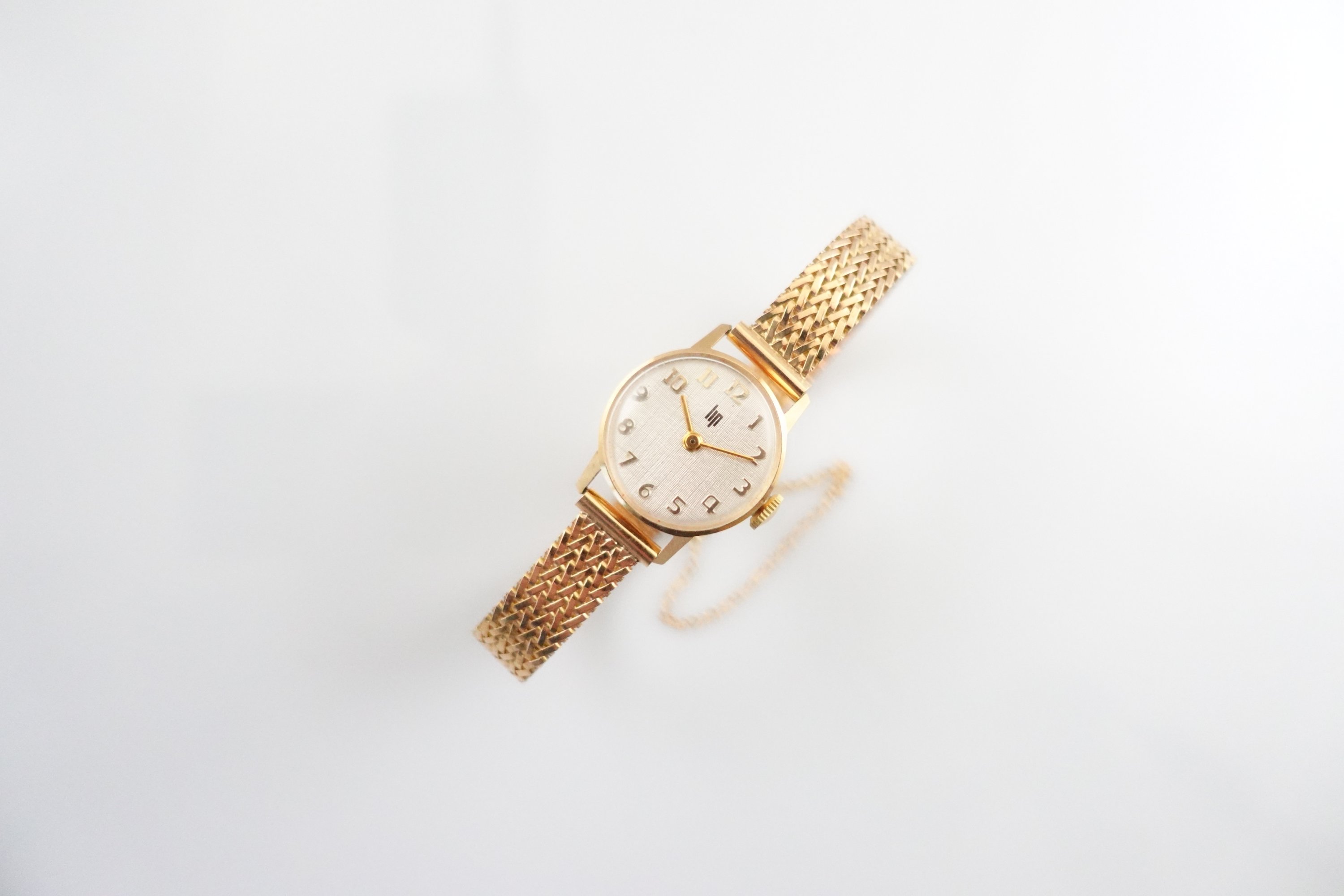 en or jaune 750 millièmes à cadran guilloché indiquant les heures en chiffres arabes. Boîtier numéroté "15918". Le bracelet en or à mailles plates avec boucle déployante et chaînette de sécurité.