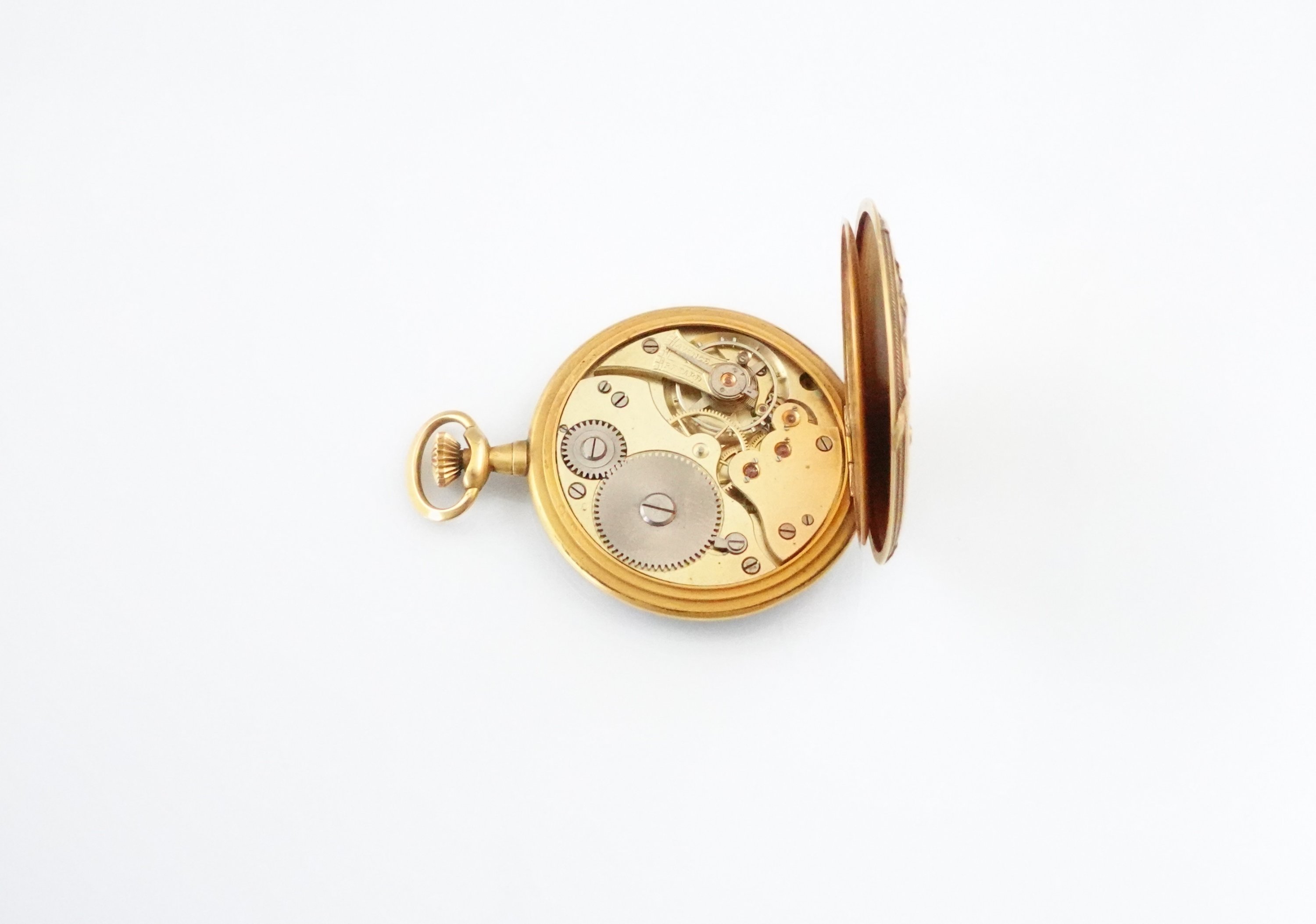 en or jaune 750 millièmes. Cadran signé "Movado sureté" indiquant les heures en chiffres arabes. Petite trotteuse à 6 heures. Le cache poussière intérieur en or jaune 750 millièmes marqué "Grand diplome d'honneur / fabrique Movado / Expositions universelles Paris 1900 Liège 1905". Numérotée 708351".
