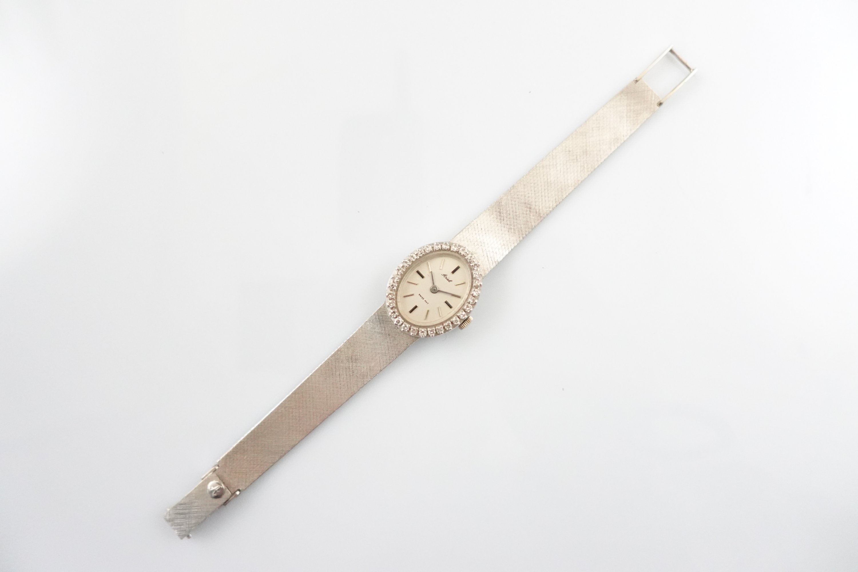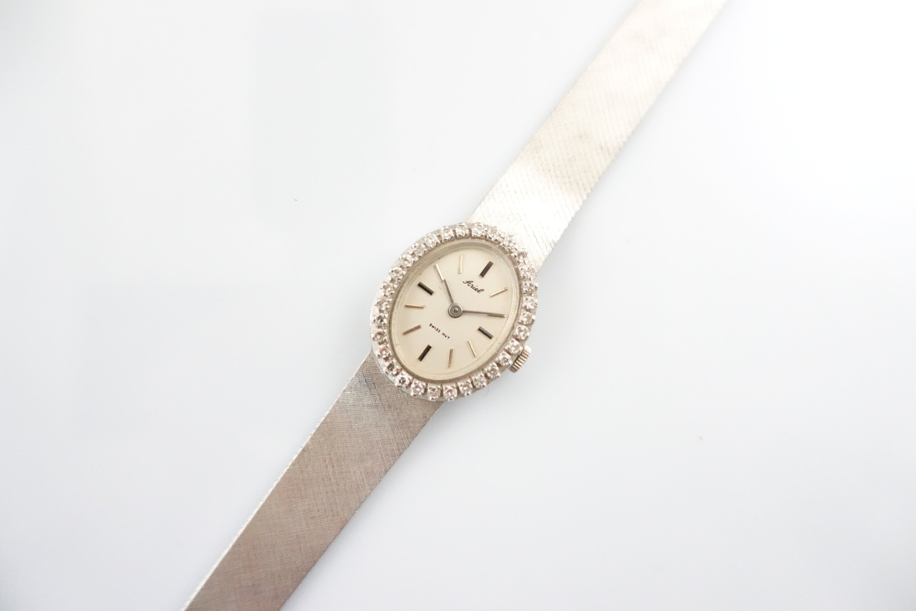 en or gris 750 millièmes. Le cadran à fond crème signé "Ariel Swis Mvt" dans un entourage de 30 diamants. Remontoir à trois heures. Bracelet souple en or gris 750 millièmes avec boucle déployante et boucle de sécurité. Mouvement mécanique