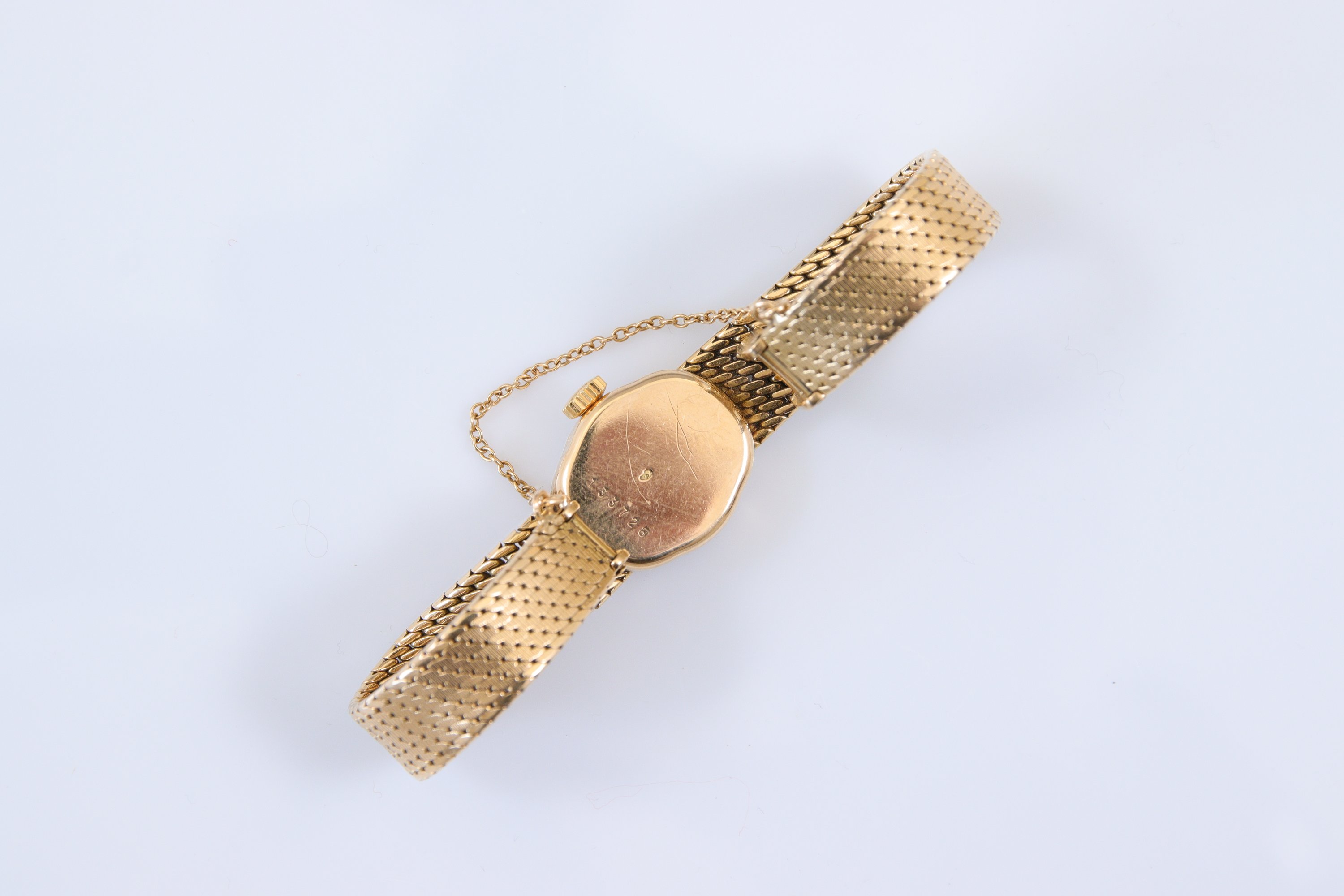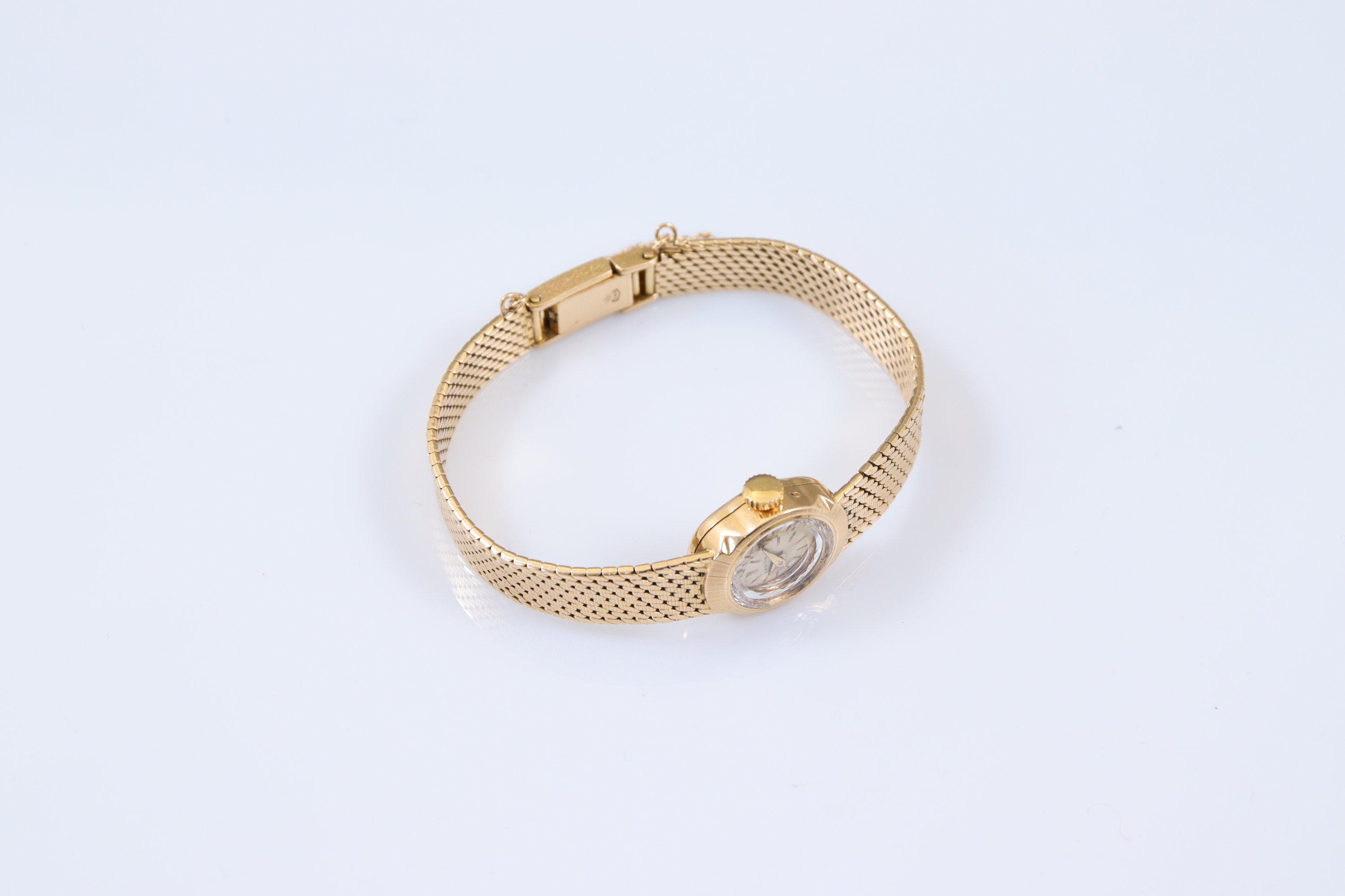 en or jaune 750 millièmes. Cadran champagne à index bâtonnets. Bracelet articulé avec boucle déployante et chaînette de sécurité.