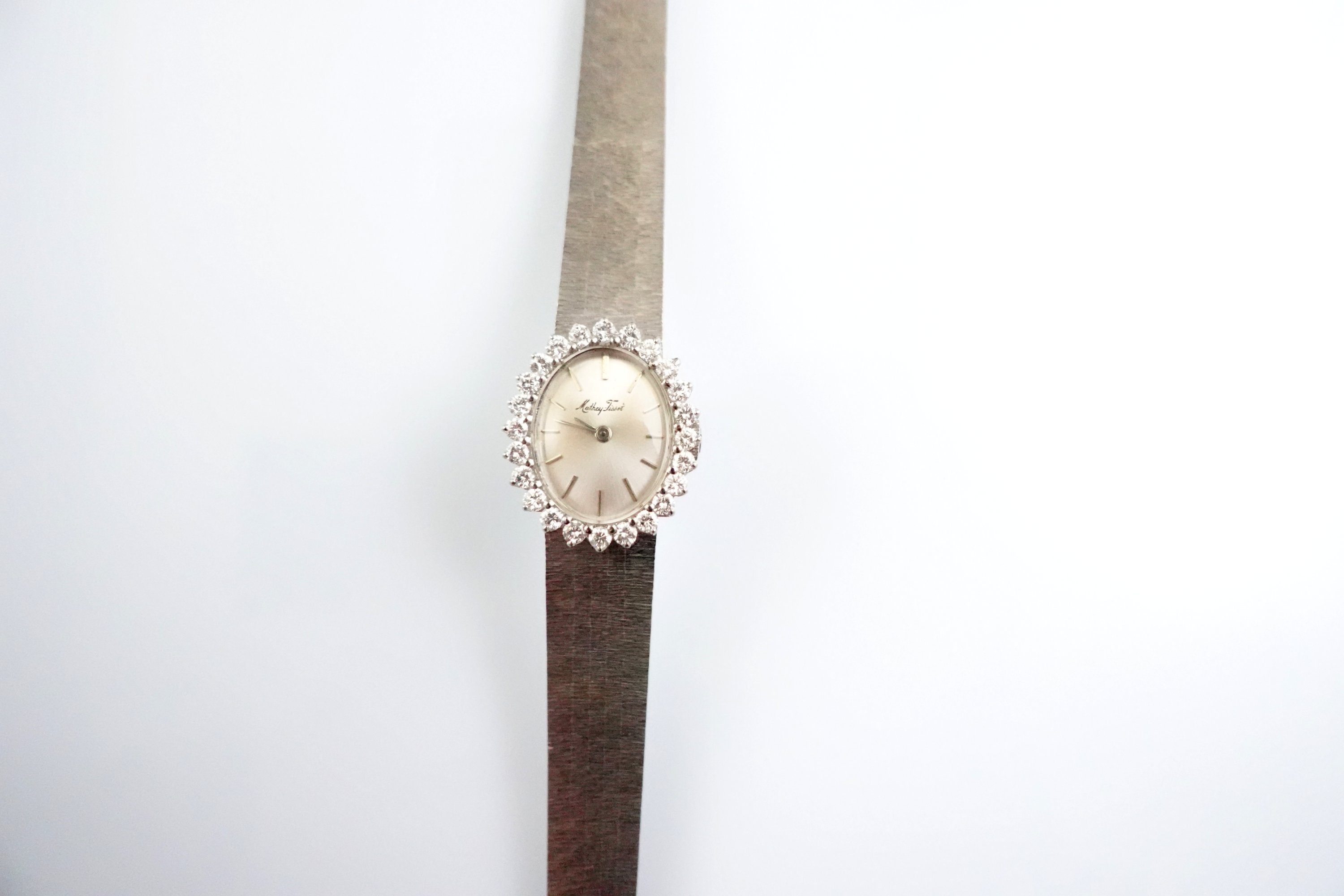 en or gris 750 millièmes, la lunette ornée de 27 diamants de taille brillant. Le cadran de forme ovale, signé, indique les heures par des bâtonnets.
