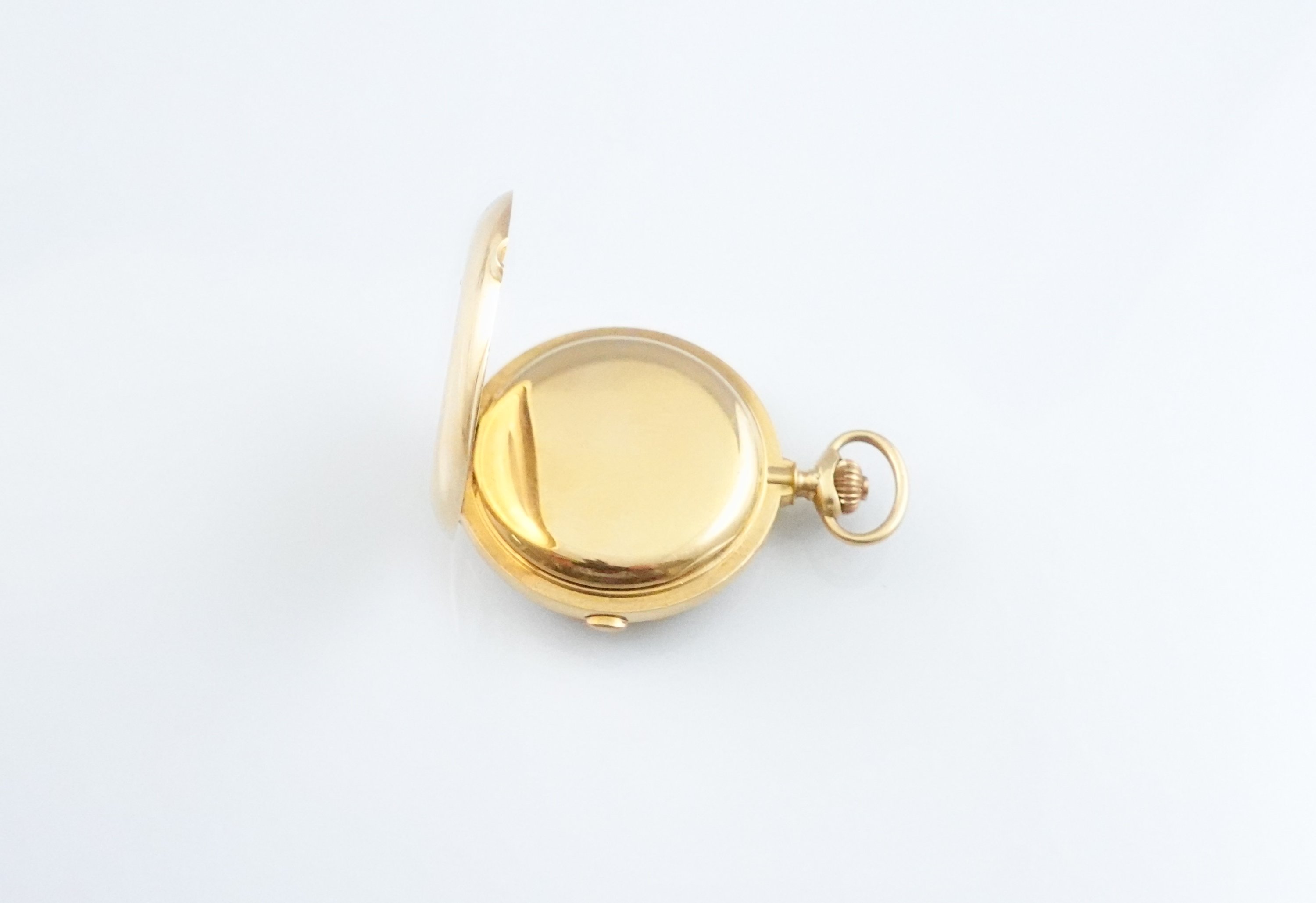 en or jaune 750 millièmes. Trois cadrans émaillés (petit accident, manque le verre). Remontoir à trois heures, bouton du chronomètre à midi. Boîtier, cache-poussière en or et mécanisme numérotés 64109.