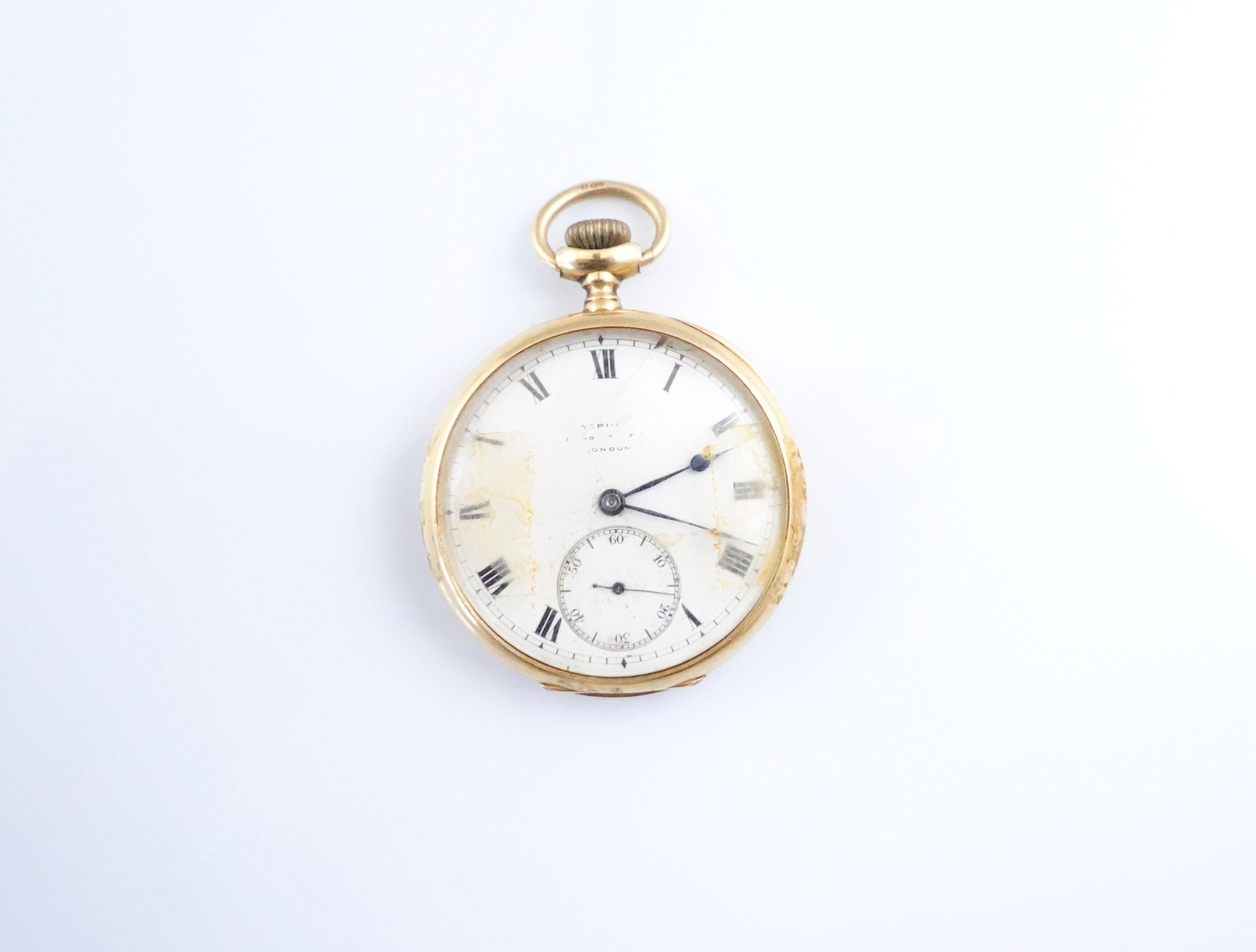en or jaune 750 millièmes, à cadran émaillé blanc indiquant les heures par chiffres romains, les minutes par un chemin de fer. Sans cache-poussière intérieur. Numérotée "104103".