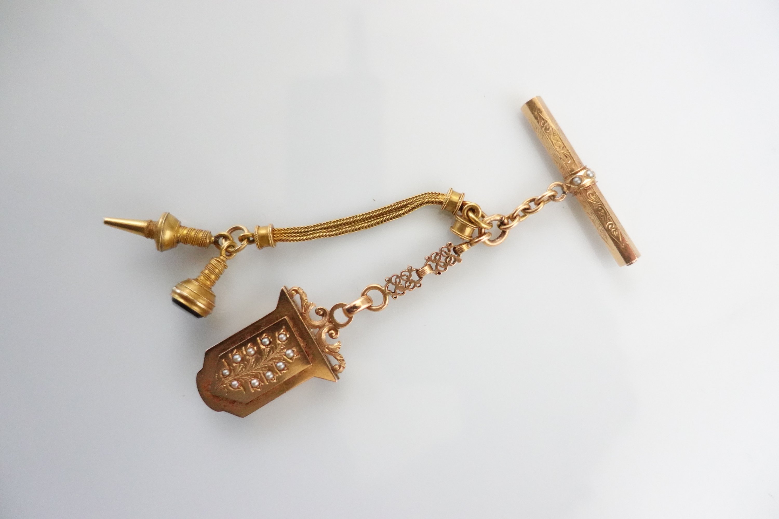 en or jaune 750 millièmes composée d'un porte-photo aux petites perles monogrammé "AD" et son verre, un stylet et une chaîne.