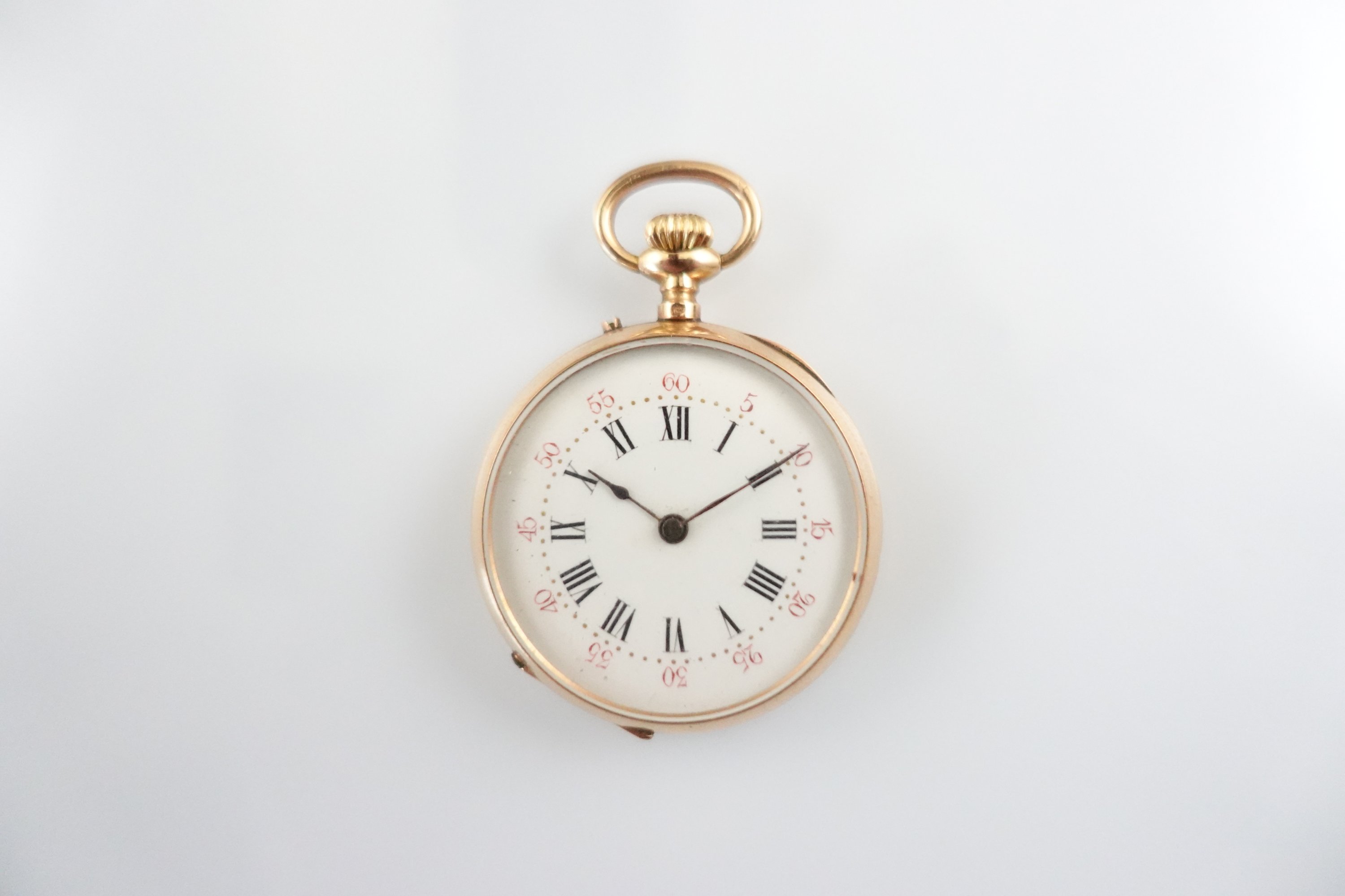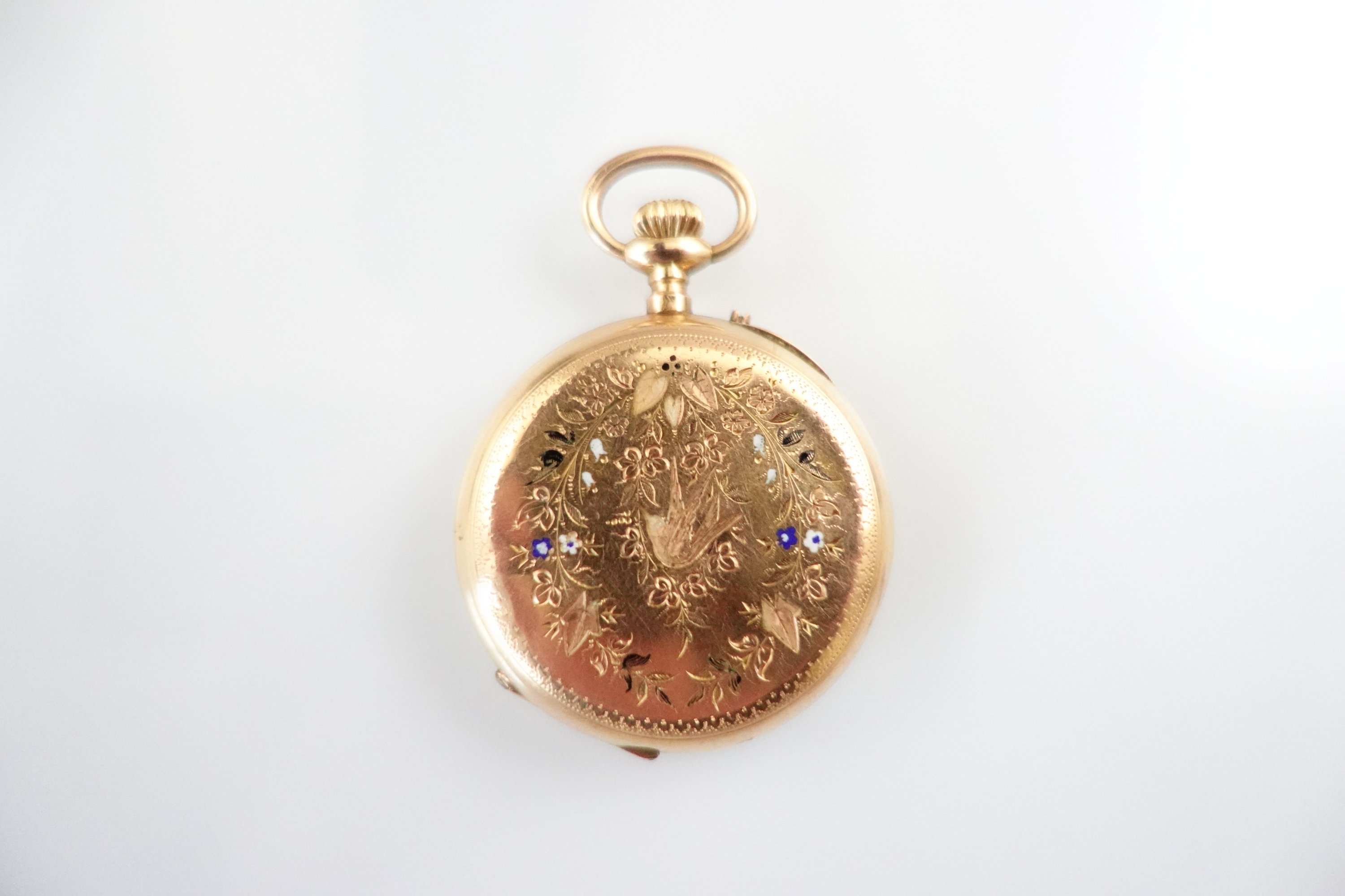en or jaune 750 millièmes. Le cadran émaillé blanc indiquant les heures en chiffres romains, les minutes par des pointillés et chiffres arabes. Le dos gravé et partiellement émaillé de guirlandes fleuries entourant un oiseau en vol. Cache-poussière en or marqué "cylindre huit rubis".