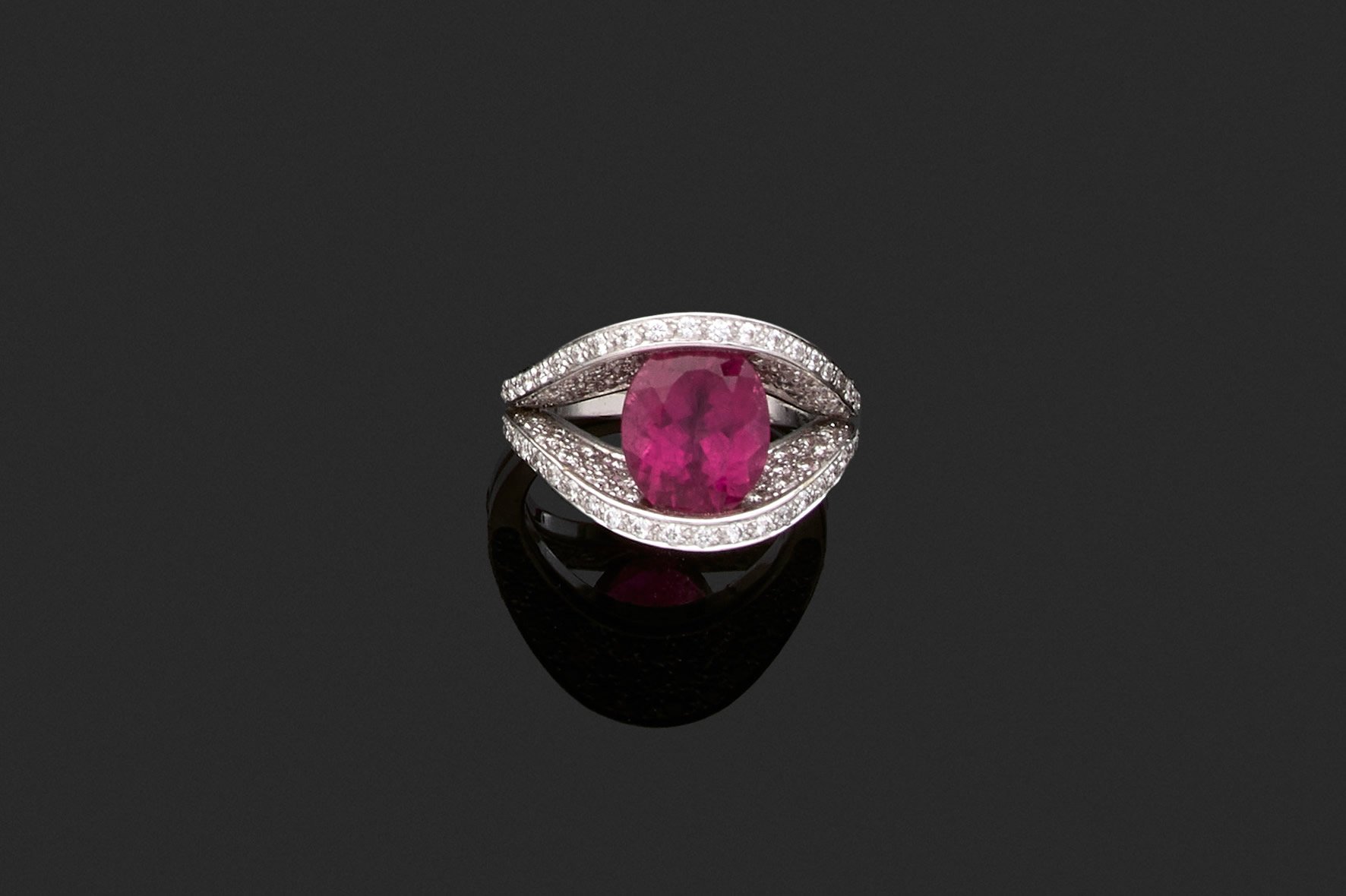 en or gris 750 millièmes, le centre ajouré retenant une tourmaline rose entre deux pavages de diamants ronds de taille brillant.