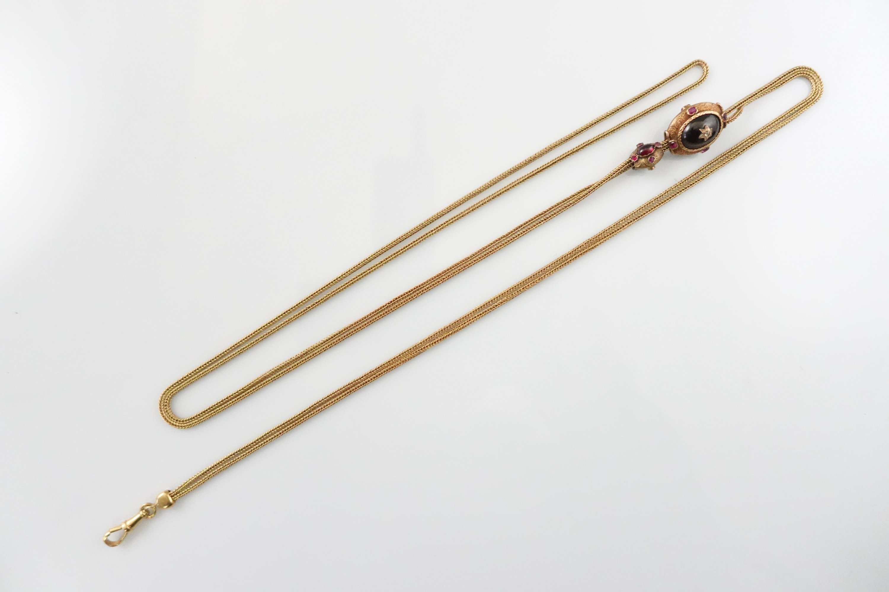 en or jaune 750 millièmes à mailles serpent. Le camée sur pierre est serti de grenats.
